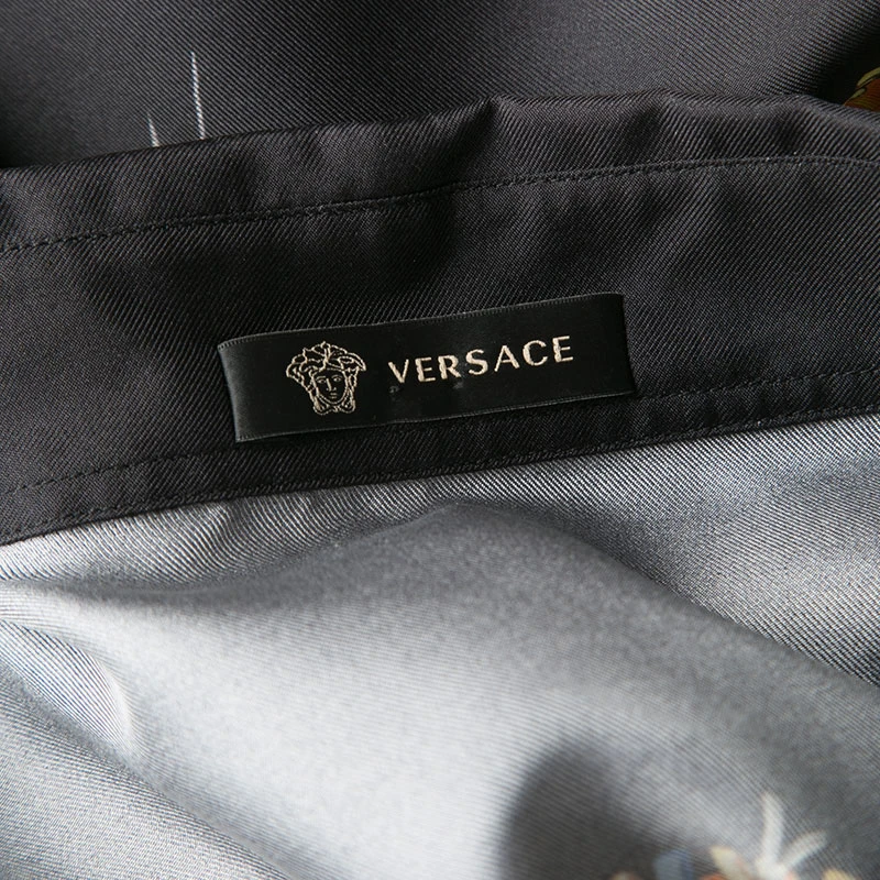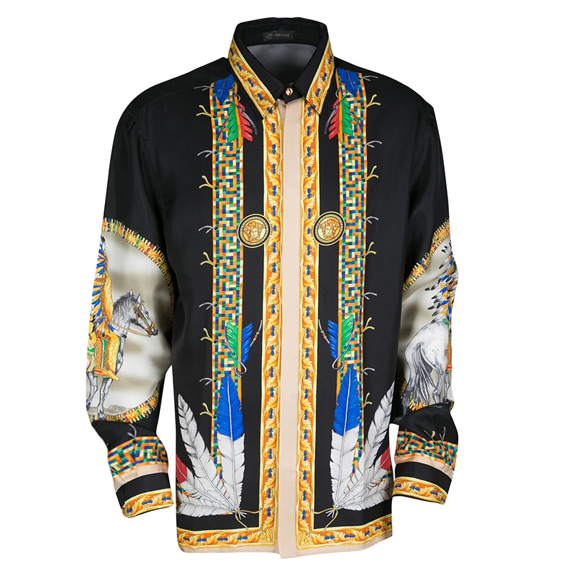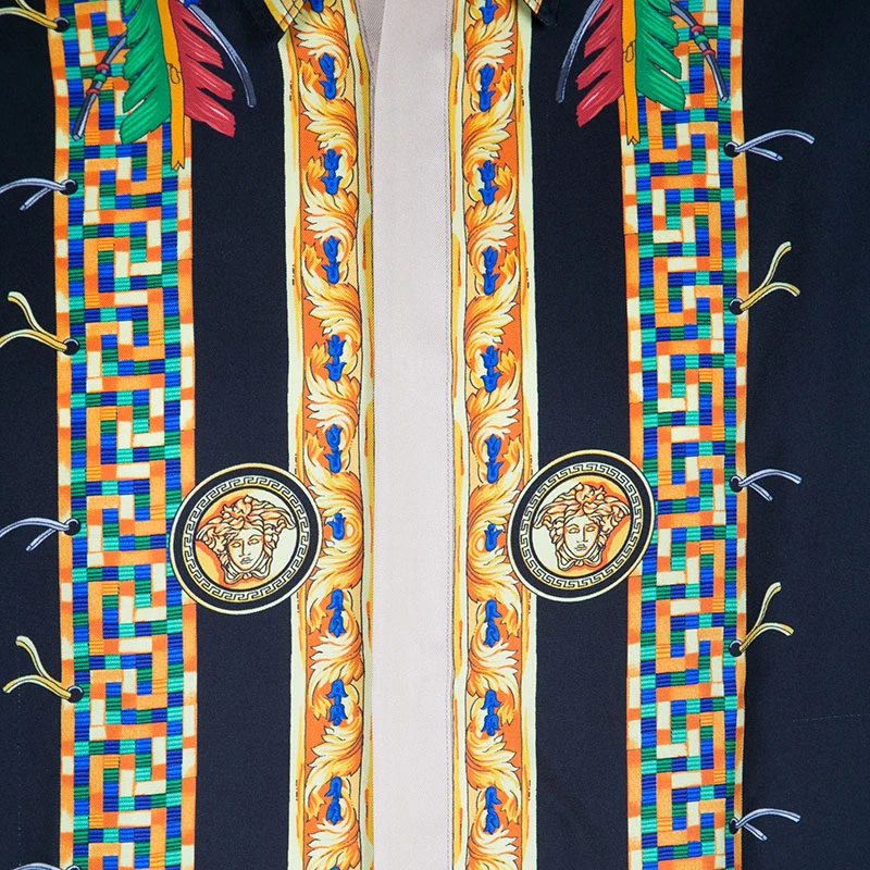 Exuding a vintage feel, this Versace shirt flaunts a native American print that accentuates the black base. The shirt has a classic collar and buttoned closure. Crafted with silk, wear this shirt in a contemporary style with loosely-tailored pants and loafers.