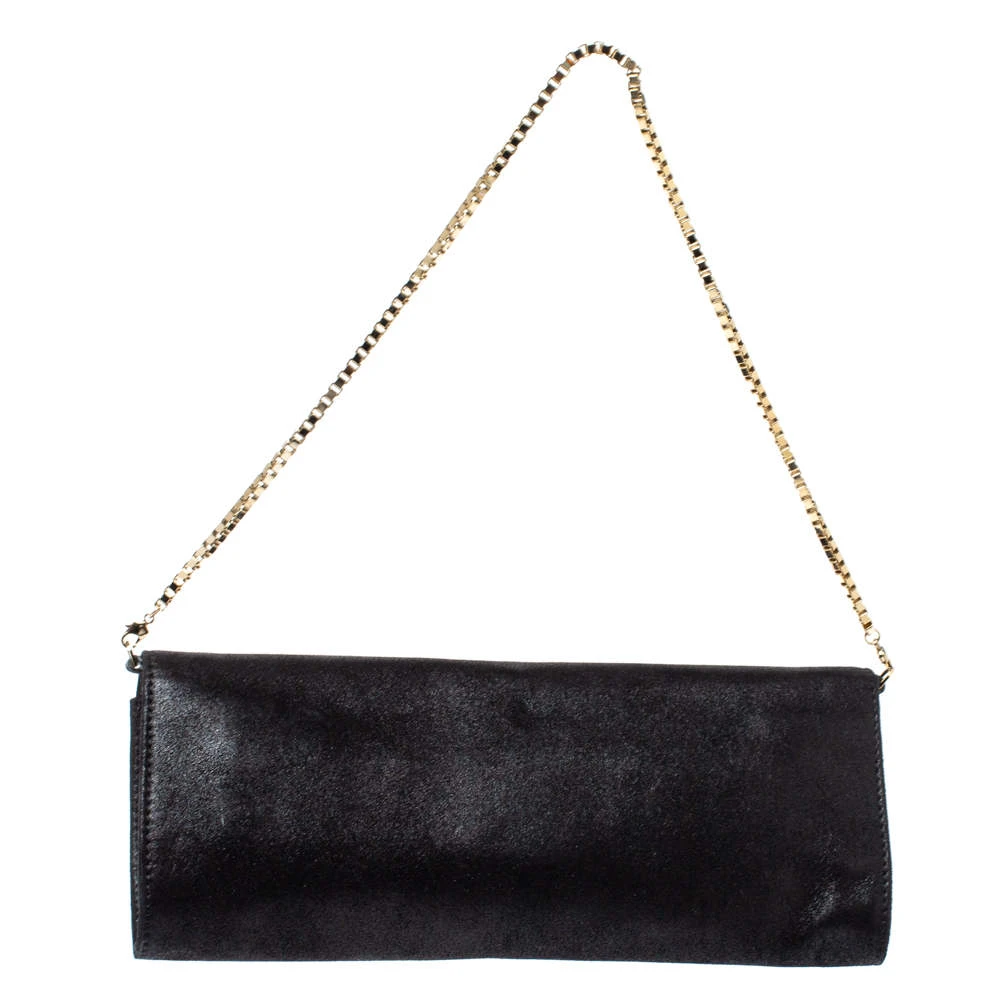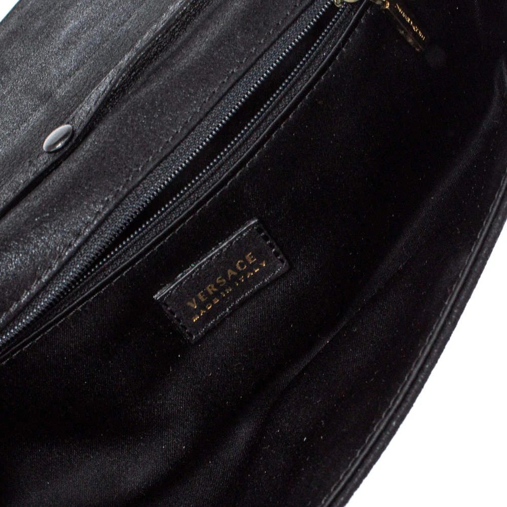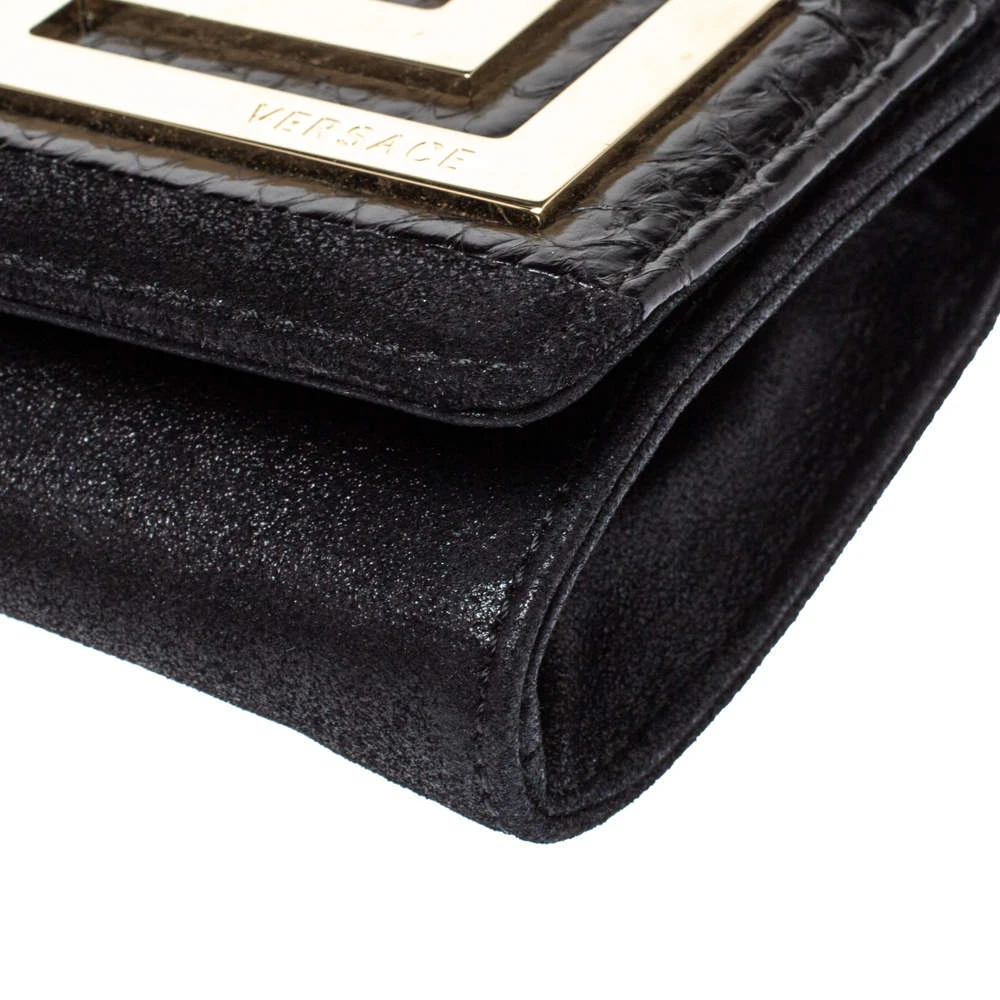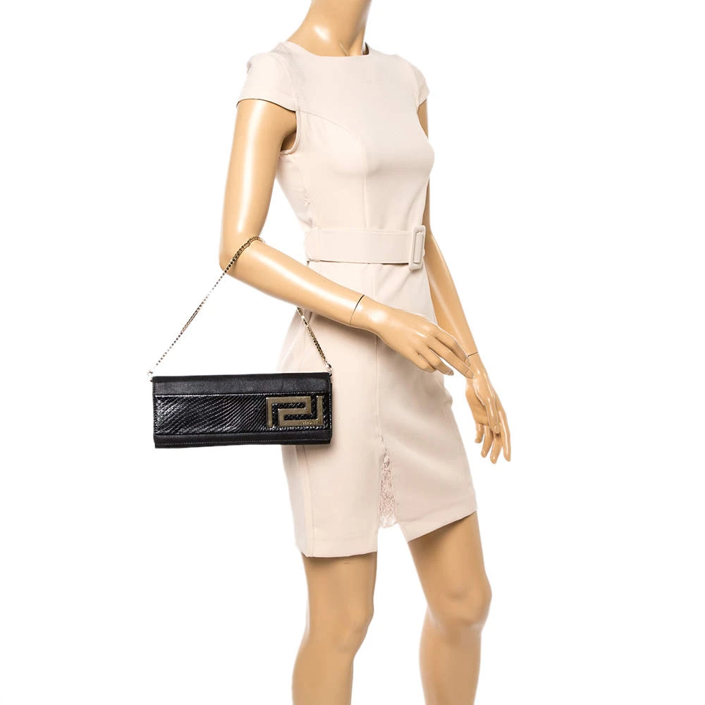 Pick this covetable Versace clutch and make a valuable addition to your closet. The label’s logo in gold-tone hardware sitting on the glossy black base is the petite bag’s winning feature. Made from nubuck and snakeskin, it is equipped with a flap and a chain shoulder strap.
