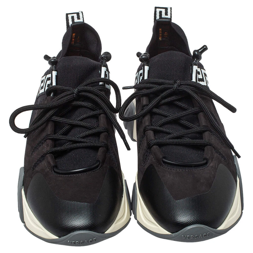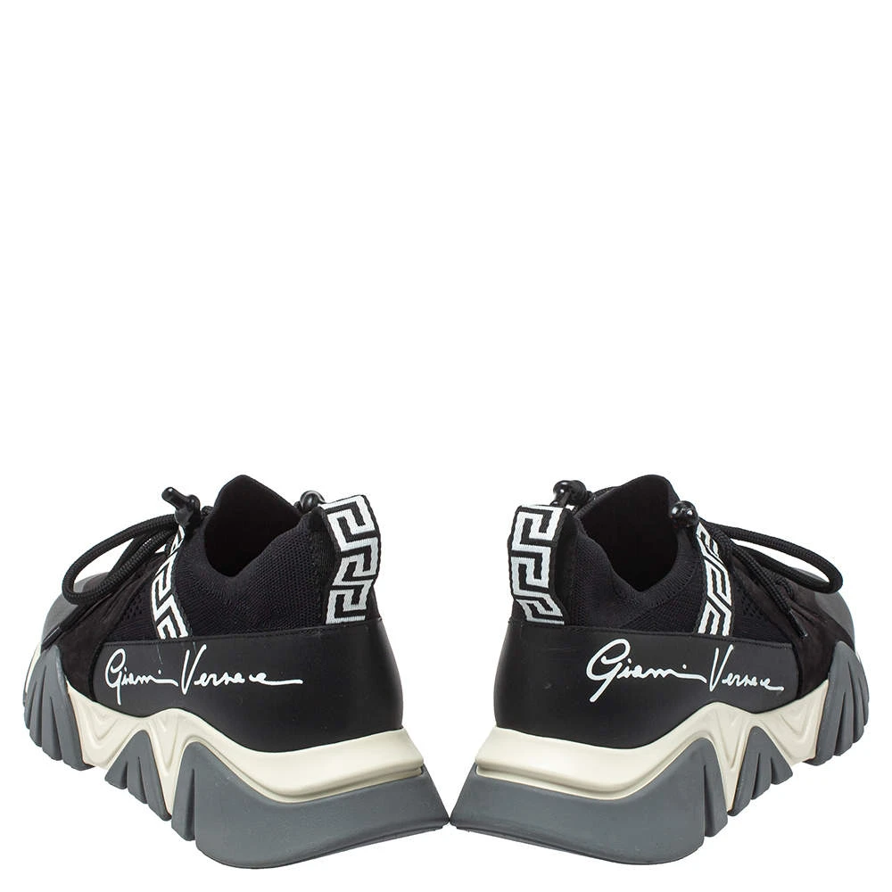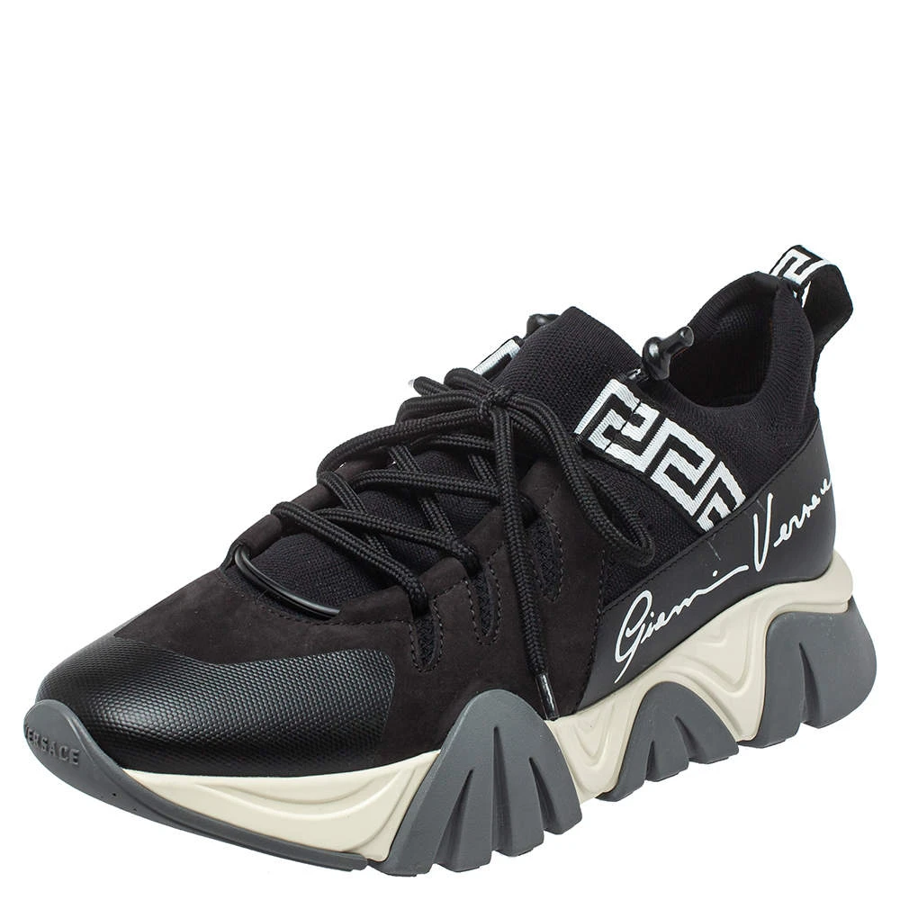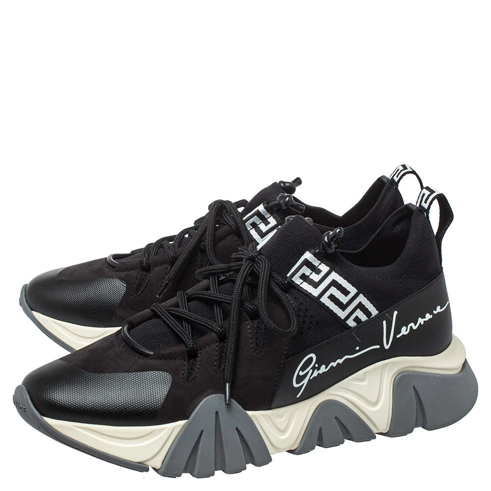 Brand details merged with a statement silhouette bring out the distinct appeal of this Versace Squalo low-top sneaker. The sneakers are formed using knit fabric and leather, secured with lace-ups, and elevated on chunky soles.