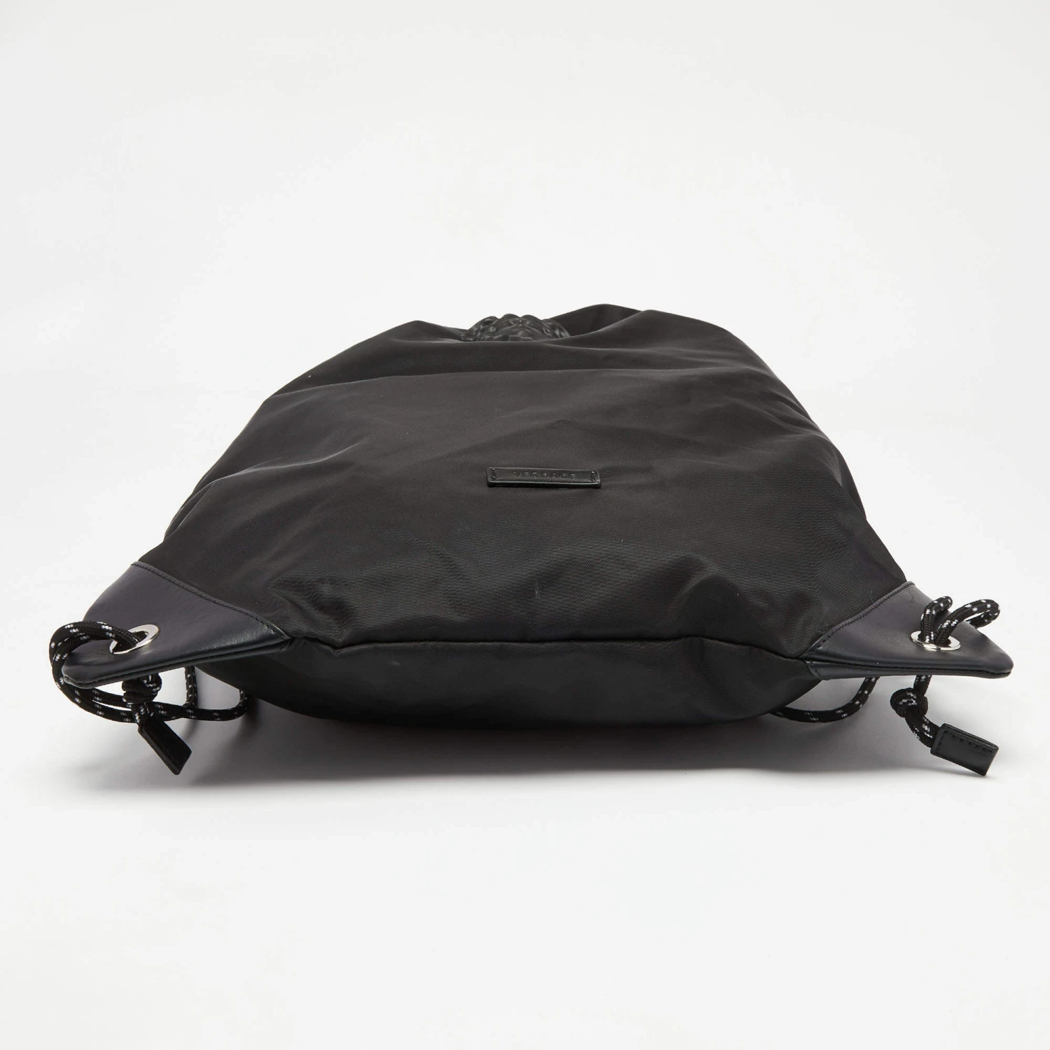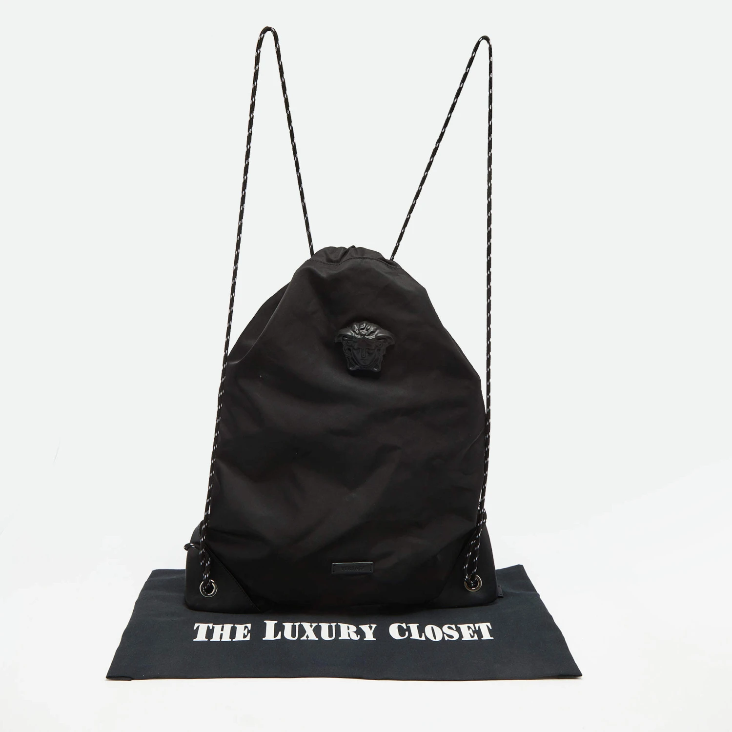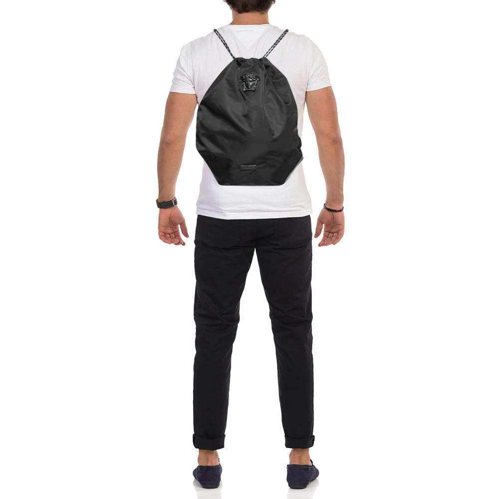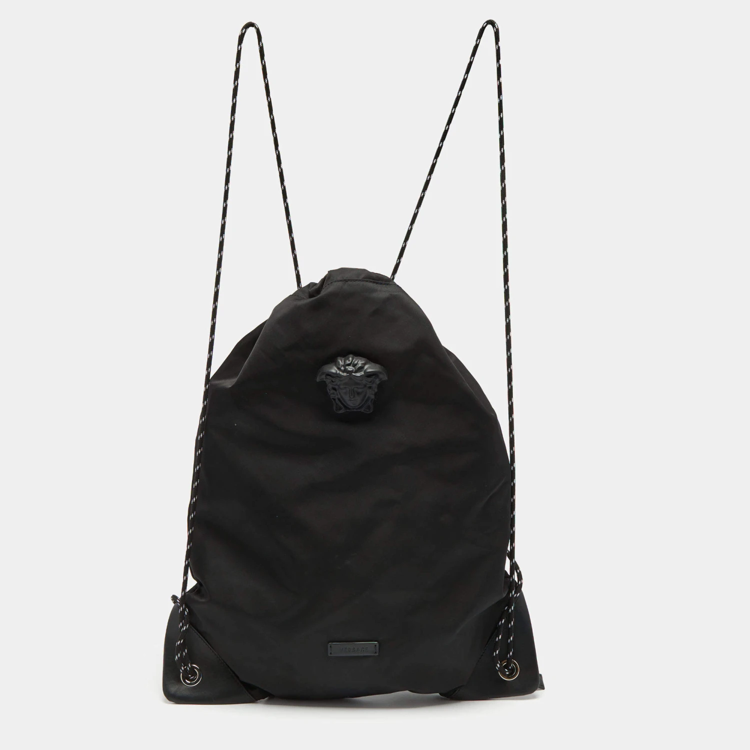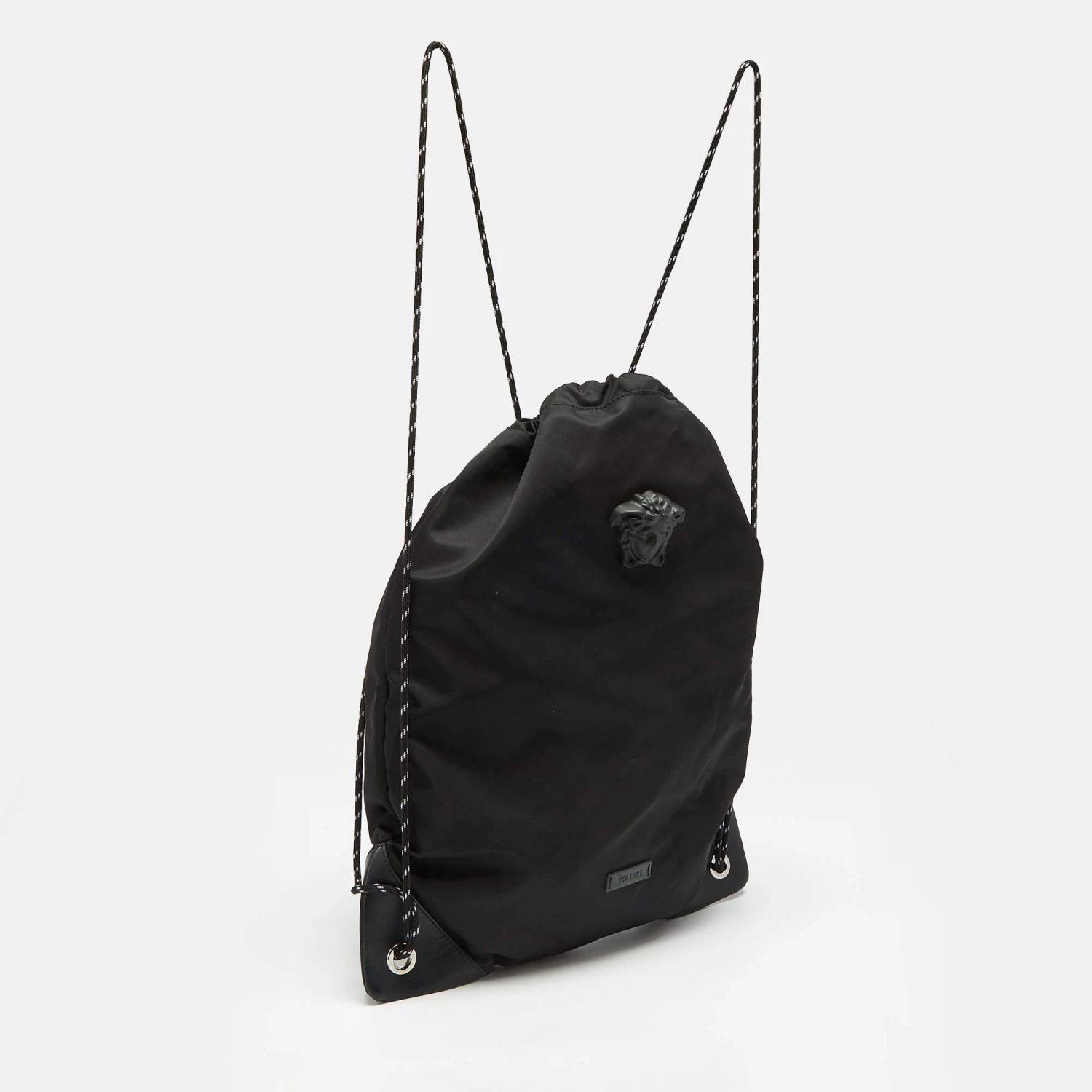 This light backpack by Versace is carefully crafted from black nylon and leather. The drawstring closure reveals a spacious interior that accommodates essentials quite comfortably. Just the right backpack for short trips!