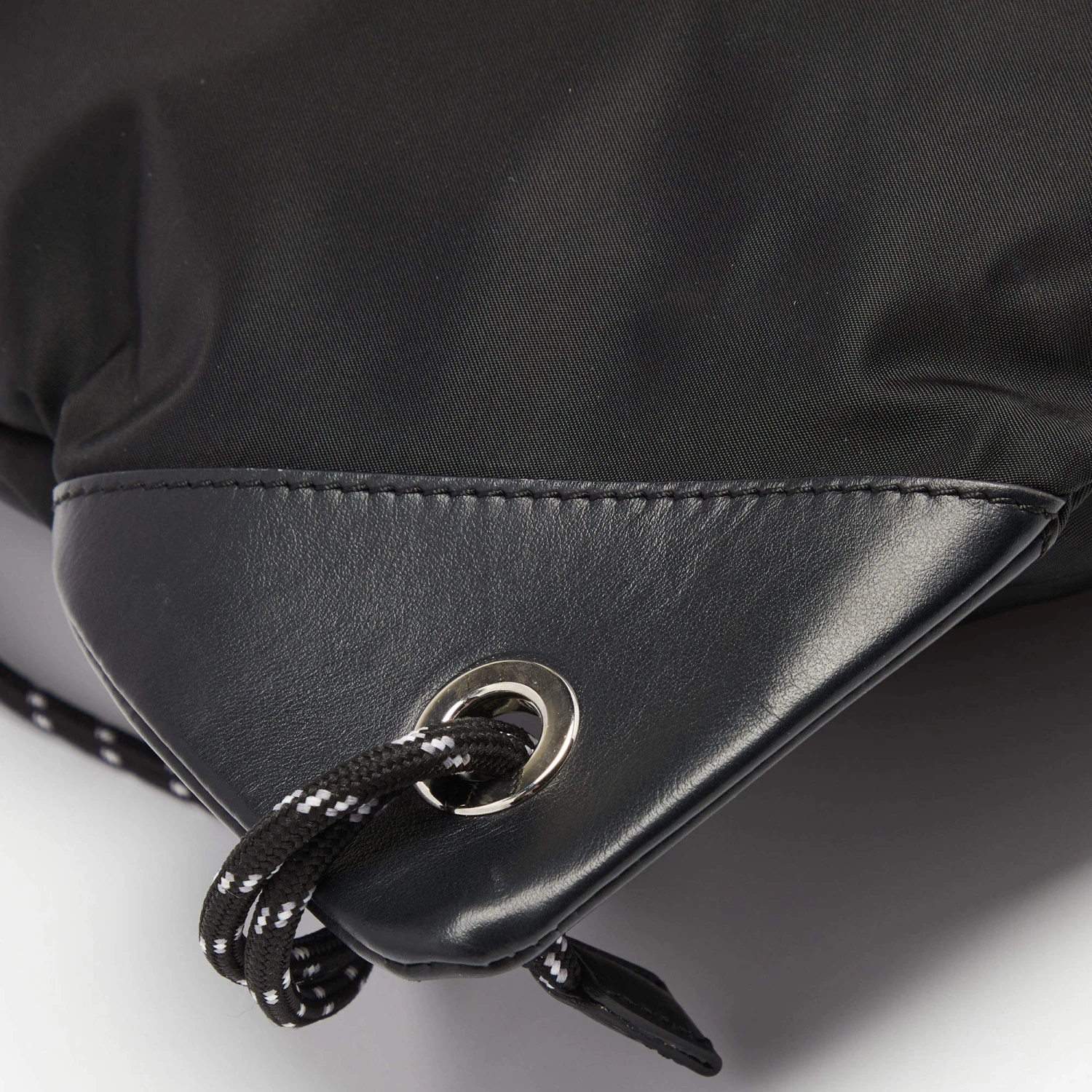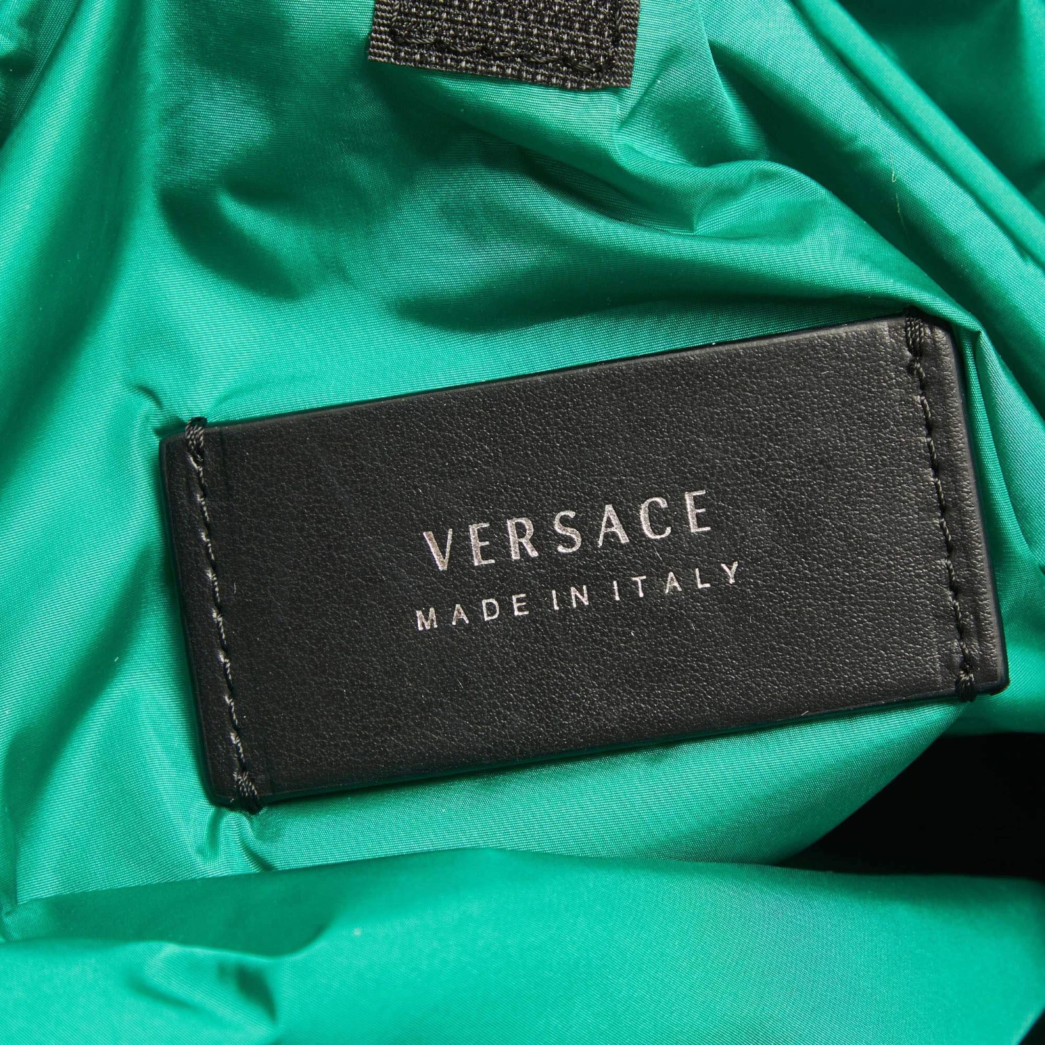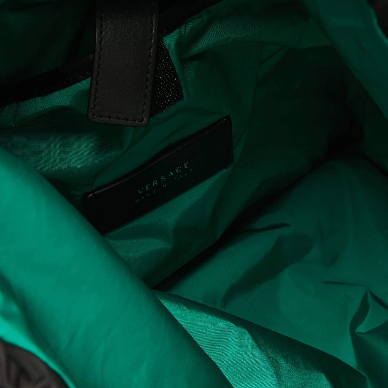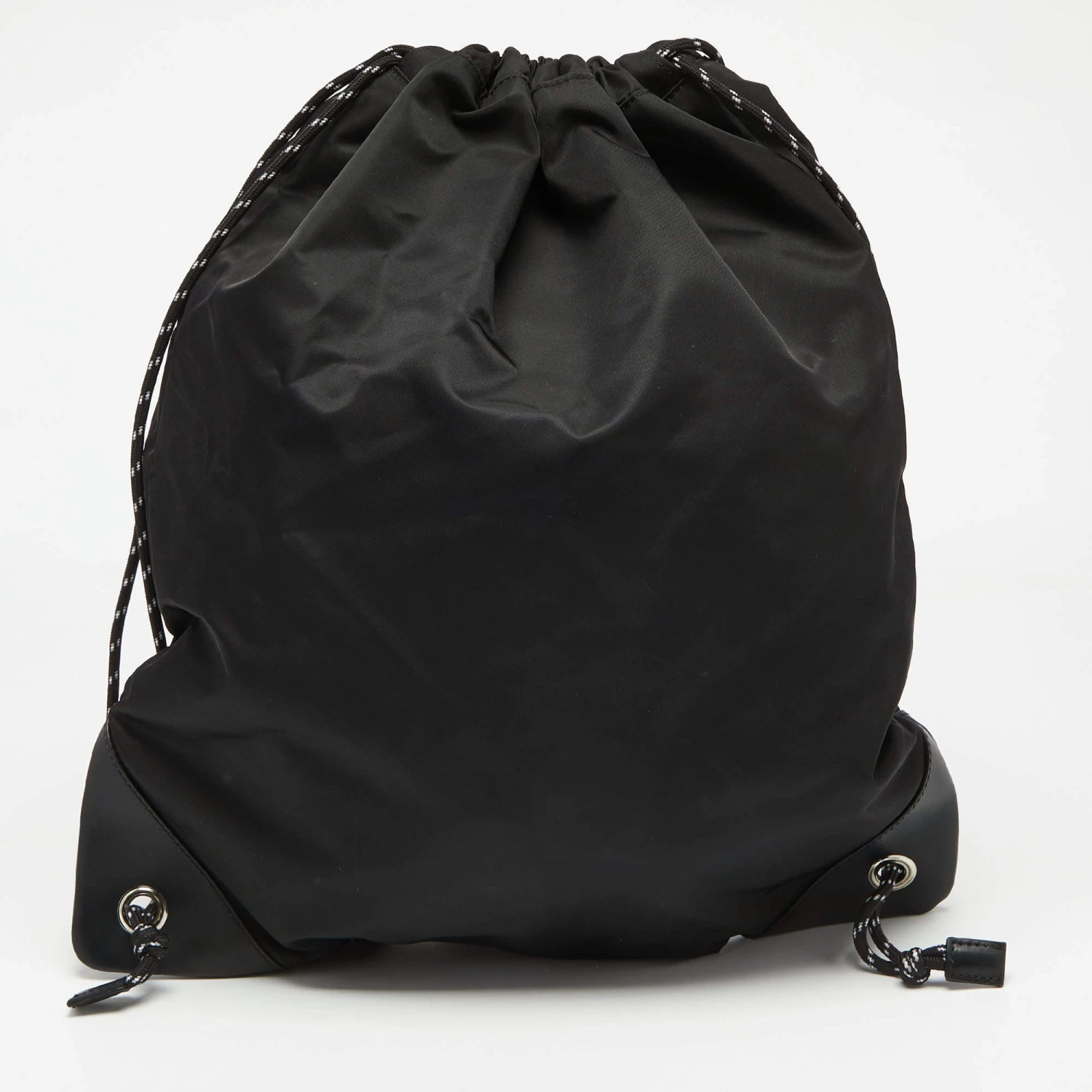 This light backpack by Versace is carefully crafted from black nylon and leather. The drawstring closure reveals a spacious interior that accommodates essentials quite comfortably. Just the right backpack for short trips!