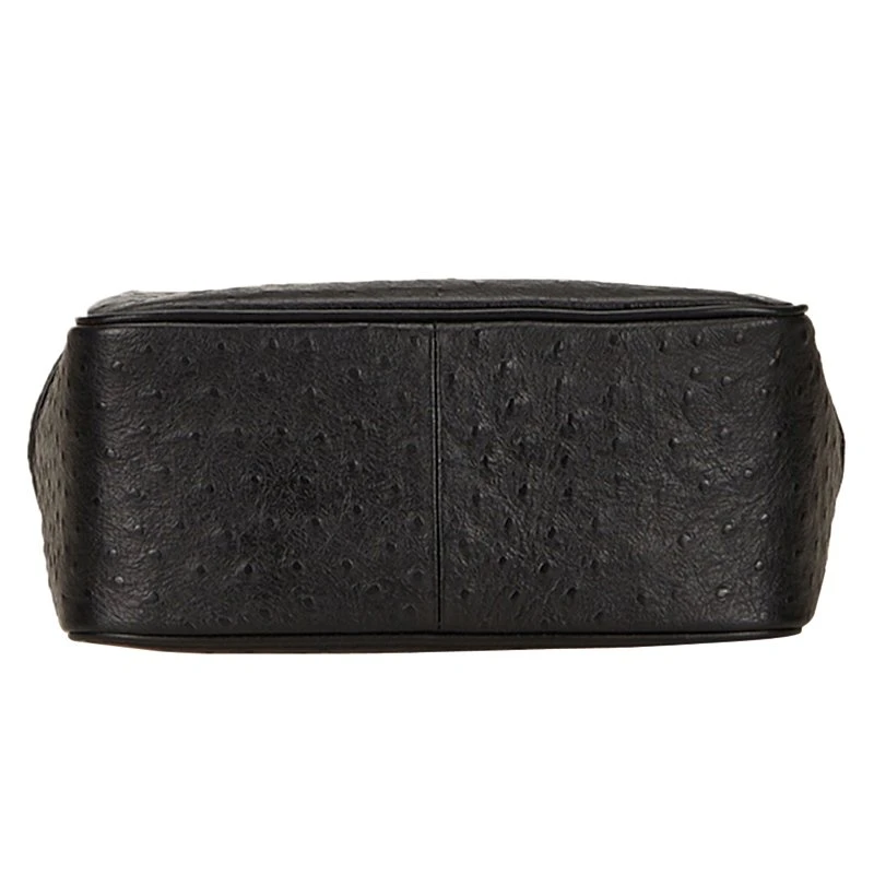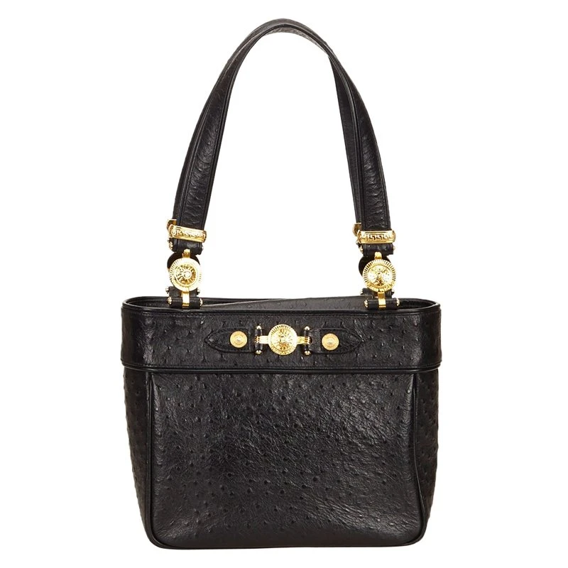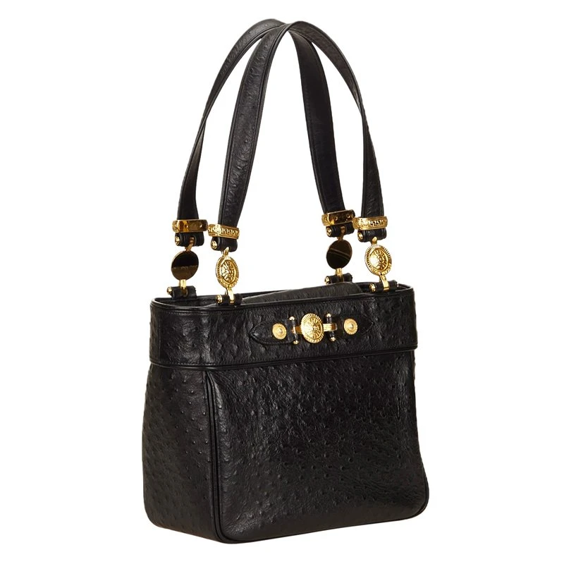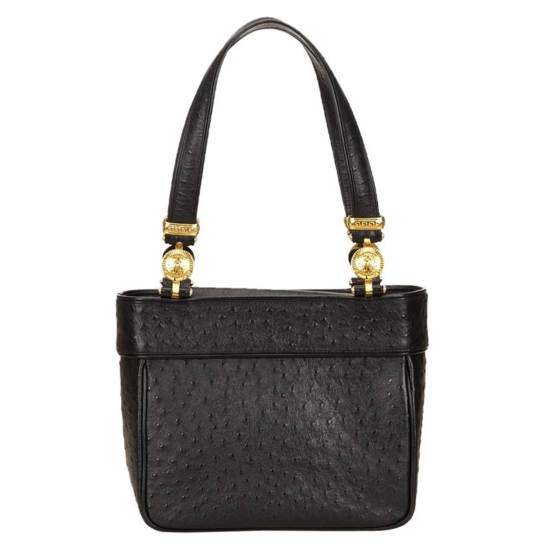 From the ethereal designs of Versace, this Ostrich leather tote would certainly attract your attention. Crafted in black embossed leather, it features double flat handles with gold-tone details. The magnetic closure followed by a zipper closure opens to a fabric lined interior and has a zipper pocket.