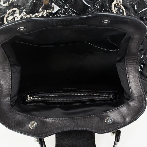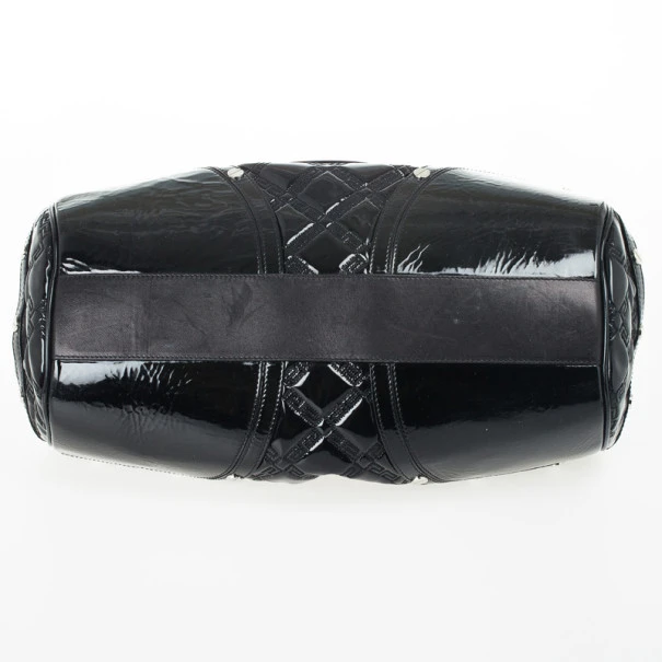 This Versace Black Patent Chain Link Handle Satchel is a stunning handbag you can carry anywhere. Crafted from quilted patent leather with matching leather trim, it comes with a magnetic flap front with a Versace label and patch pocket. The interior is lined with fabric and features two patch pockets and one zip pocket. Carry this stylish handbag by its two chain link and leather handles.Original Retail Price:US $2,320