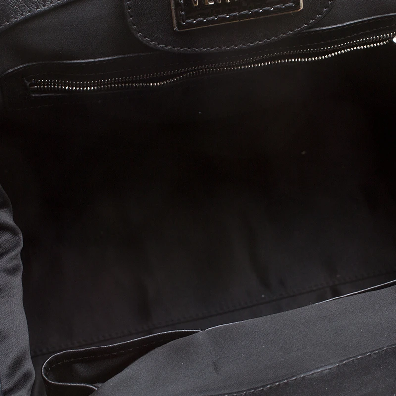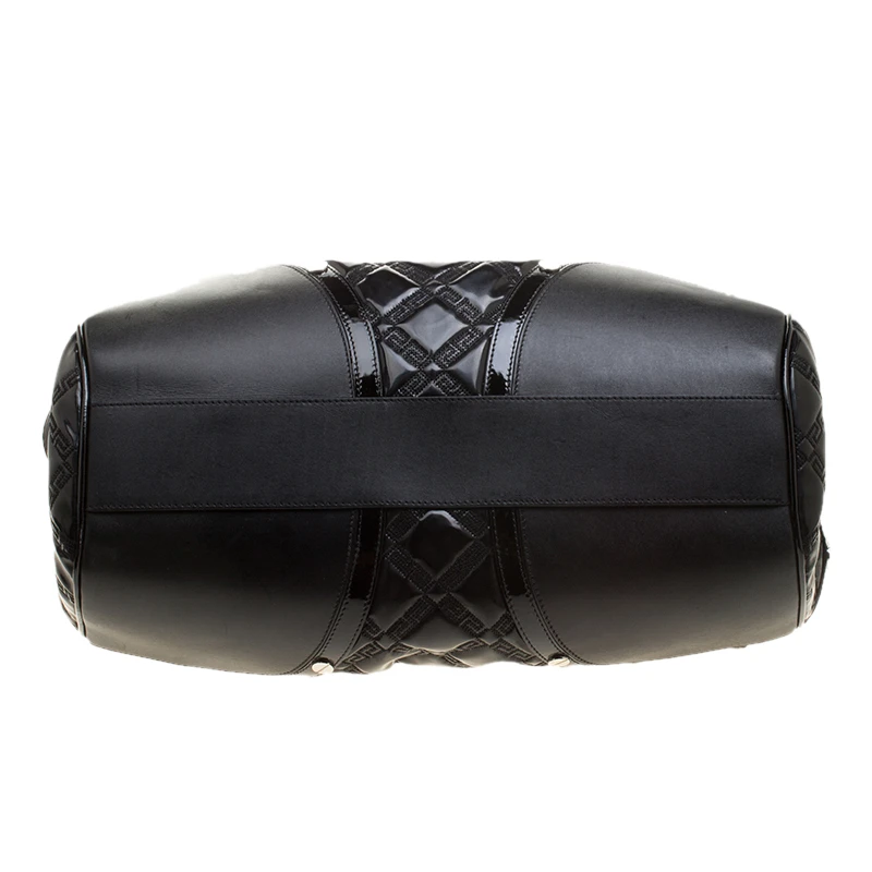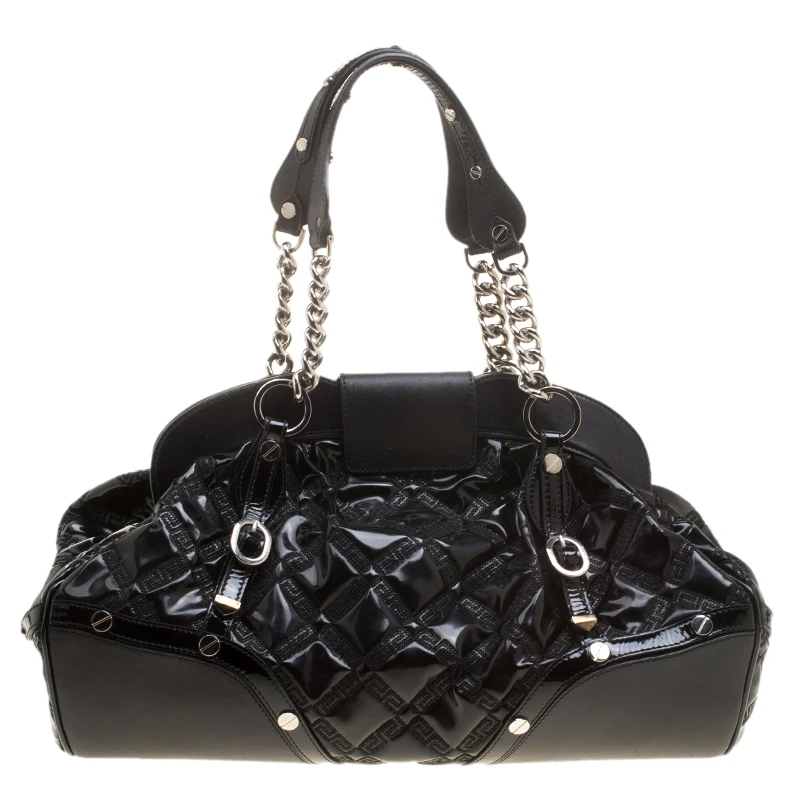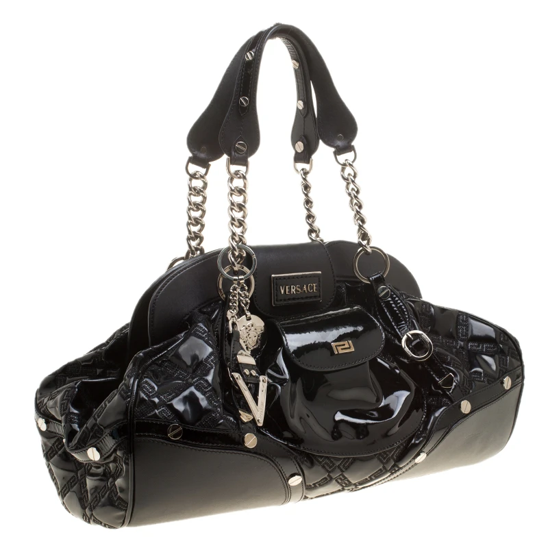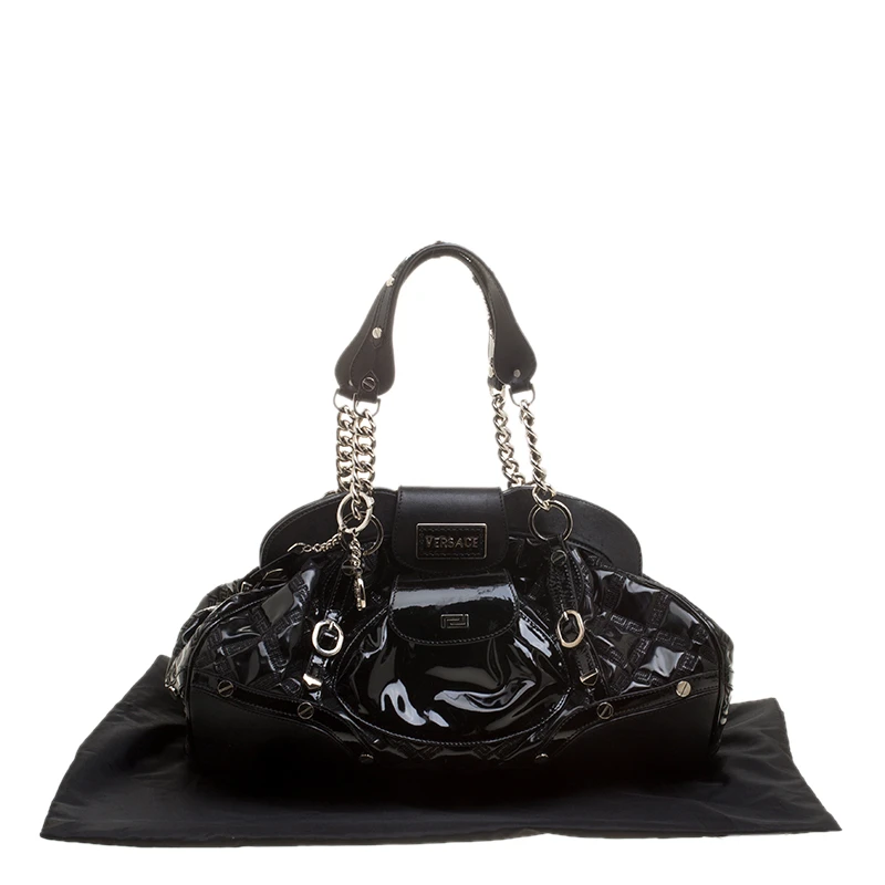 A wardrobe essential patent leather bag that will complete your attire. The attractiveness lies in its dreamy black color which will evenly complement all your dresses. This sleek piece has interiors stitched with satin for precision. Look ornate and chic in this Versace creation.