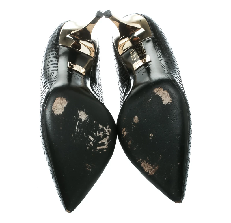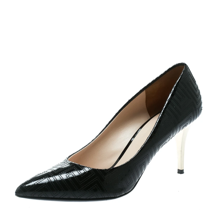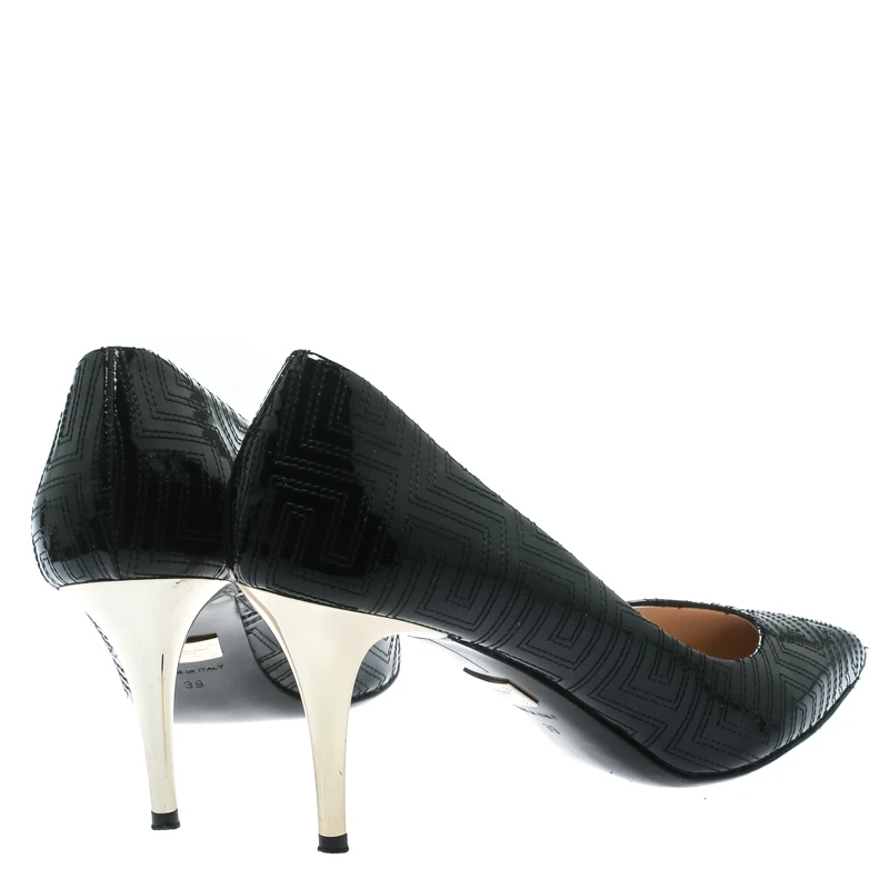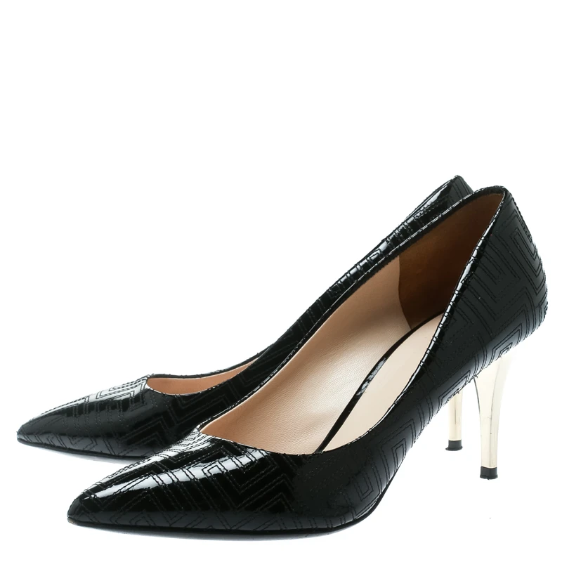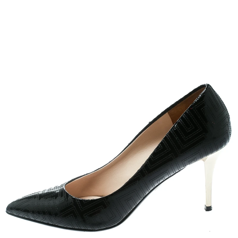 Create your own style statement with this pair of Versace pumps. Designed from patent leather, they feature pointed toes, signature stitching patterns and 8 cm heels. Add a hint of gloss to your closet by slipping into this pair of black pumps.
