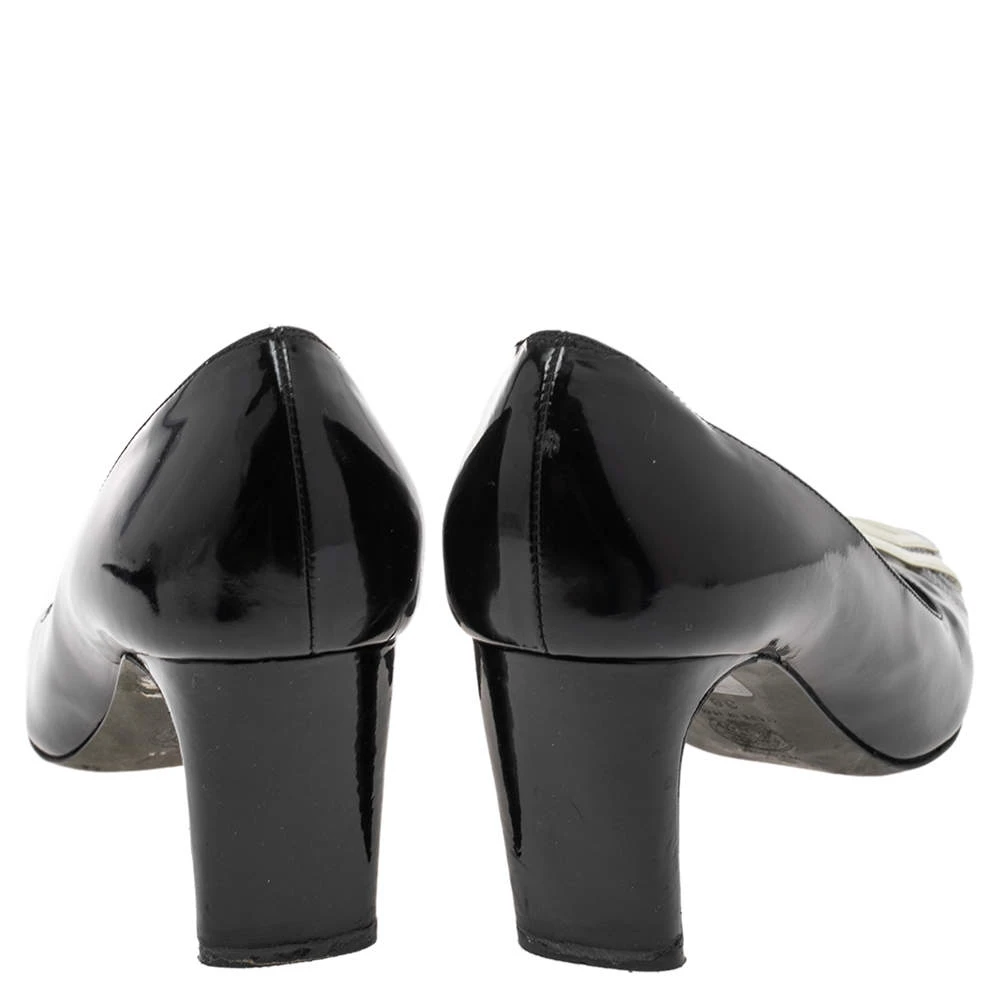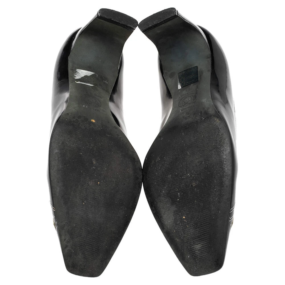 The House of Versace curates luxurious commodities like these pumps to offer your ensemble with endless style and poise. These pumps are made using black patent leather with a stitched logo detail adorning the square toes. They are completed with block heels.