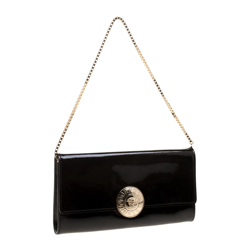 Pick this covetable Versace clutch and make a valuable addition to your closet. The Medusa logo in gold-tone hardware sitting on the glossy black base is the winning feature of this petite bag. Equipped with a flap and a chain shoulder strap, it has a leather and satin-lined interior with a cell phone pocket.