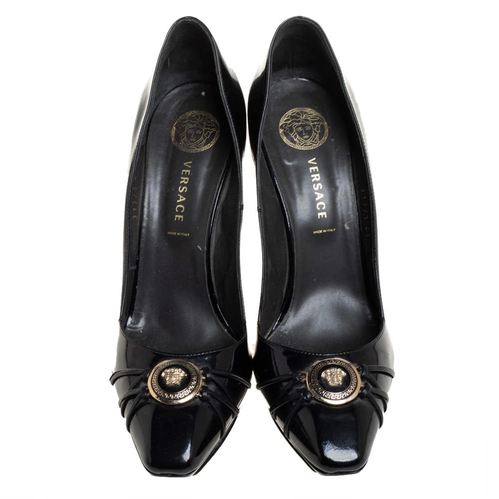 Designed to perfection, these pointed-toe pumps are from the famous luxury house of Versace. They are covered in patent leather, detailed with the Medusa logo and balanced on 9.5 cm heels. Feel your best every time you slip into these black pumps.