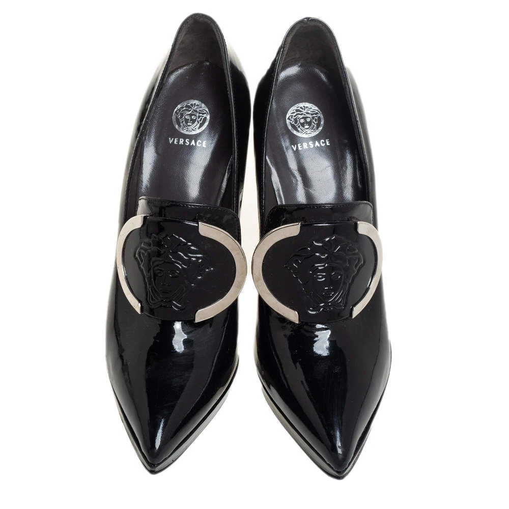 Crafted from patent leather, these loafer pumps are ideal for any event. This Versace pair comes in black and features a block heel of 12 cm. These Medusa platform heels are designed with gold-tone detailing on the vamps. This will be a great addition to your closet.