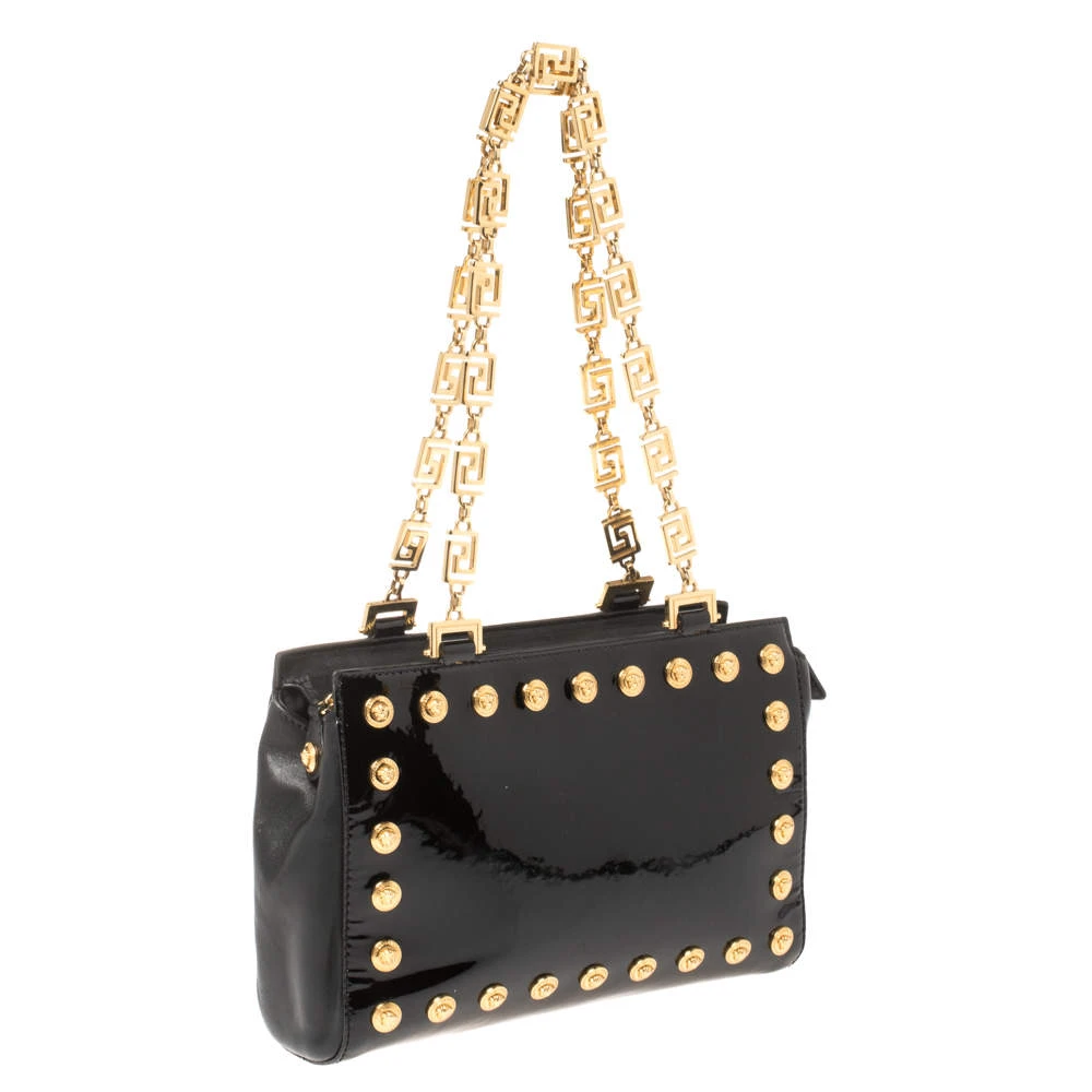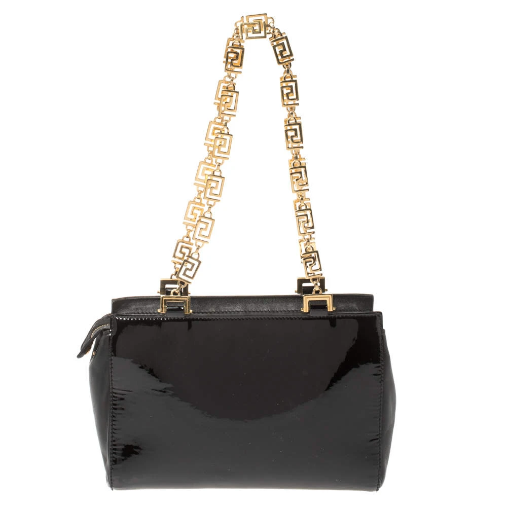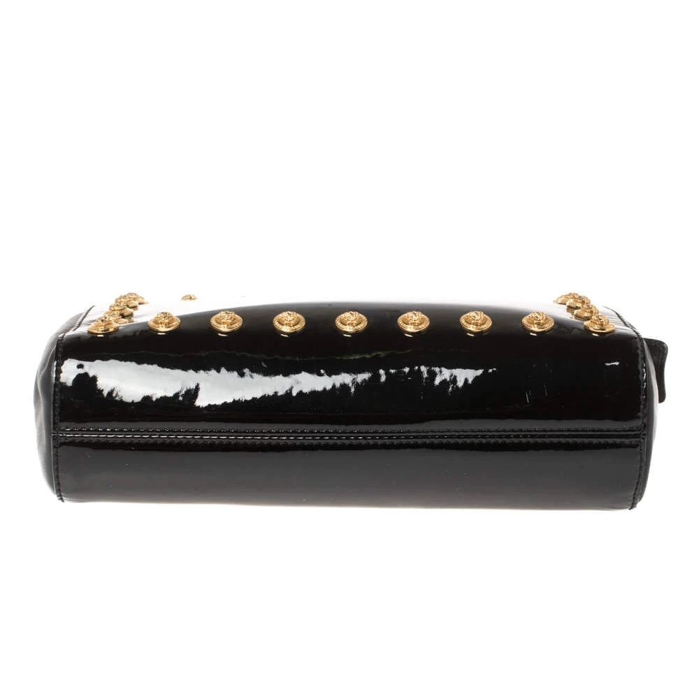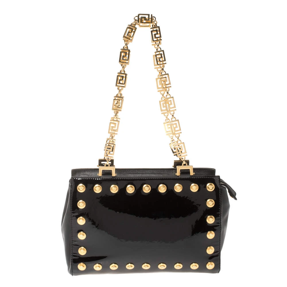 The Medusa shoulder bag by the iconic house of Versace is a statement-making piece. Made from glossy patent leather, it features the iconic Medusa motif in gold-tone on the studs and chain-link shoulder straps. The satin-lined interior is enclosed with a zipper.