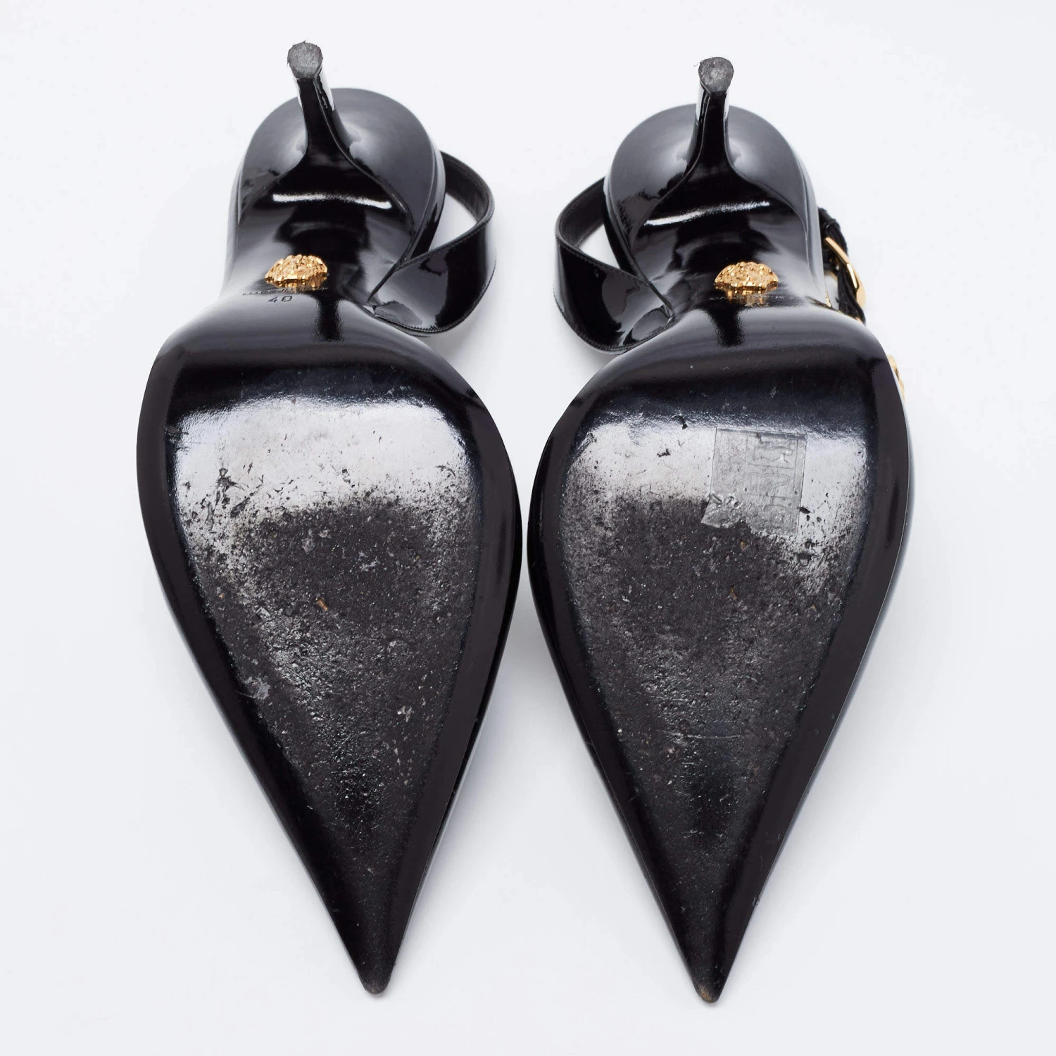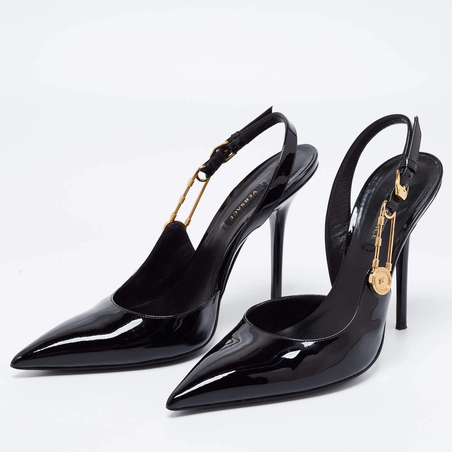 Classy in black, these Versace pumps come crafted from patent leather and feature a sleek pointed-toe silhouette. They have been styled with gold-tone safety pin embellishments along the buckled slingback straps and are equipped with smooth insoles. Elevated on slender 12 cm heels, they are a perfect blend of comfort and high fashion.