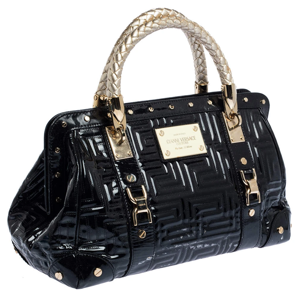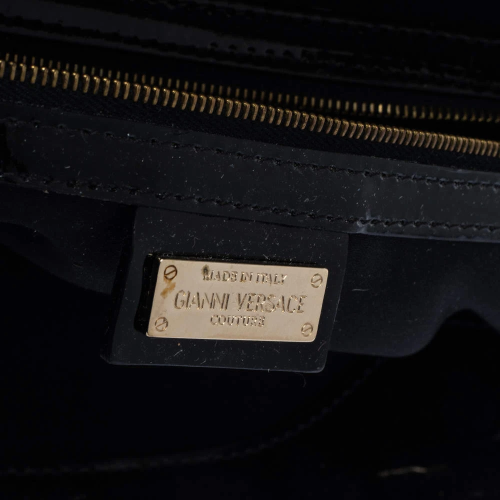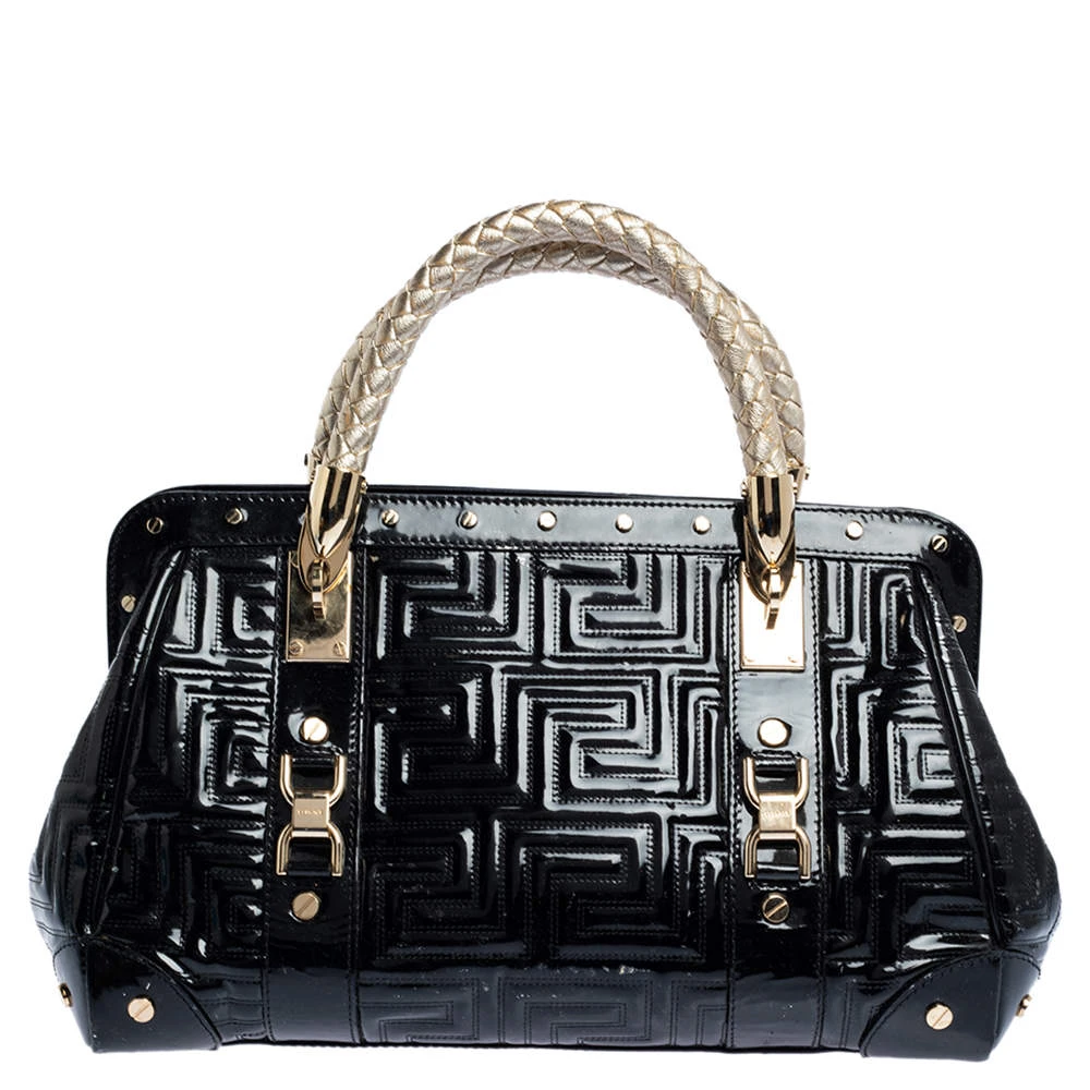 How gorgeous is this satchel from Versace! It carries an outstanding design and a fabulous interplay of patent leather and gold-tone hardware. It has a top leading to a satin interior while being held by two top handles. The shape and the brand logo on the front just uplift its beauty and makes it a buy you will not regret.