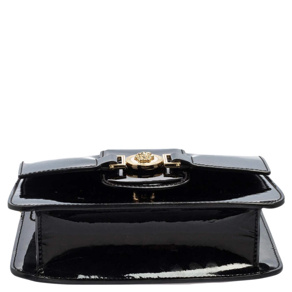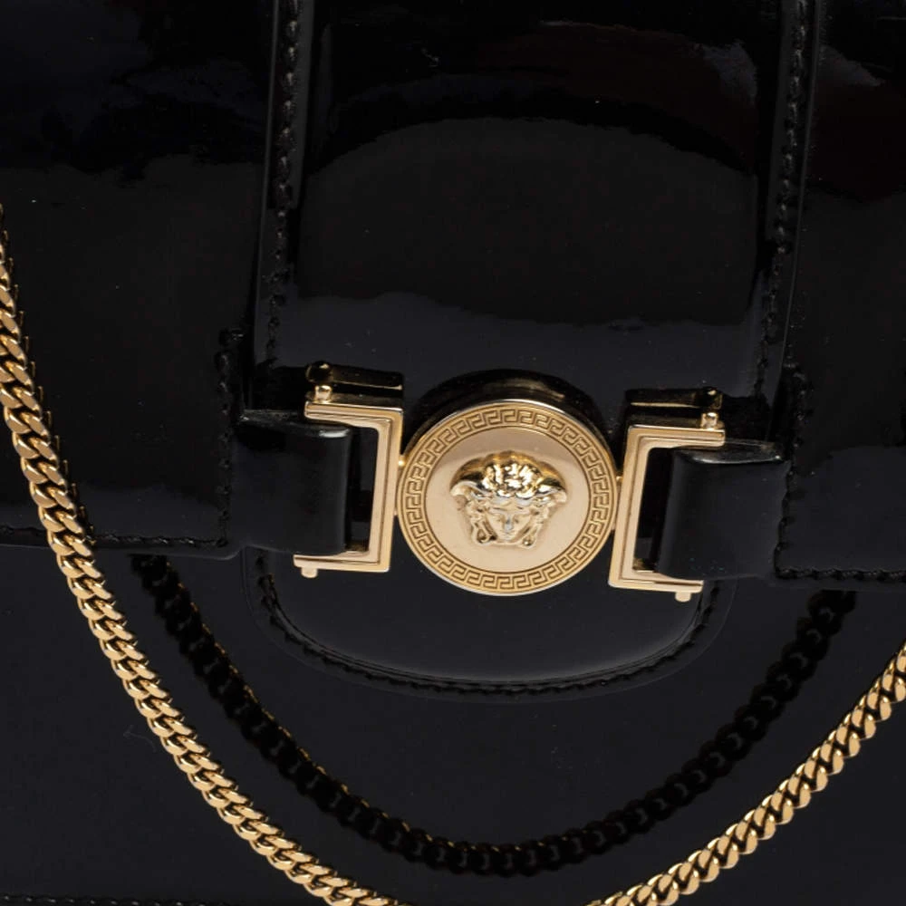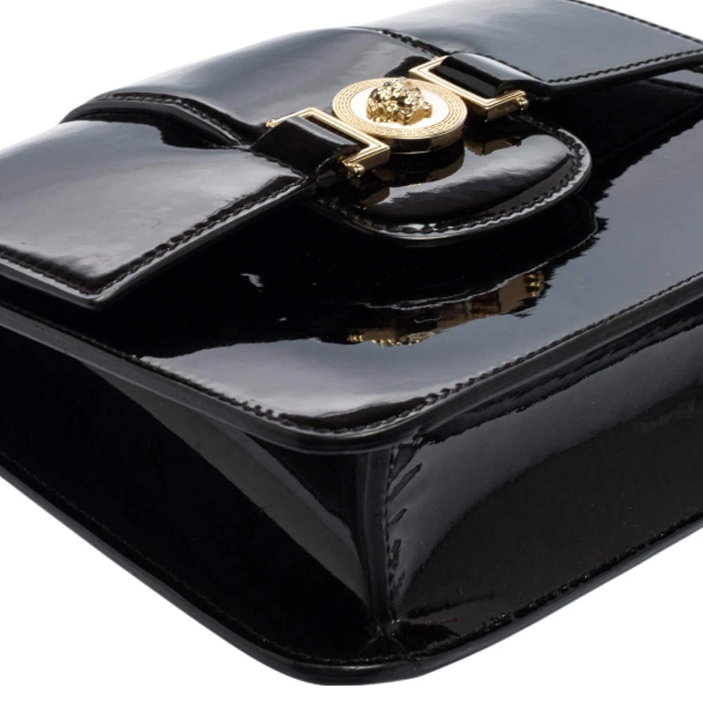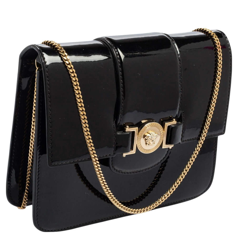 This bag from Versace definitely needs to be on your wishlist. The bag is crafted from patent leather in a lovely black shade. It flaunts a long shoulder strap and the famous Medusa logo at the front. The leather interior houses a zip pocket.