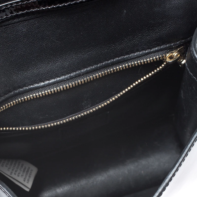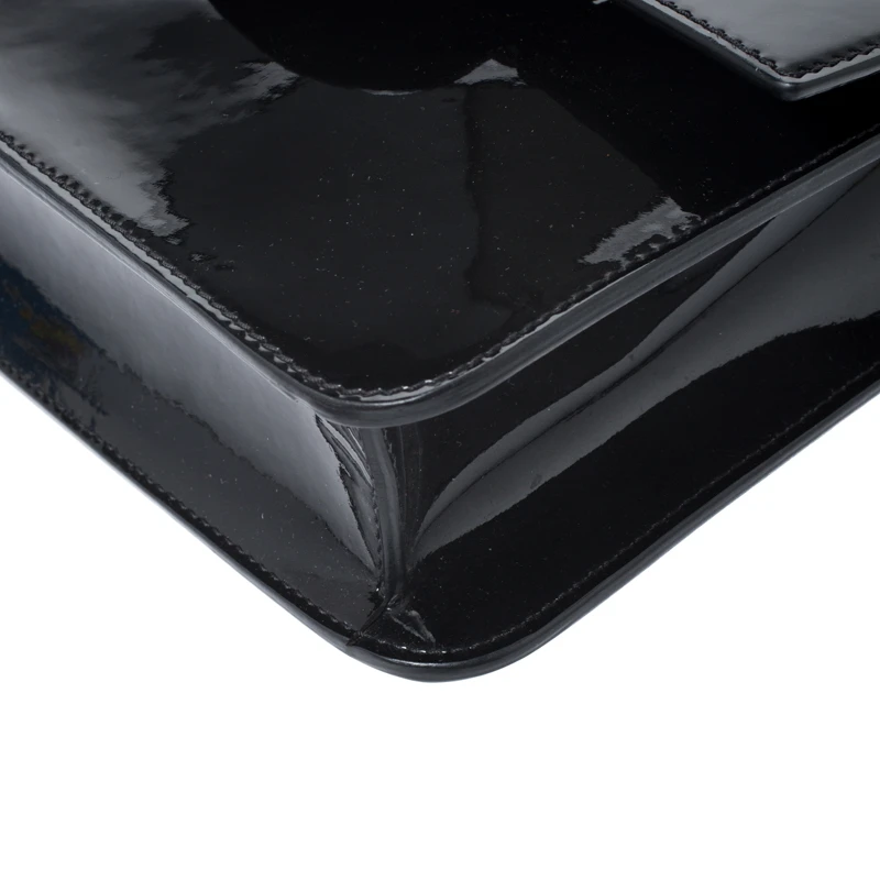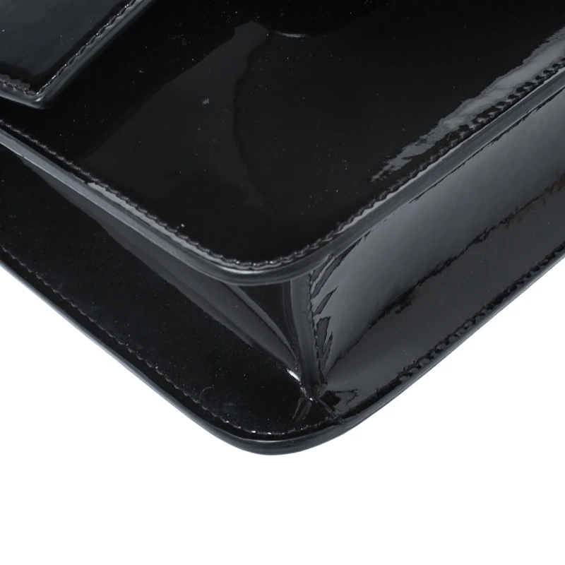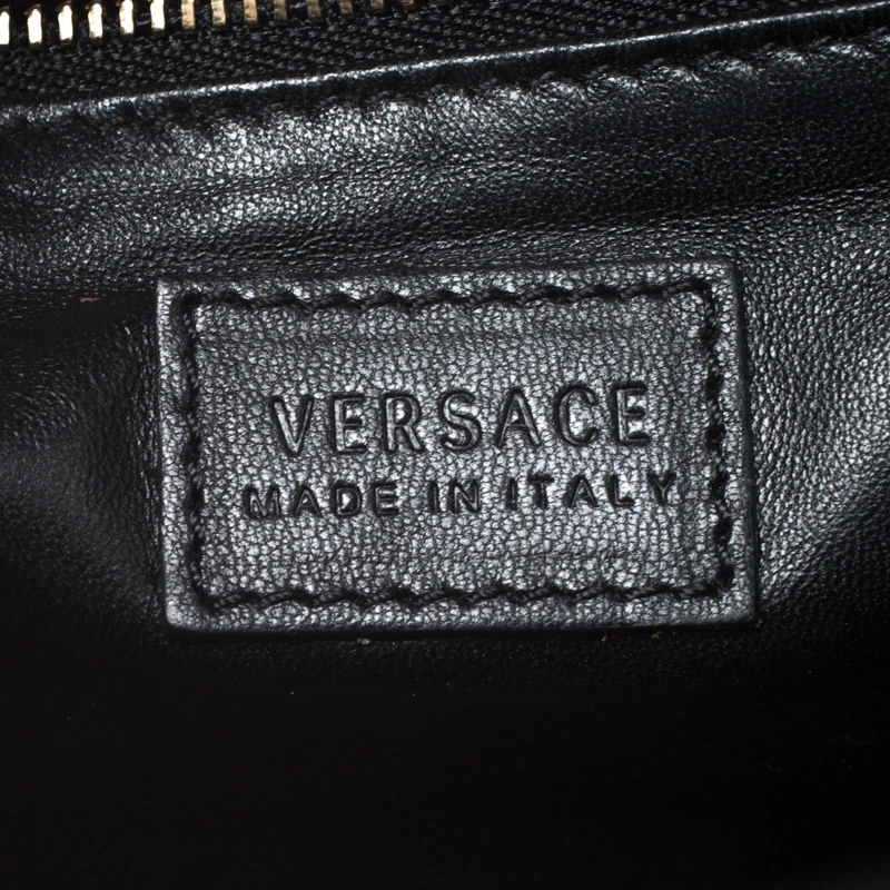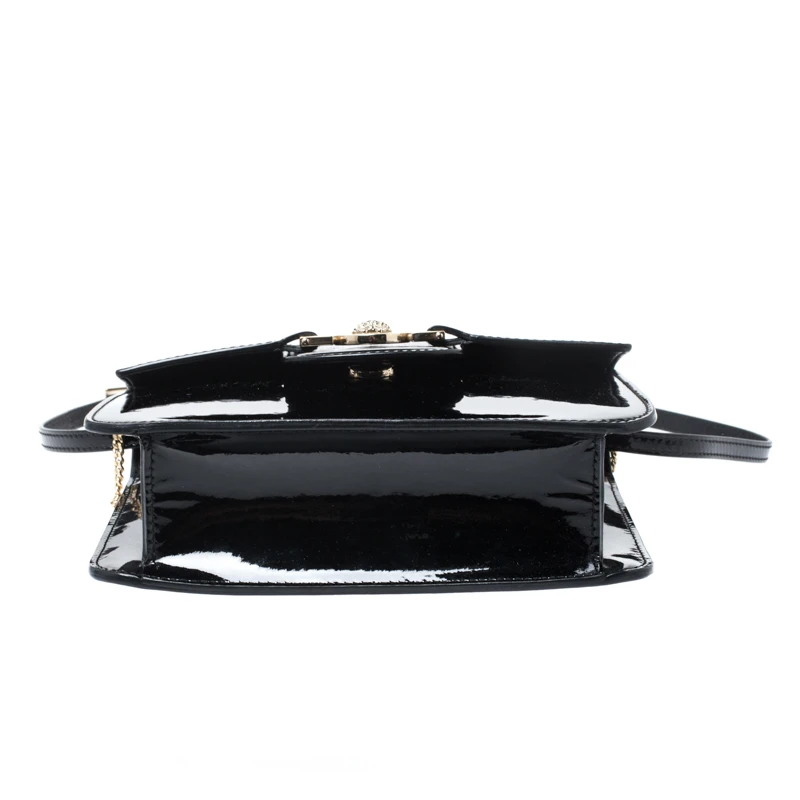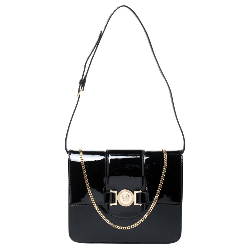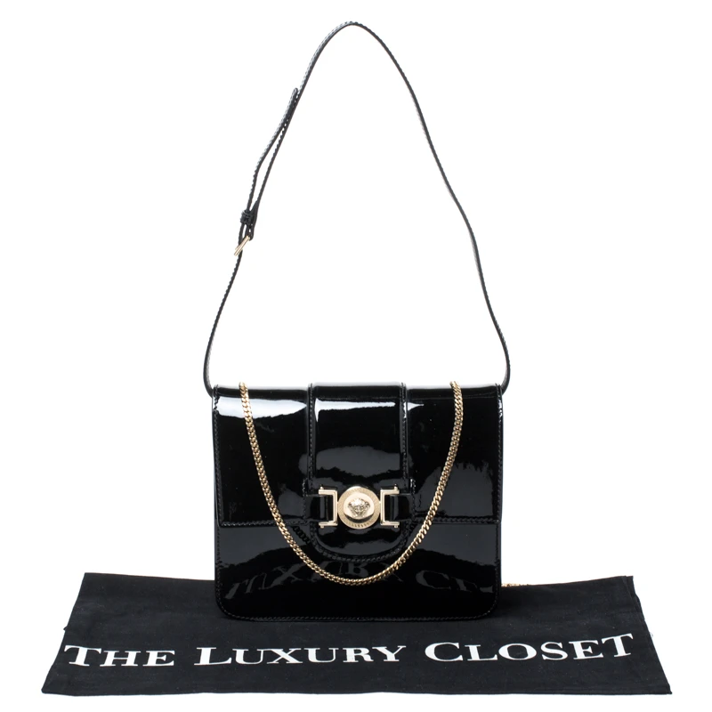 This gorgeous bag by Versace is glossy and glamorous. Crafted in Italy, it is made from quality patent leather and comes in a lovely shade of black. This shoulder bag features the signature Medusa logo on the front flap that opens to reveal a leather interior with a zip pocket and enough space for essentials. It has a chain-link strap and a shoulder strap for convenience. It is finished with gold-tone hardware. Grab this beauty now!