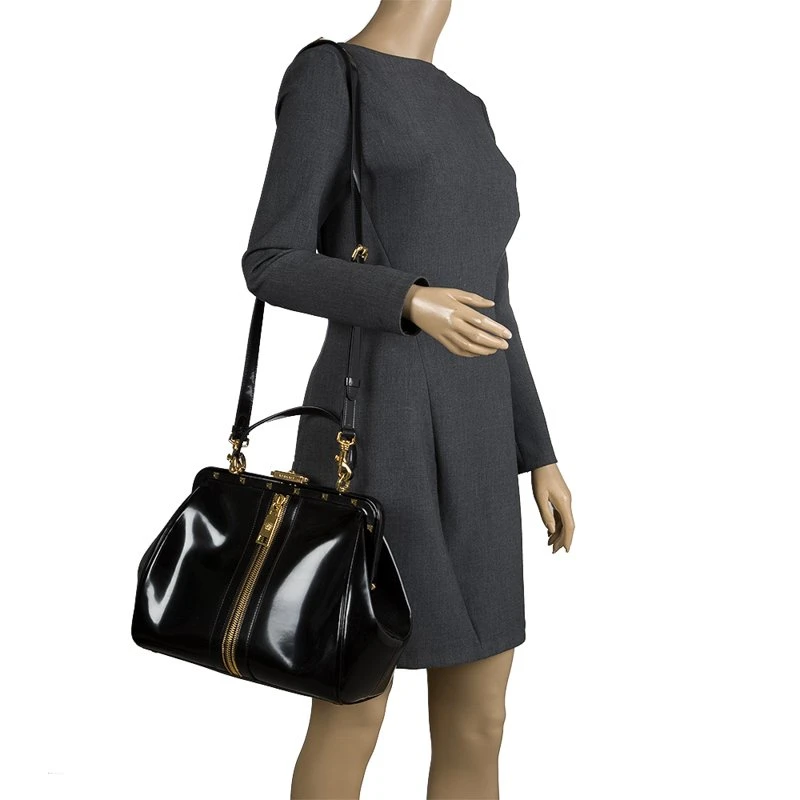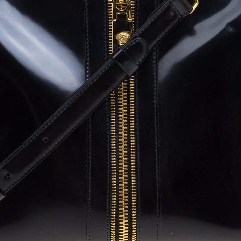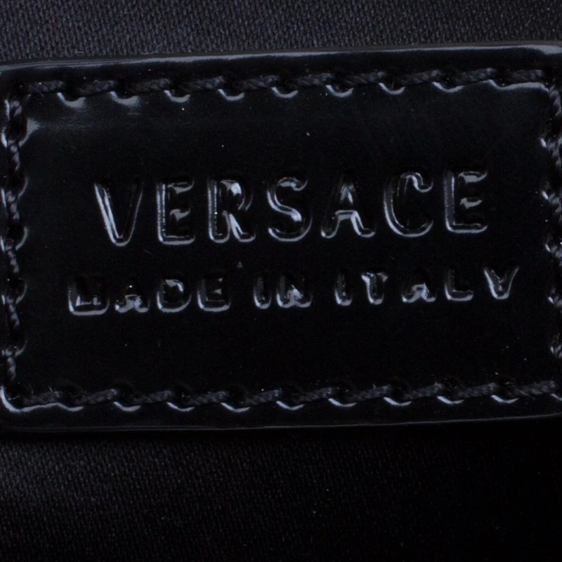 Quench your desire for the perfect satchel with this fabulous Versace piece. This black bag is ingeniously crafted from patent leather and features a top handle and a removable shoulder strap. The interiors are satin lined and the bag is complete with a front zip detail and gold-tone hardware. Spacious enough for all your essentials, this satchel will surely be an amazing addition to your bag collection.