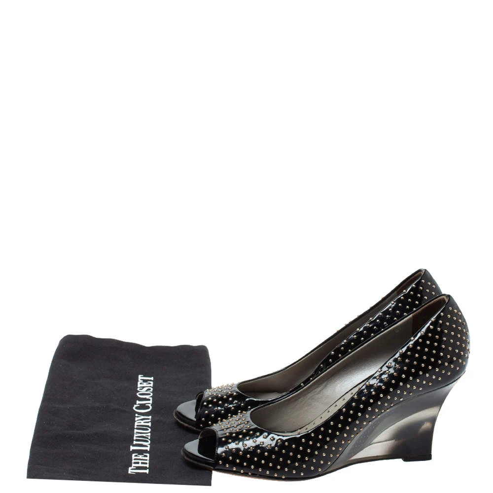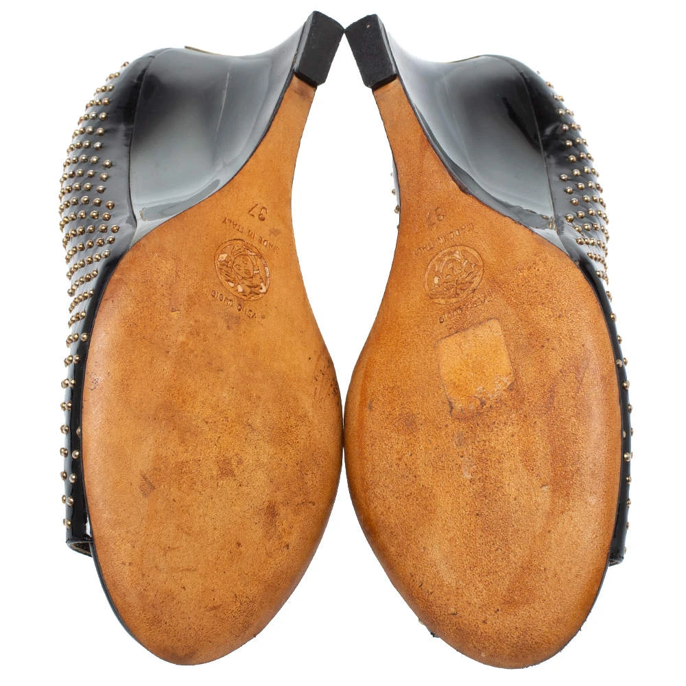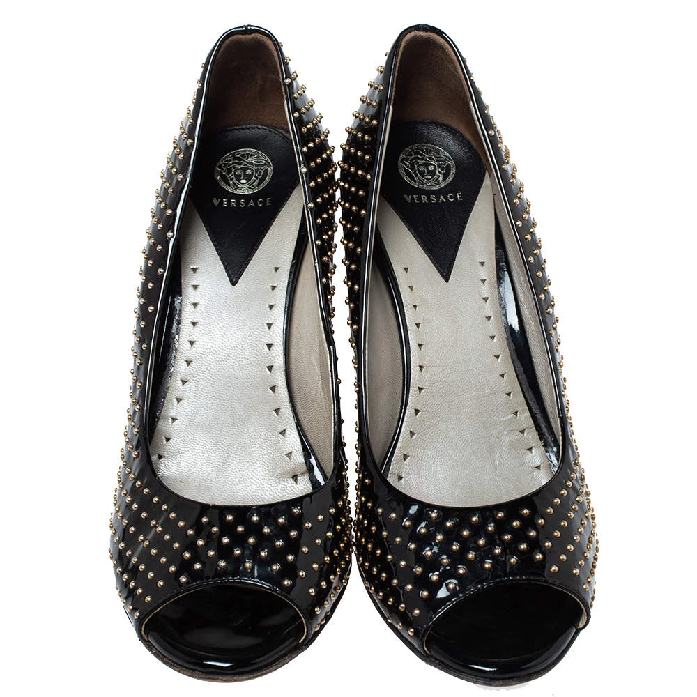 These unique and stunning pumps from the house of Versace will be a valuable addition to your shoe closet. Meticulously crafted in Italy, they are made from glossy black patent leather and adorned with studs all over. They feature a peep-toe design and an 8 cm wedge heel with gold-tone detailing.