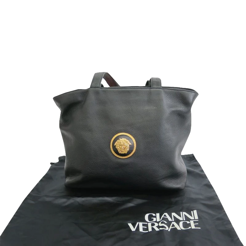 Collect the classic elegance with the Versace Medusa tote, which simply flaunts exquisite craftsmanship. Crafted in black pebbled leather, the bag exudes elegance in the signature metal branding on the front. Featuring shoulder handles, the bag opens with a top zip to a leather lined interior with a metal plaque for branding. The gold tone metal rivets on the base, protects the bag and the overall look exudes elegance.