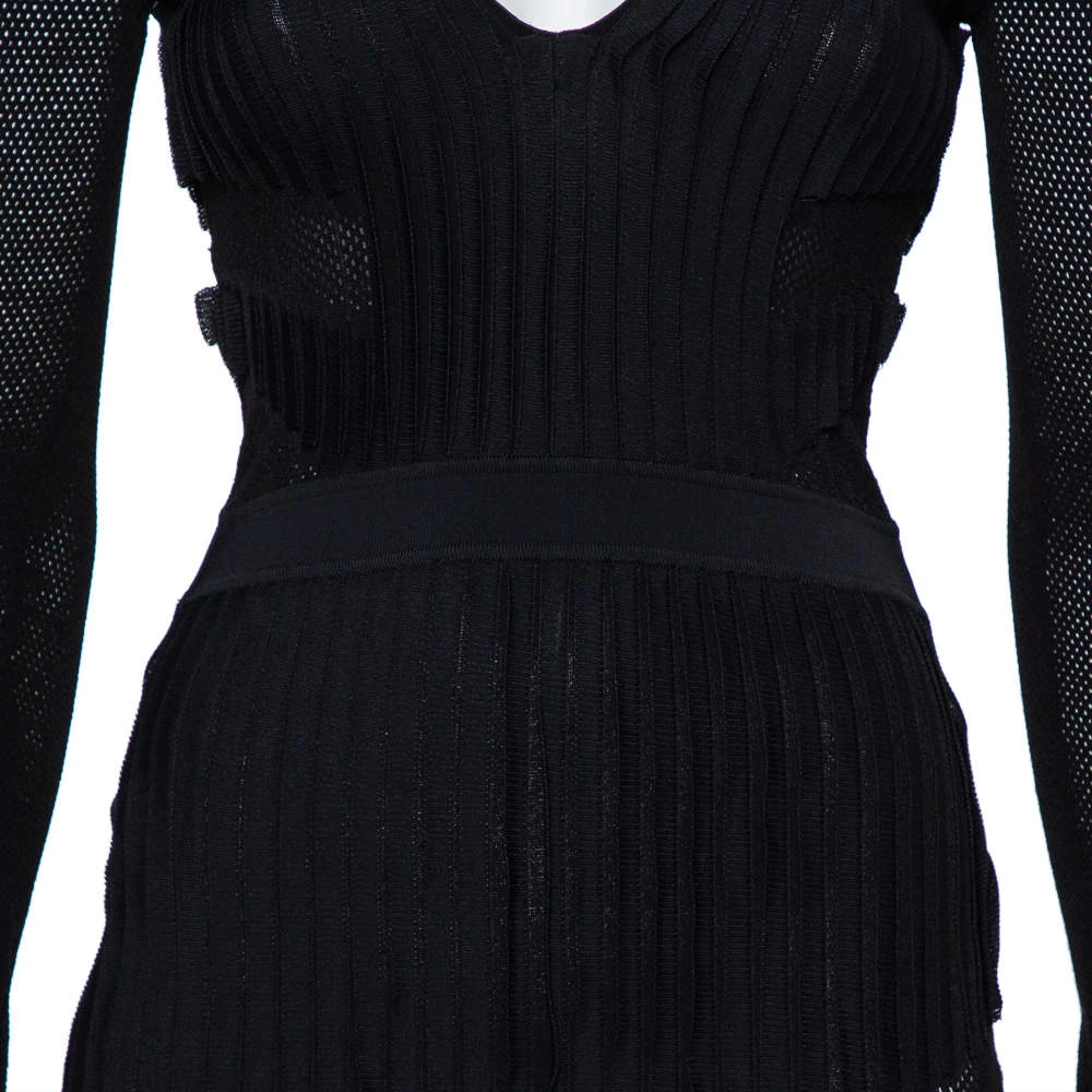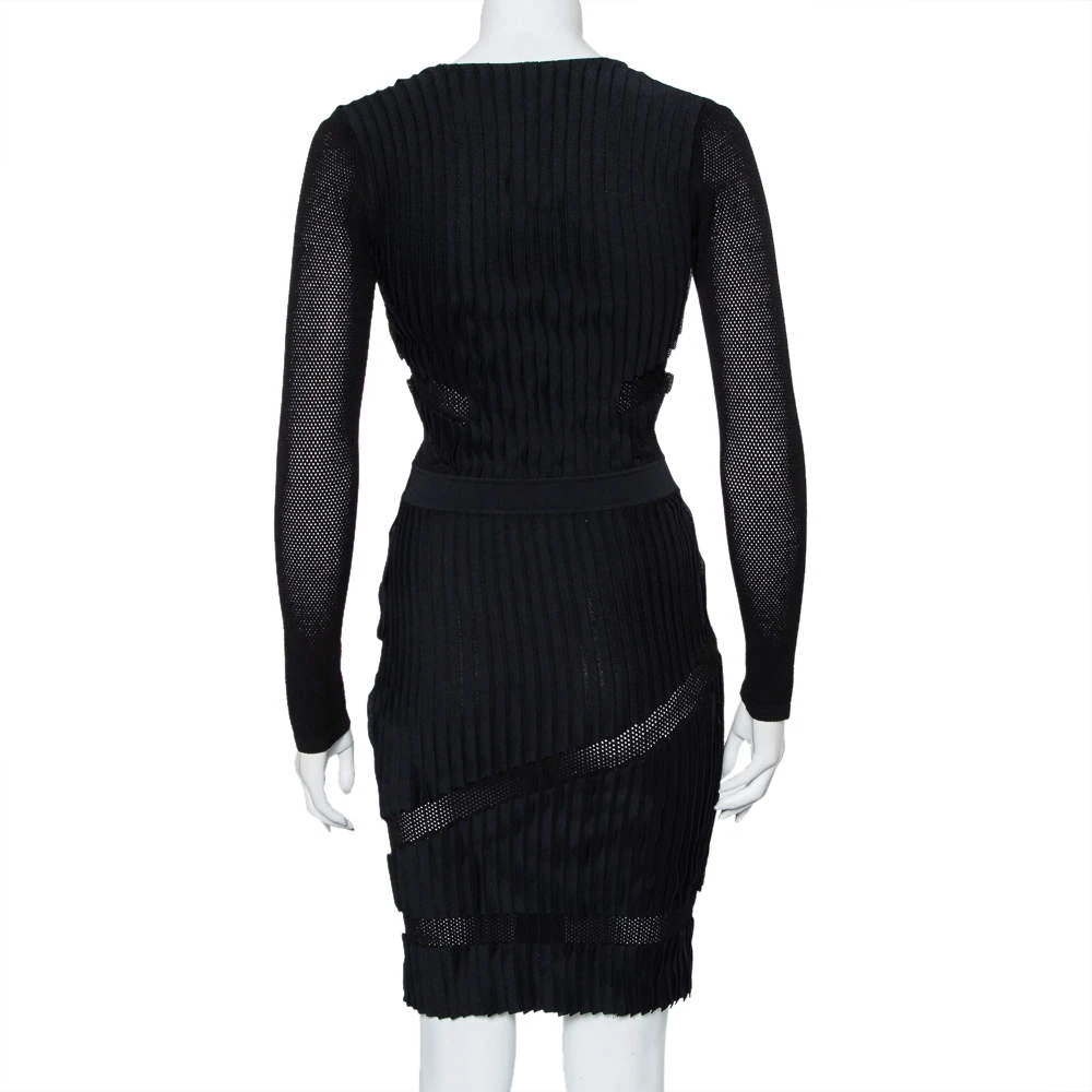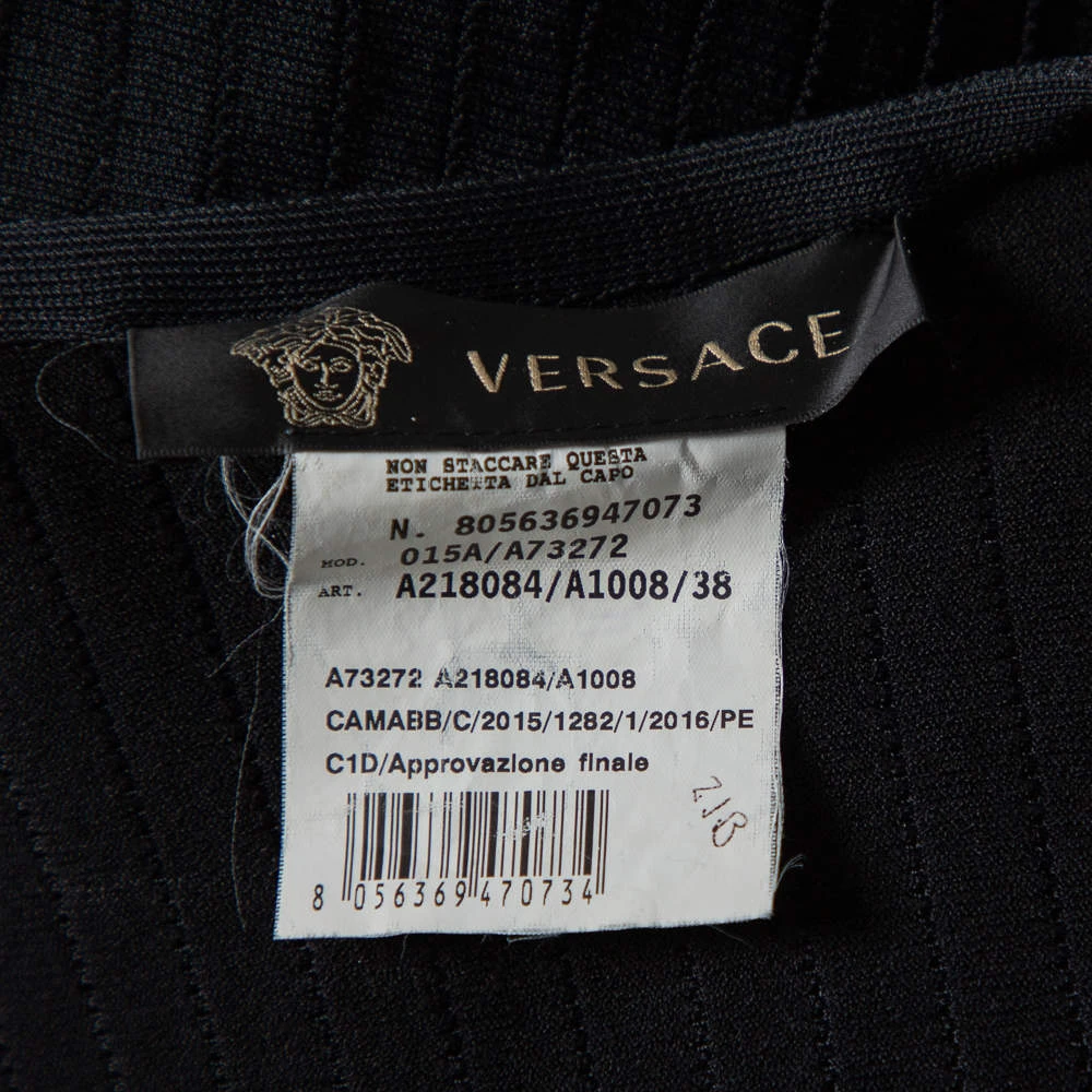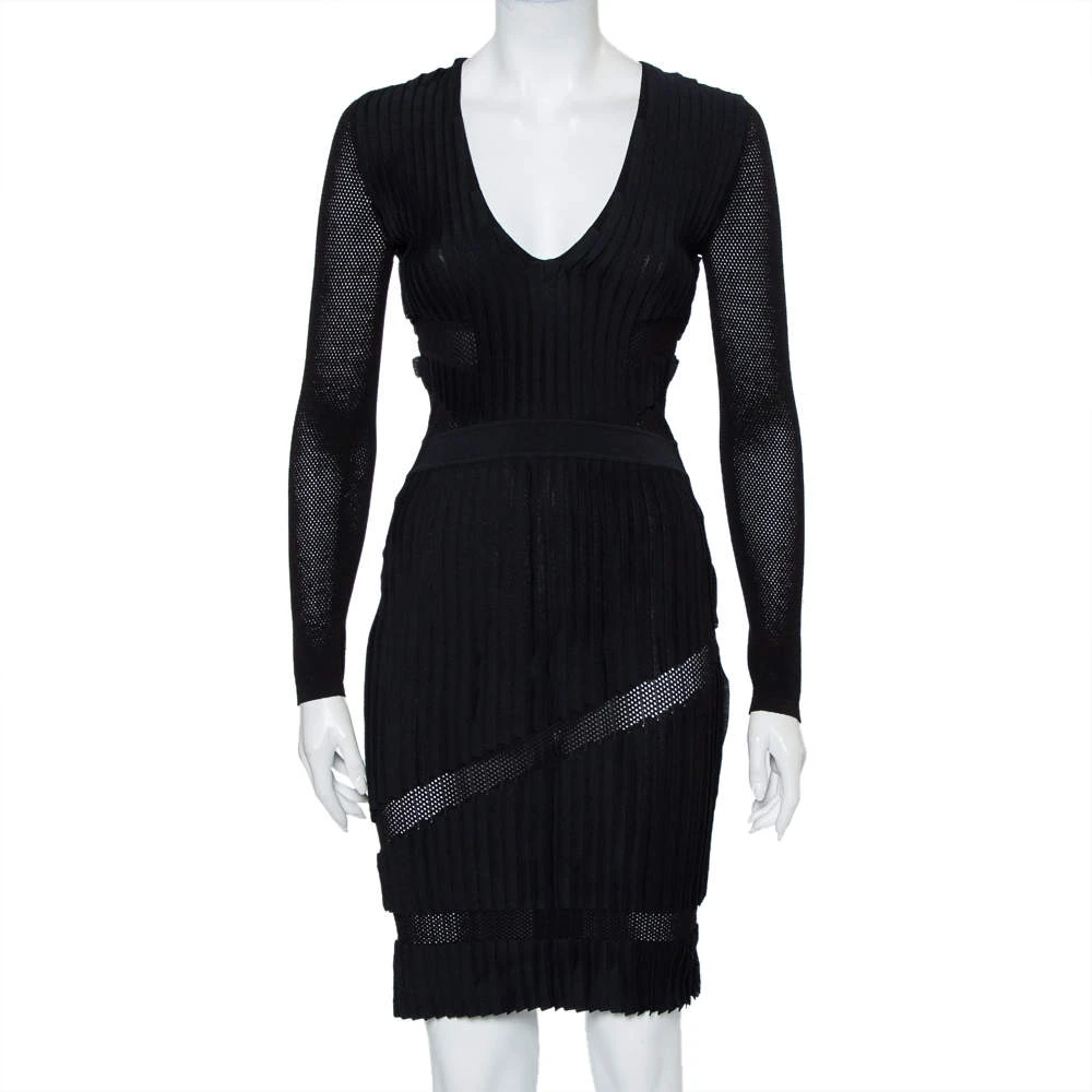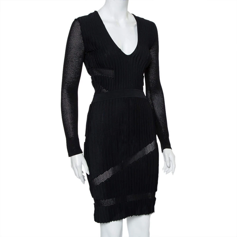 Be at your glamorous best in this sheath dress from the House of Versace! The black cotton blend creation has been styled in a flattering silhouette with perforated knit long sleeves and panels. It has a plunging neckline and will look amazing with pointed stilettoes and a statement clutch.