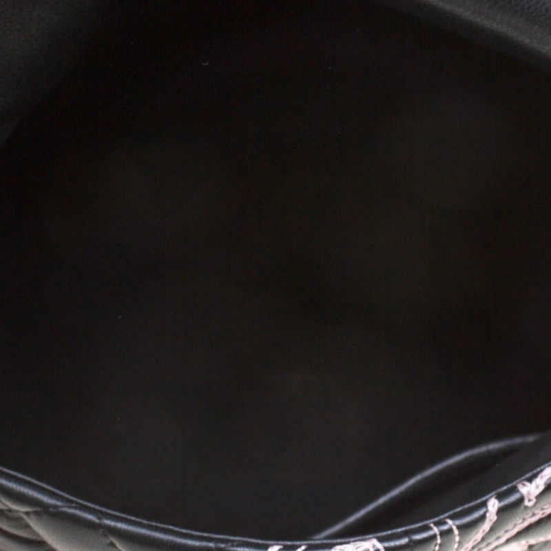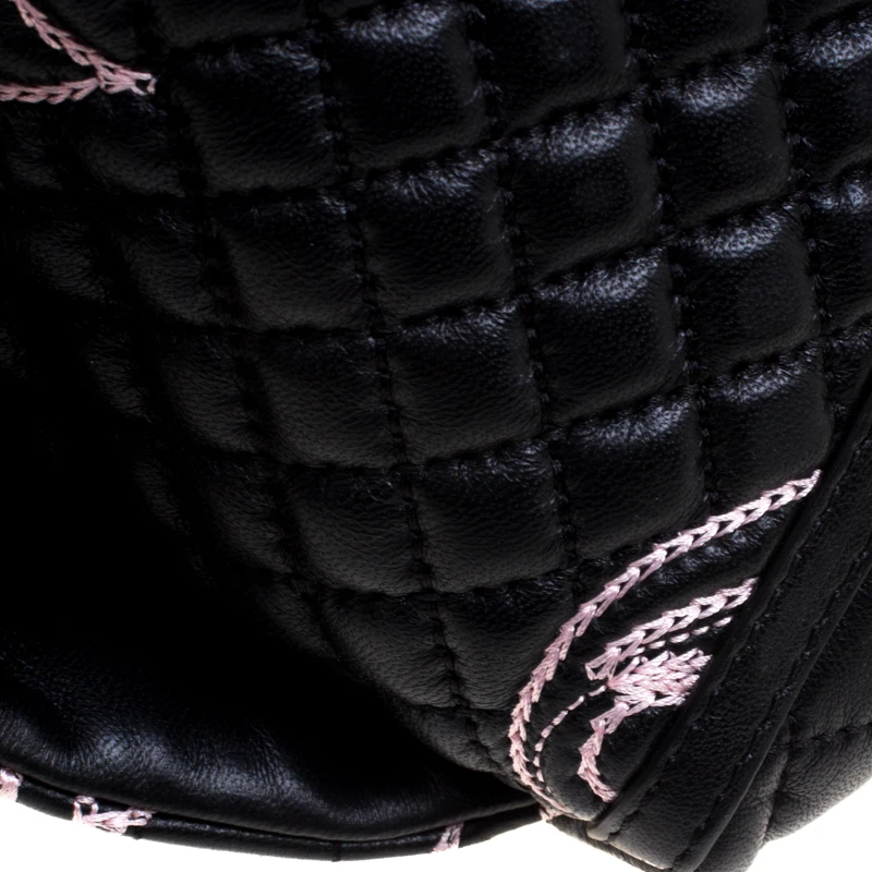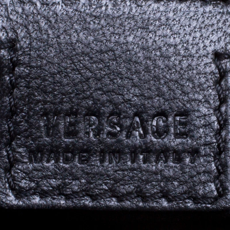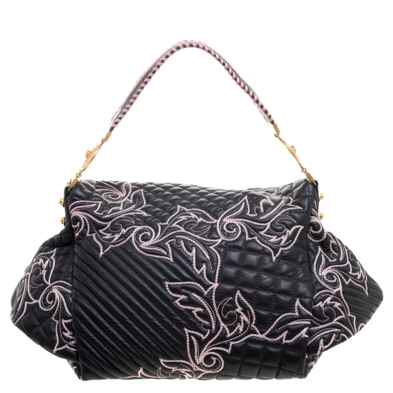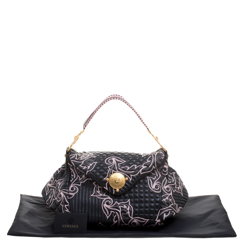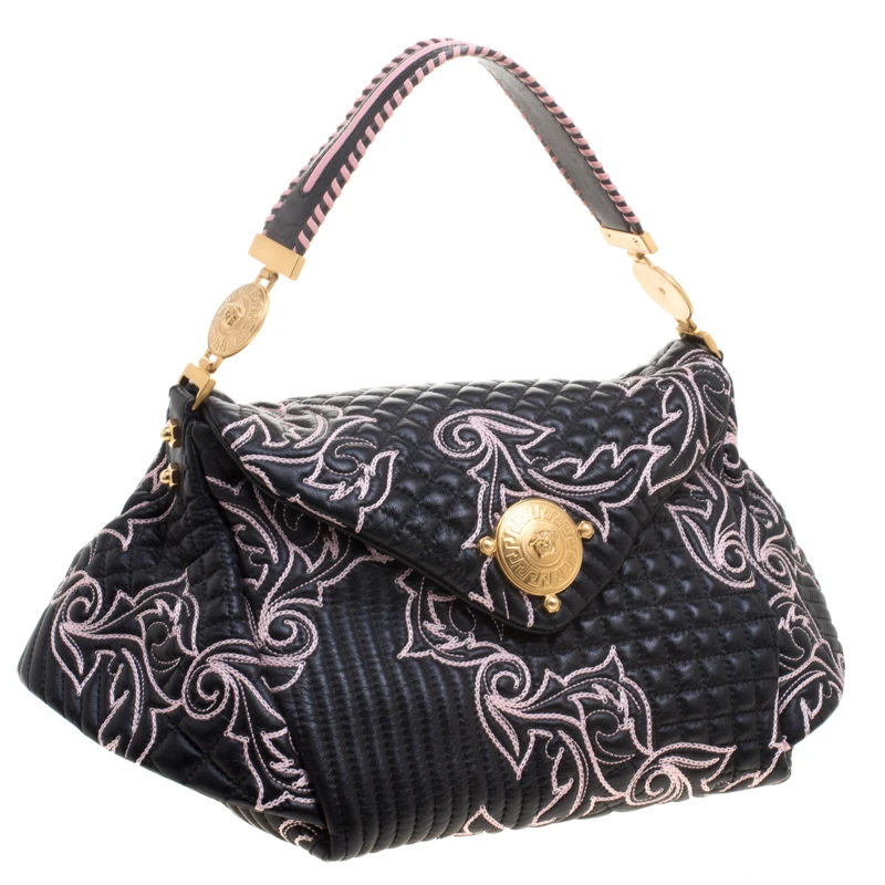 This Versace handbag is simply breathtaking. Meticulously crafted from leather, the quilted bag delights not only with its appeal but structure as well. It is held by a single handle, detailed with embroidery and equipped with a spacious canvas interior. The fabulous shape, the catchy emblem, and the impeccable style of creation effortlessly add to the marvel of this coveted piece.