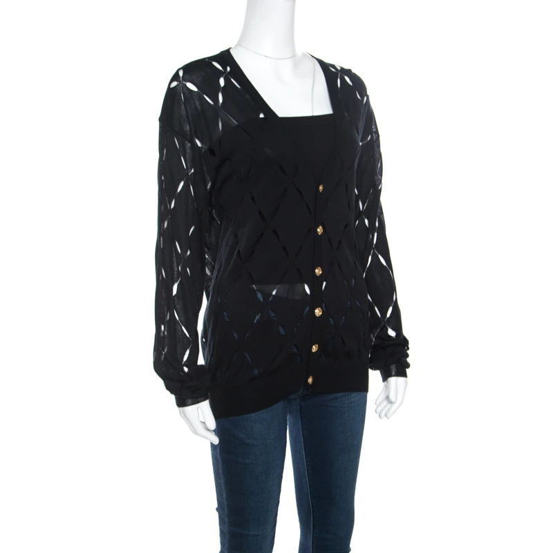 Modishly designed with a feminine approach, this Versace cardigan features pointelle knitting all over. This snug cardigan has a plunging V-neckline with long sleeves along with ribbed hem and cuffs. Layer this over your casual separates to complete the look.