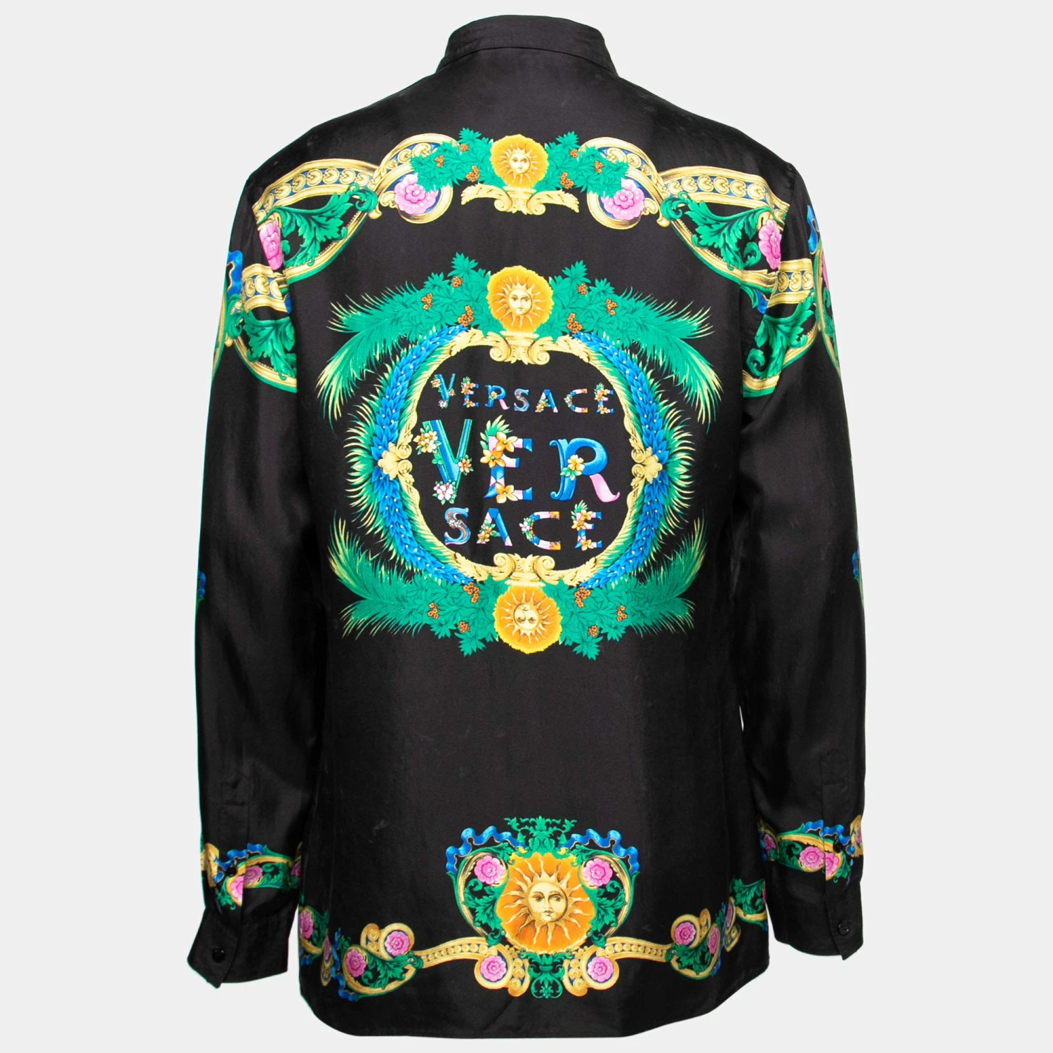 Shirts are an indispensable part of a wardrobe, so Versace brings you a creation that is both versatile and comfortable. It has been tailored from silk in a black shade featuring the floral motifs along the hem, buttons, and cuffs.