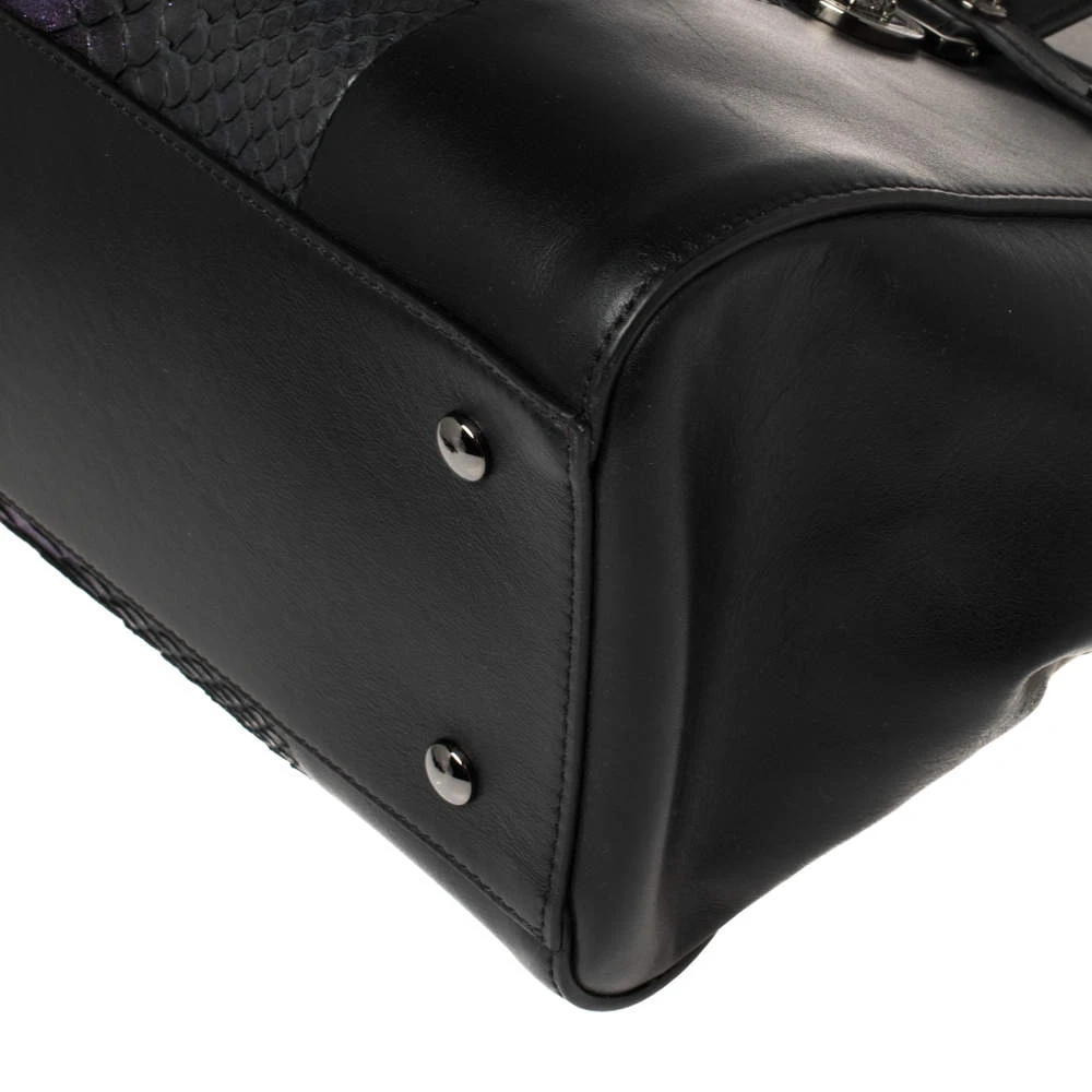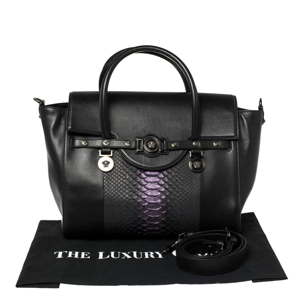 Sophisticated and luxe, this bag from Versace definitely needs to be on your wishlist. The bag is crafted from leather and exotic python skin and it features a structured silhouette. It flaunts dual handles, a removable shoulder strap, and the famous Medusa logo on the front. The spacious satin interior houses pockets. (NOTE: FOR UAE CUSTOMERS ONLY)
