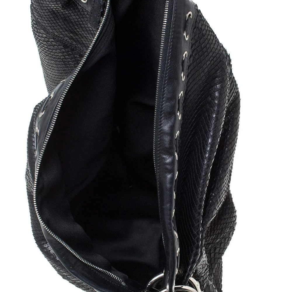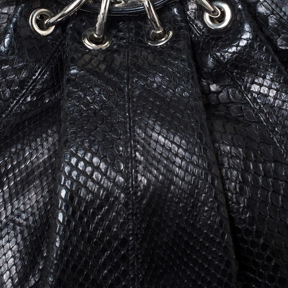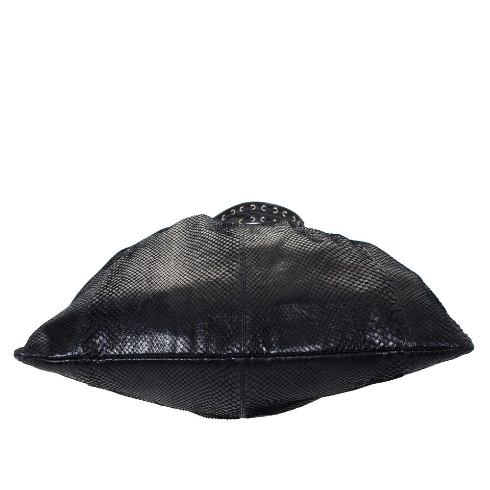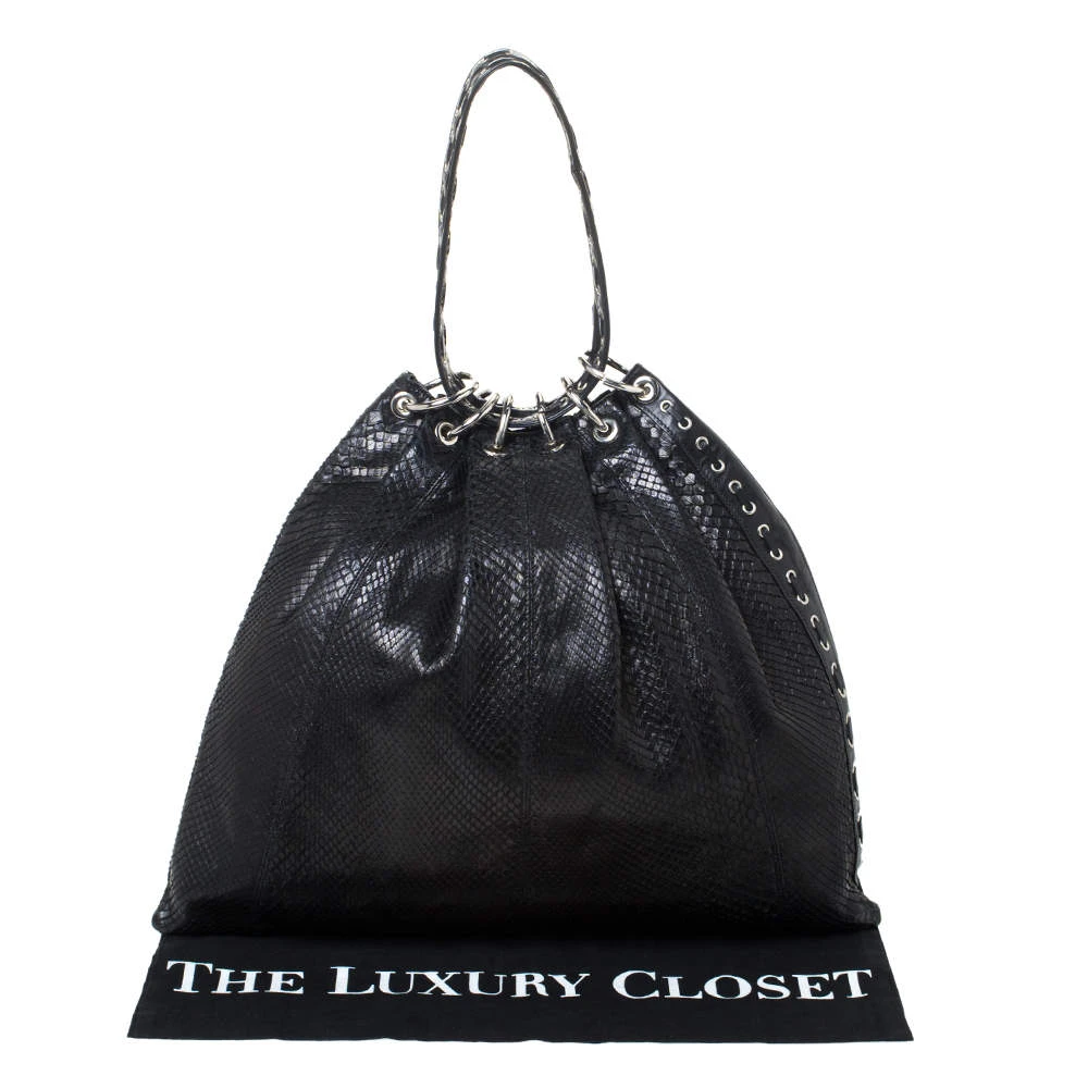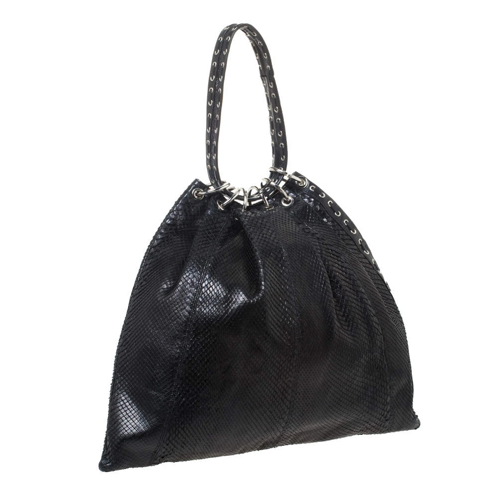 This Versace satchel is designed to deliver exquisite looks and lend a hint of distinguished glamour. Crafted meticulously from exotic python leather, it comes in a classic shade of black that will complement a host of ensembles. It is styled with a single handle that is connected to the bag with a series of rings. It is further finished iwth silver-tone hardware detailing that contrast well with the black exterior. It is finished with a spacious satin-lined exterior. (Available for UAE Customers Only)