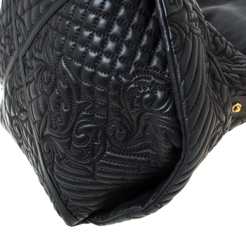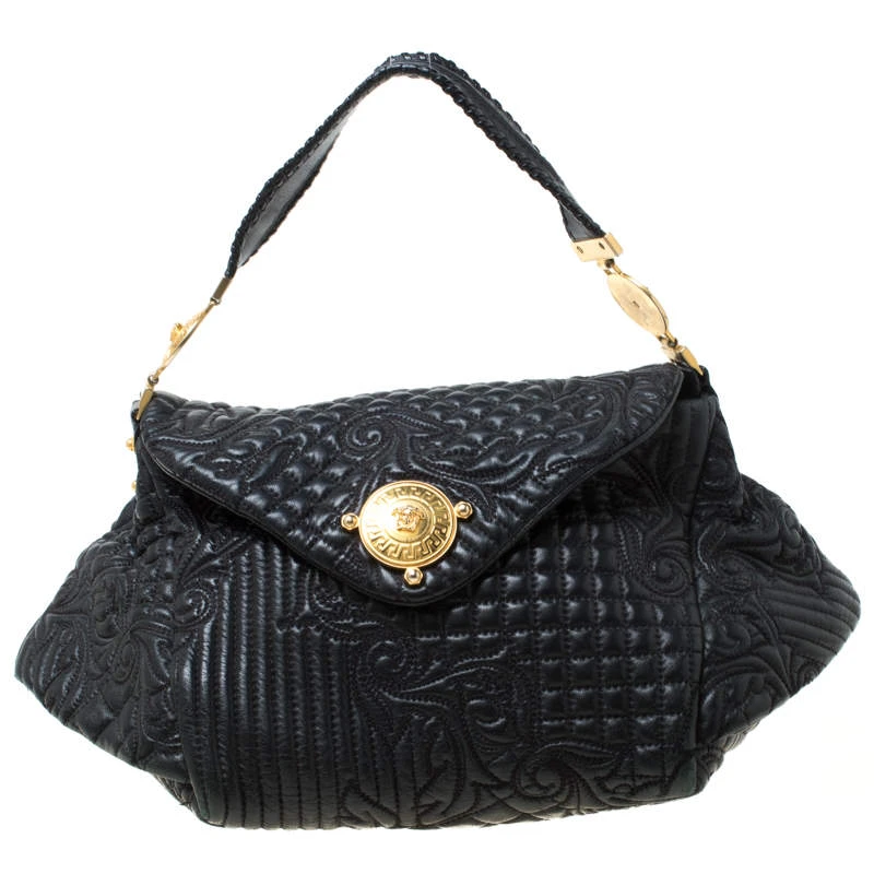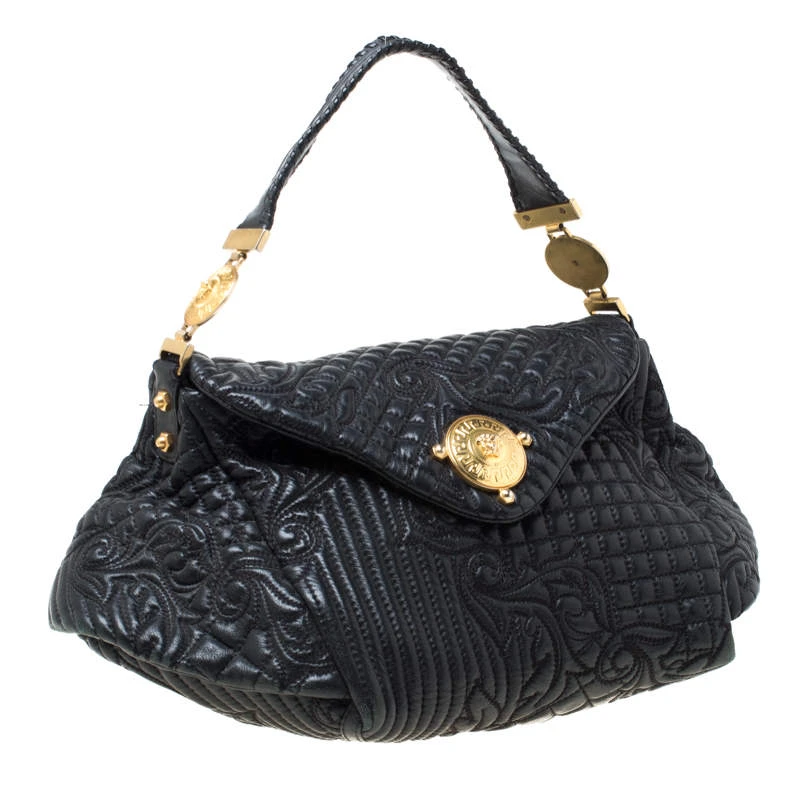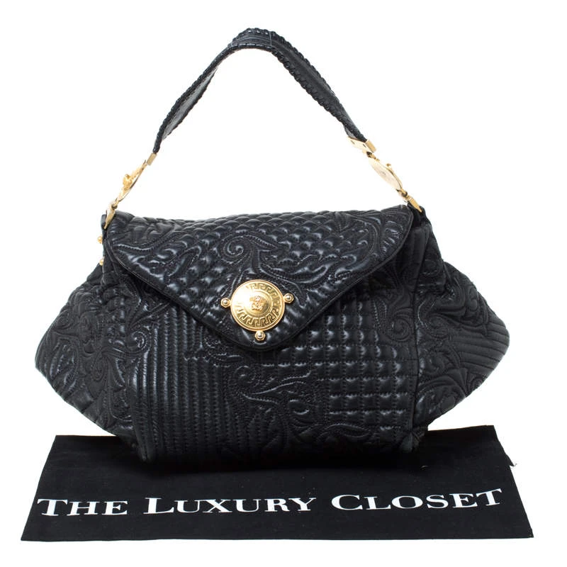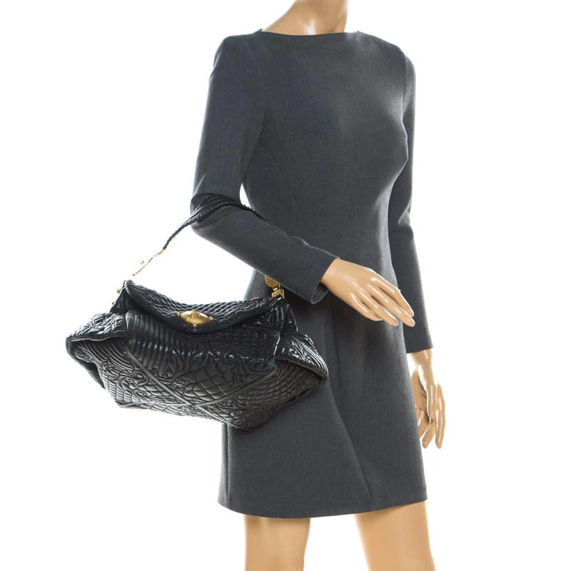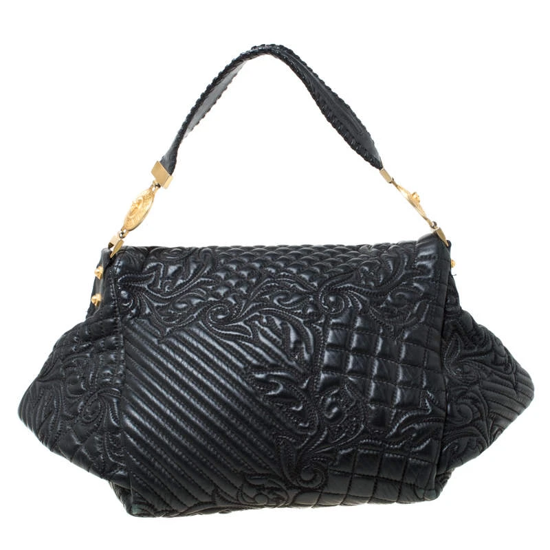 This Versace handbag is meticulously crafted from quilted leather. The Barocco bag delights not only with its appeal but structure as well. It is held by a single handle, adorned with a lovely embroidery all over and equipped with a spacious satin interior. The unique shape, the notable Medusa logo at front in gold-tone, and the impeccable style effortlessly add to the marvel of this coveted piece.