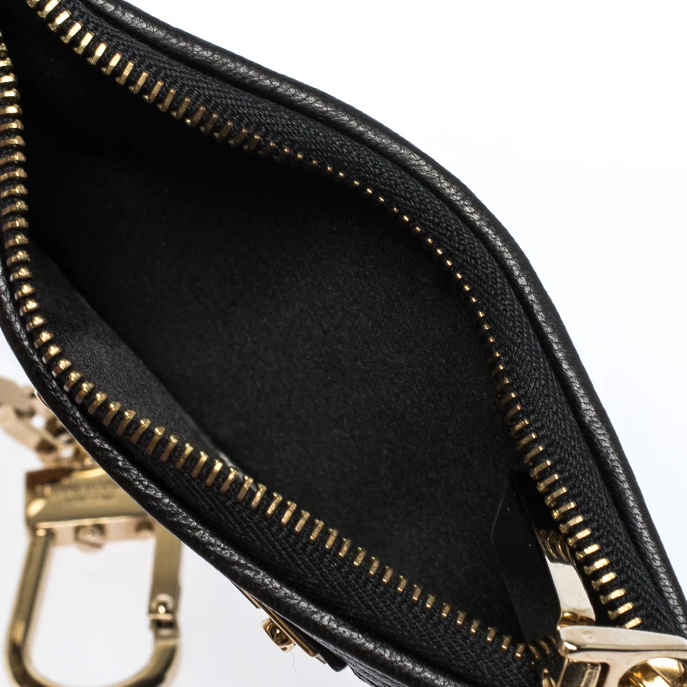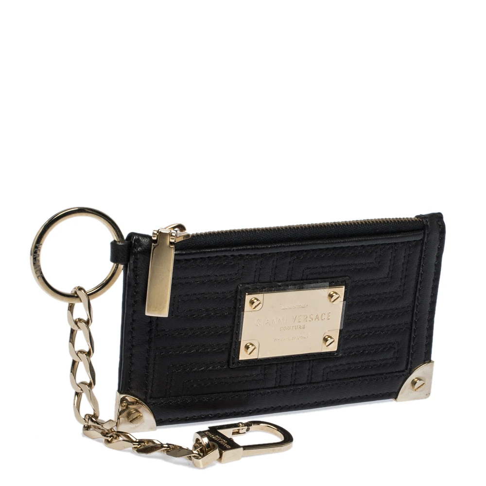 This coin purse is a lovely creation from the house of Versace. Crafted from leather, it is decorated with the brand logo on the front and metal edges. It comes with a zip-secured interior and equipped with a gold-tone chain-link key charm. Amp up your style game with this black, quilted creation.