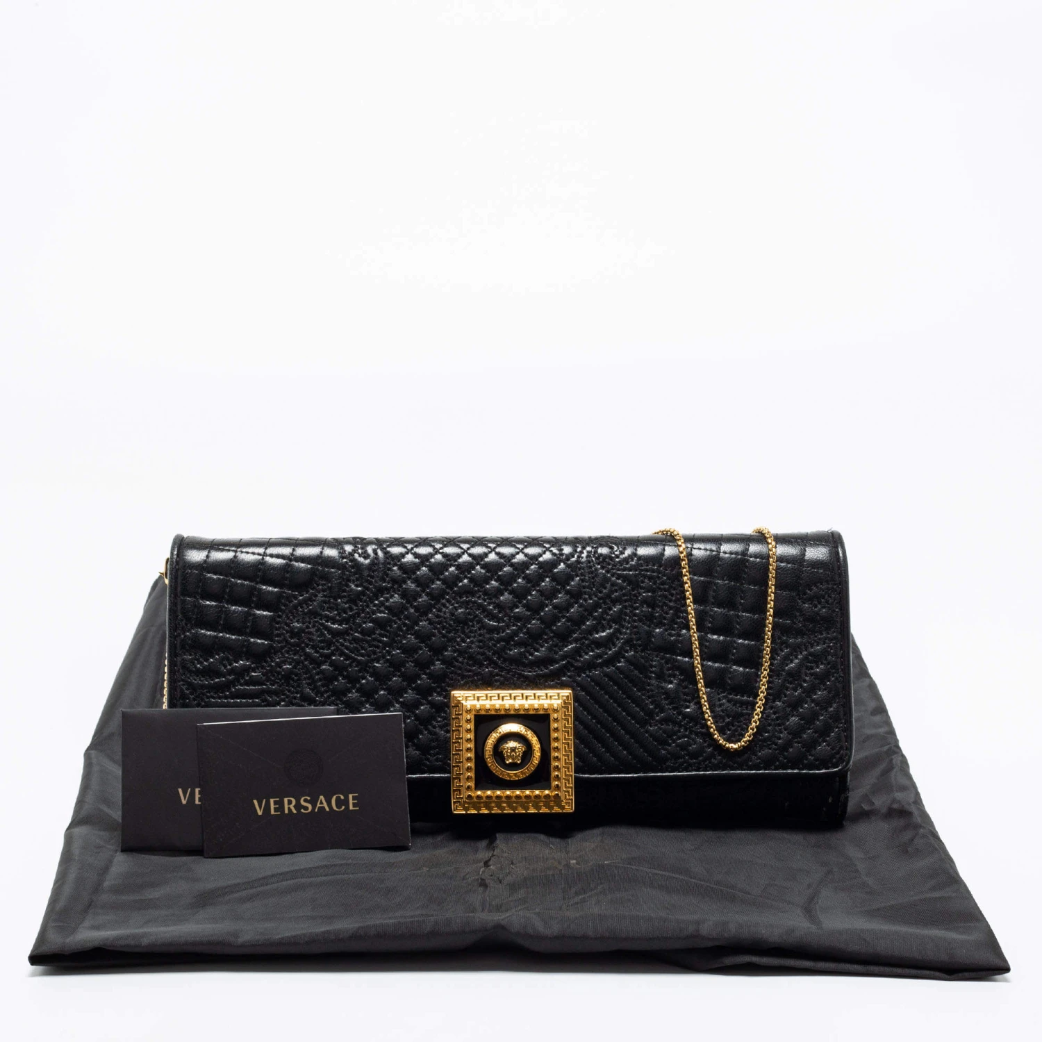 The powerful and unique creations of Versace are admired by the fashion elite of the world for their timeless essence. Created from quilted leather with innovative patterns. it gets a luxe update with a striking Medussa motif on the front and can be carried around with a chain link. The satin-lined interior of the clutch will keep your party essentials in a stylish way.
