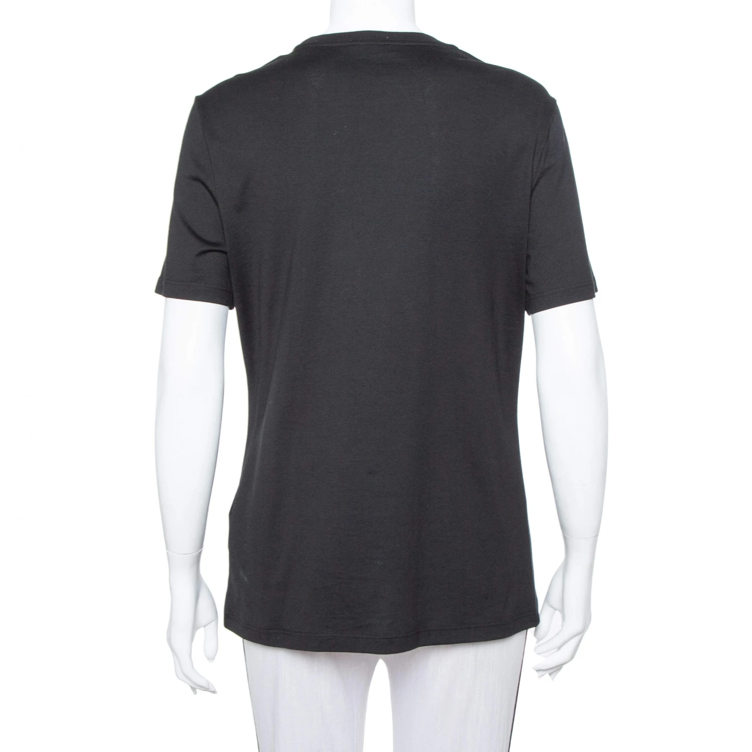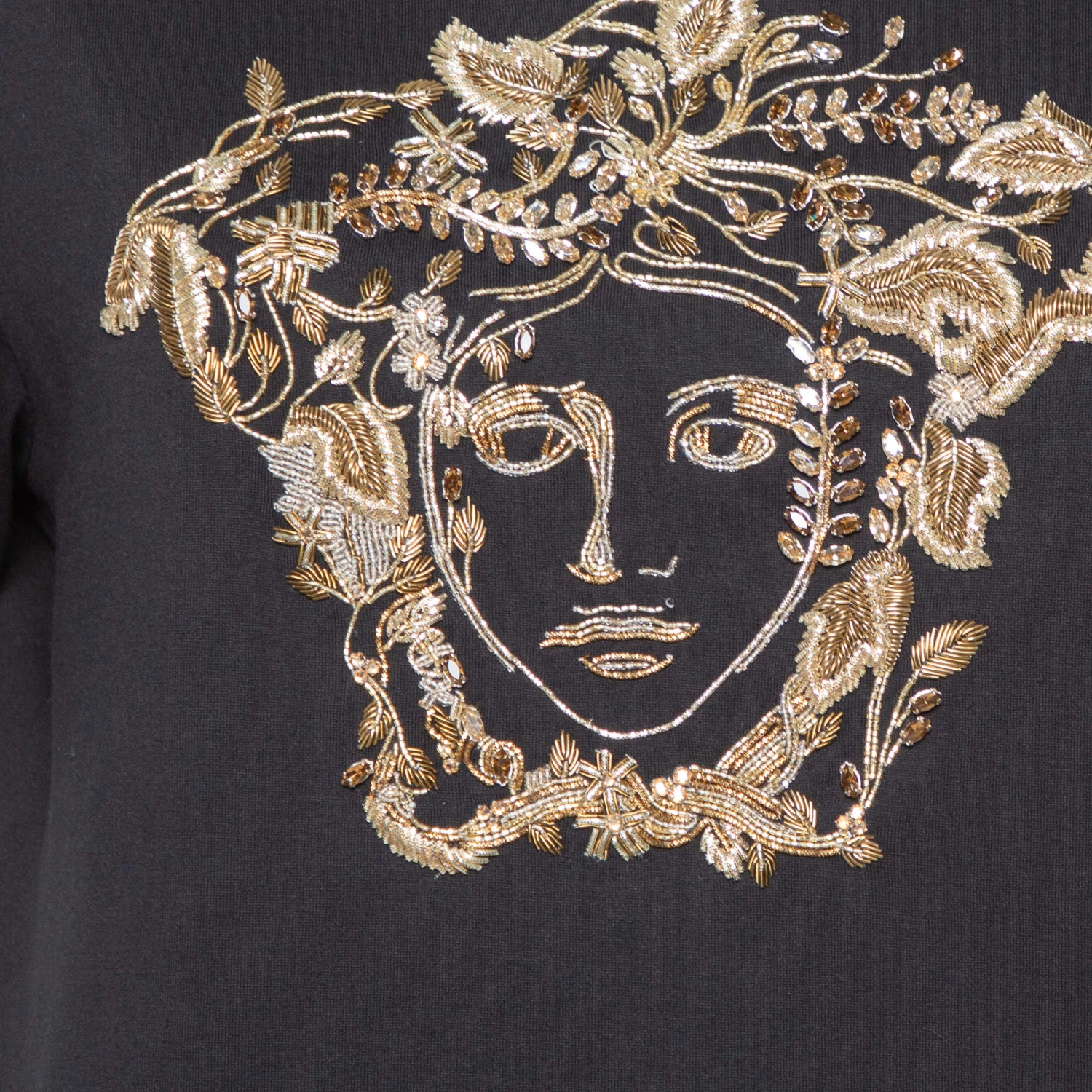 Blending contemporary aesthetics with timeless styles, creations from Versace are amazingly stylish. This black T-shirt comes made from 100% cotton and exhibits the iconic Medusa logo at the front, beautifully embellished with rhinestones. It flaunts a crew neck and short sleeves. Sure to lend you a fantastic fit, it will look great with distressed denims and pointed stilettoes.