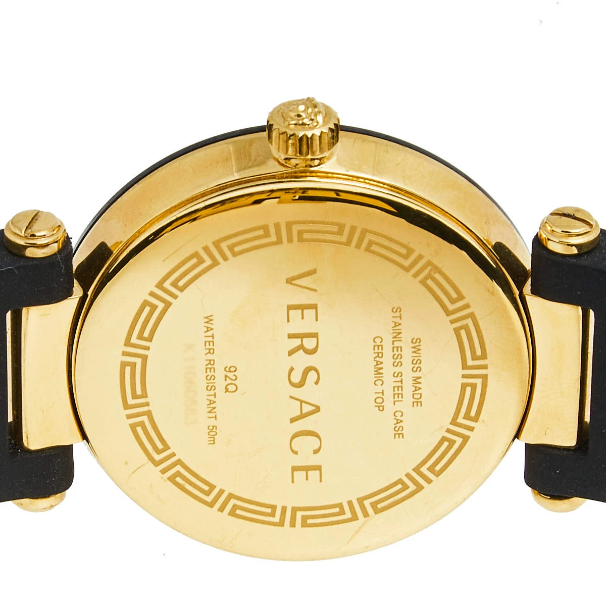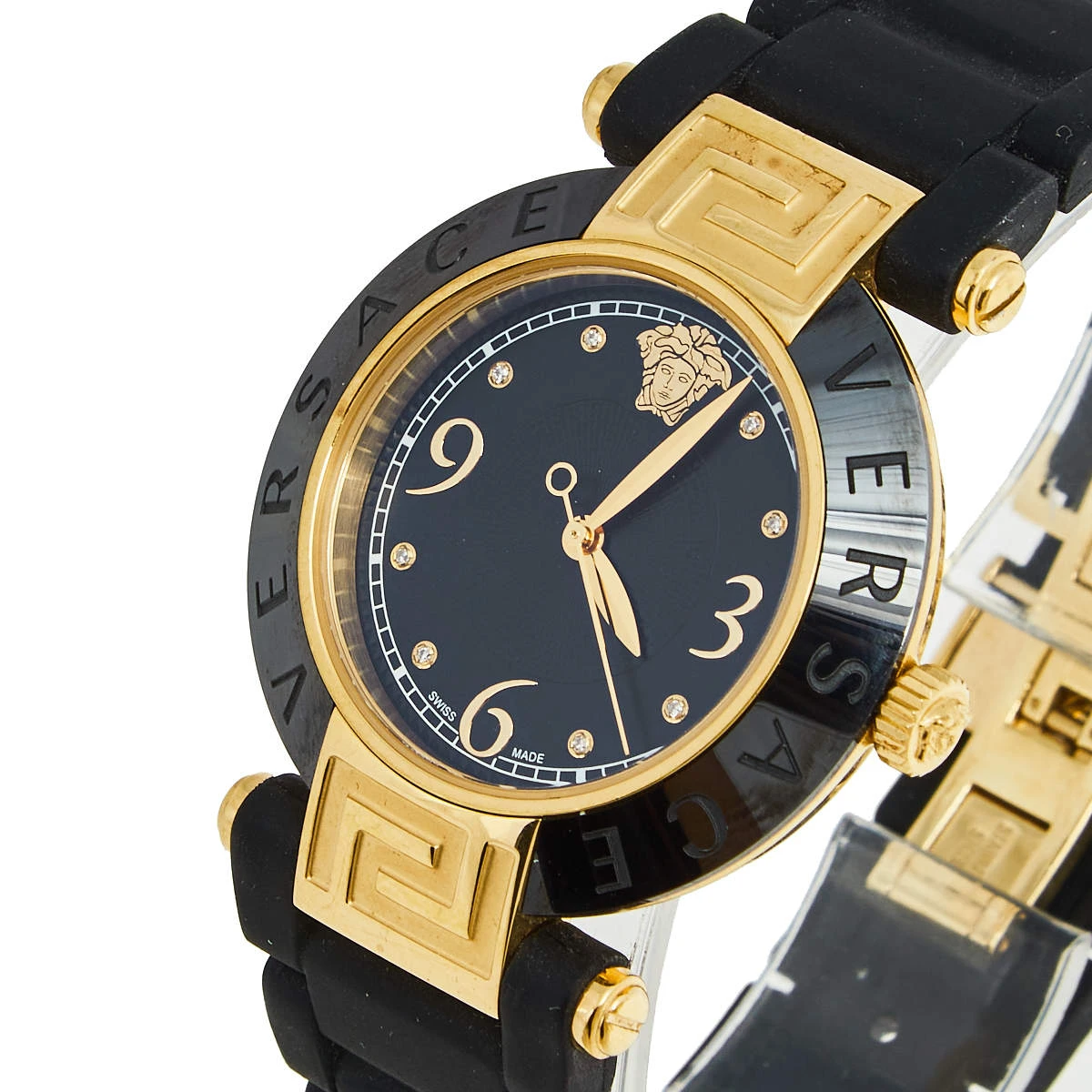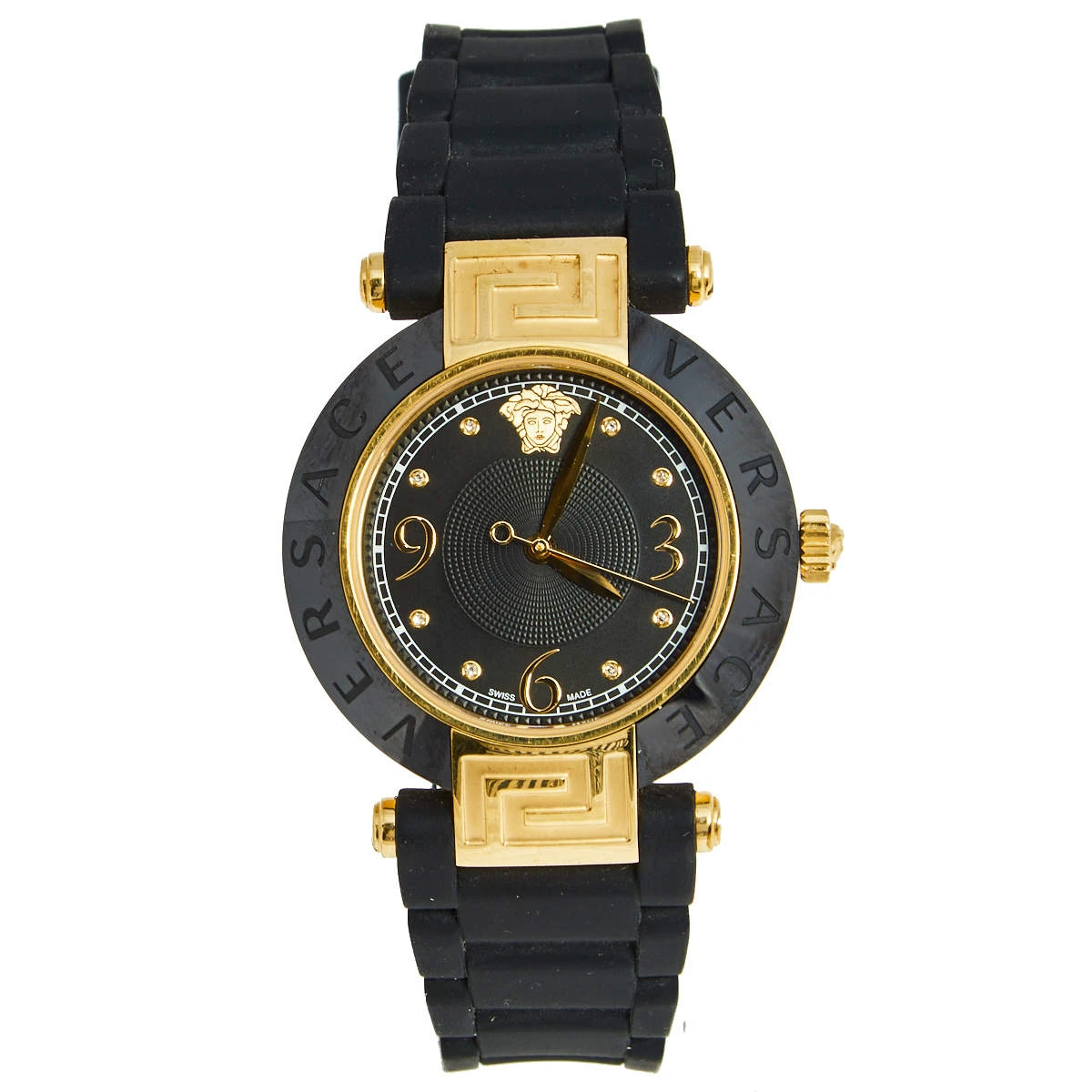 This Versace quartz watch is an ideal choice for everyday use. Made from rose gold-plated stainless steel, it features a ceramic bezel, a round case set with a black dial, and a comfortable rubber bracelet.