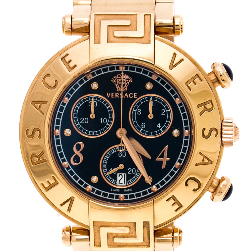 Pamper yourself with this gorgeous gold-plated steel Versace Aion watch featuring quartz movement with chronograph and date complication. Gorgeous and stylish with an engraved bezel, the watch features a black dial, 50 meters of water resistance and push-button clasp.