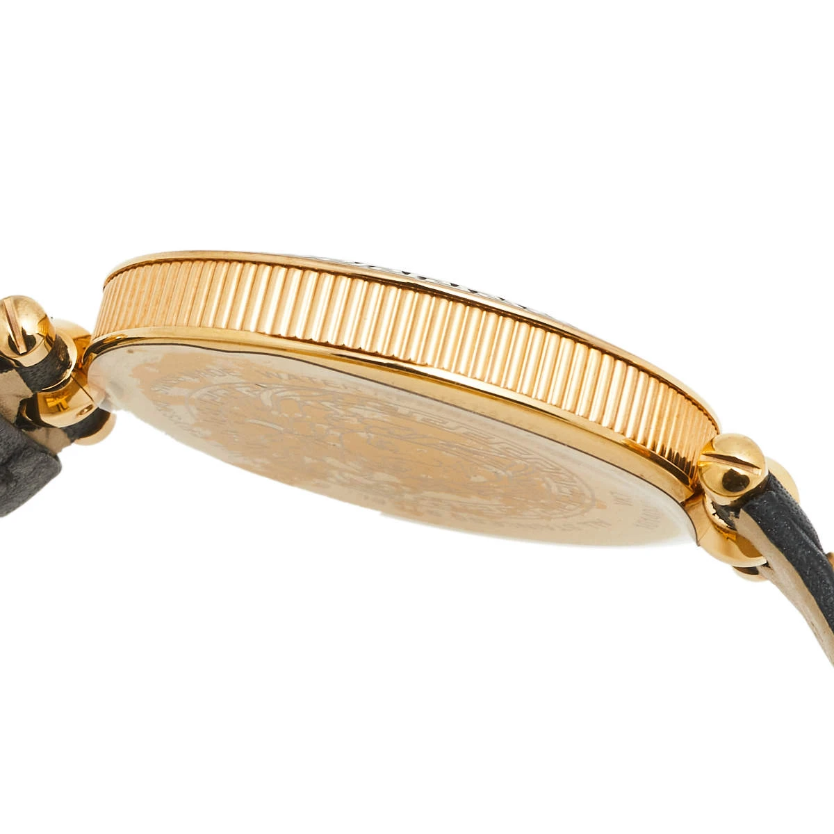 This wristwatch is a member of the famous “Vanitas” collection from Versace. The black and gold colors on this watch create a hard-to-miss look. The watch is made from stainless steel and held by quilted-studded leather straps. The bezel features Greca engravings and the baroque-inspired dial continues the theme of gold studs and the instantly recognizable Medusa logo. It is secured by an engraved clasp fastening.