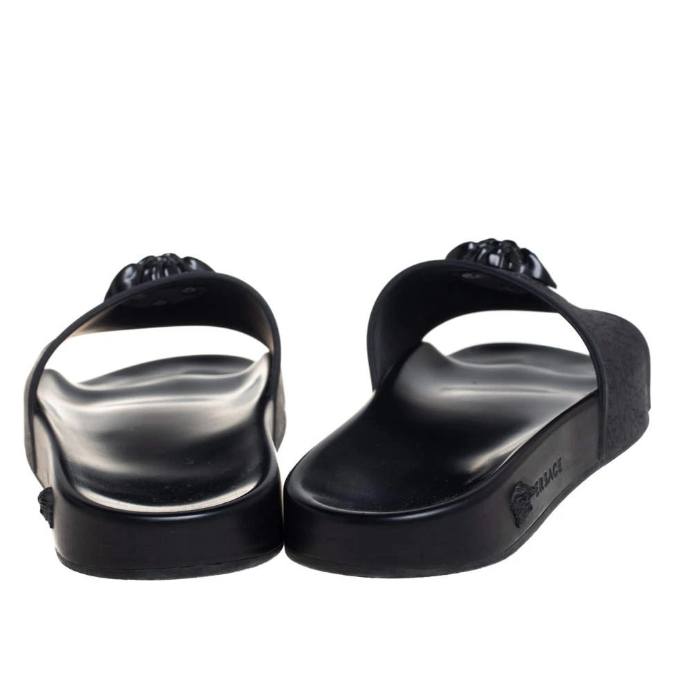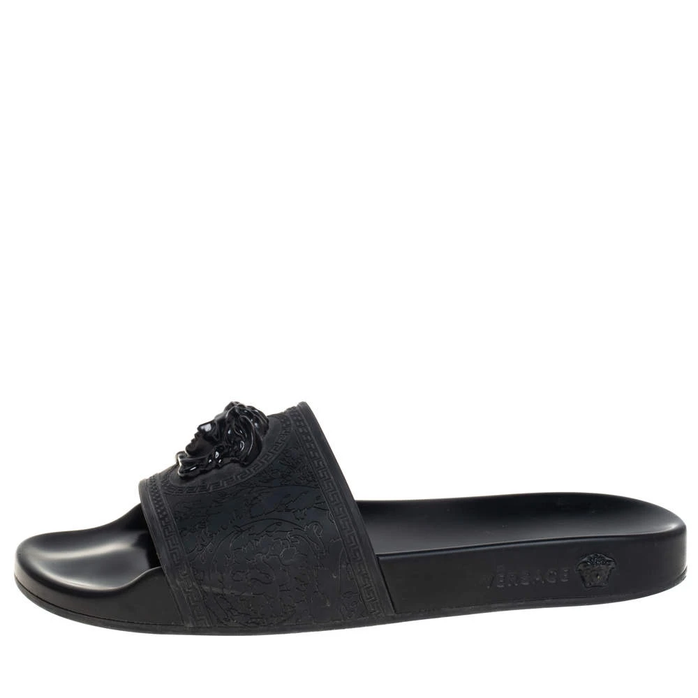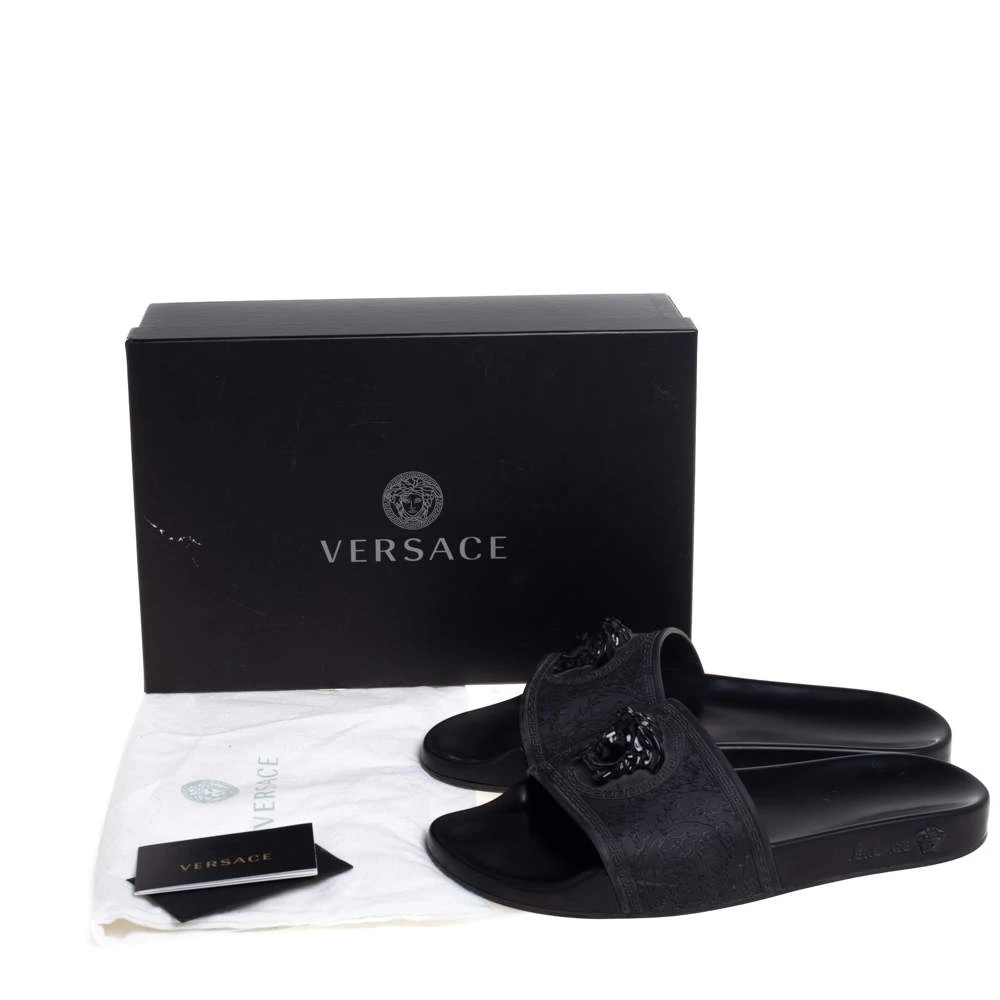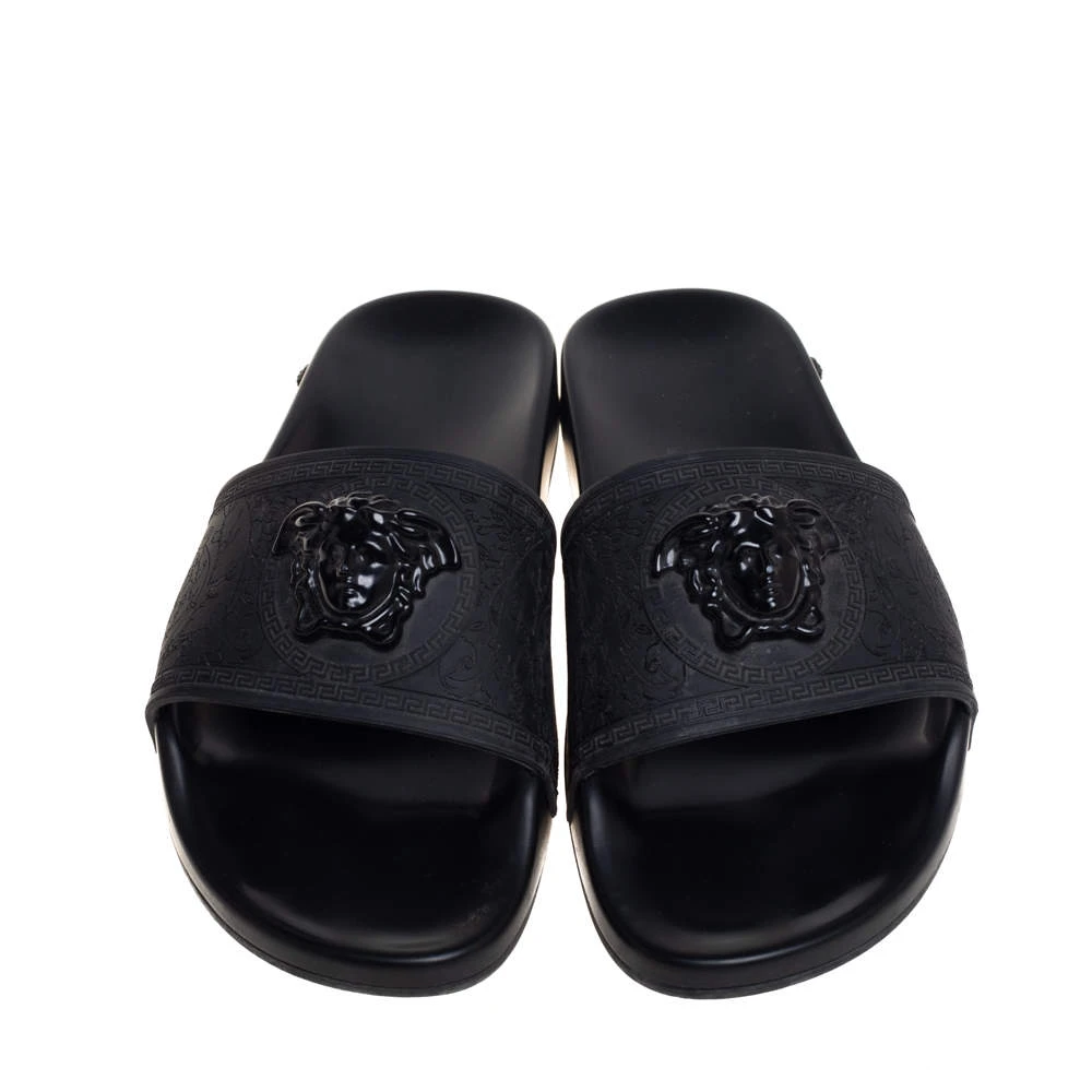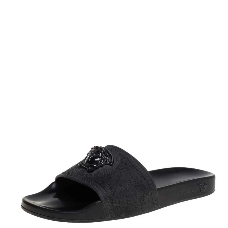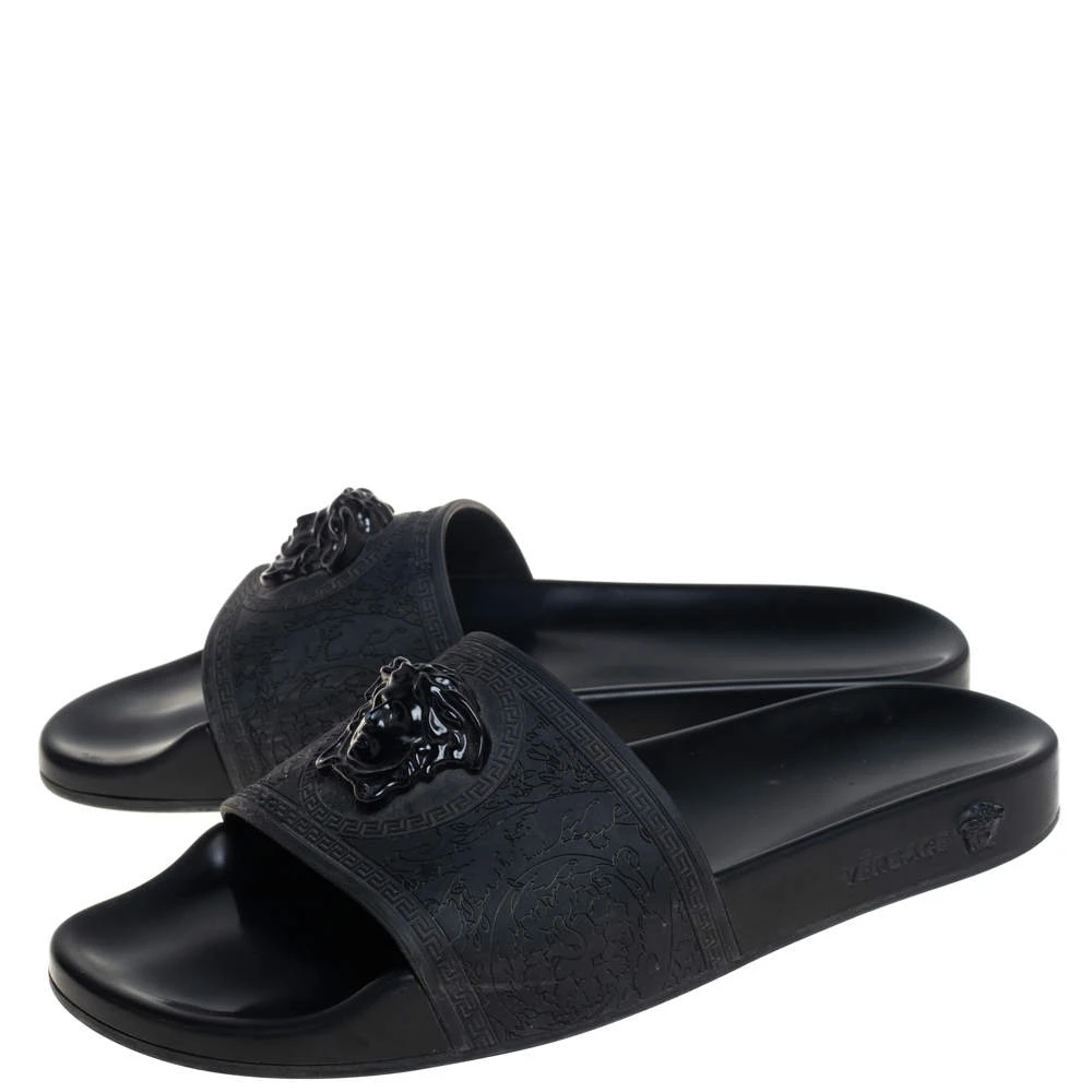 Comfort and high-fashion come to you in a luxurious wave with this pair of slides from Versace. They’ve been crafted from rubber and detailed with the signature Medusa logo on the front. The pair in black is water-friendly and stylish.