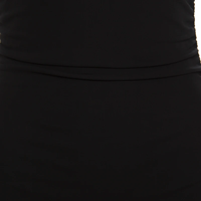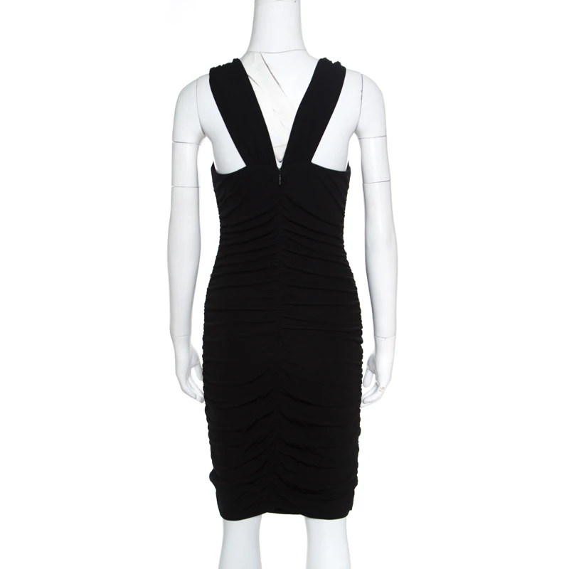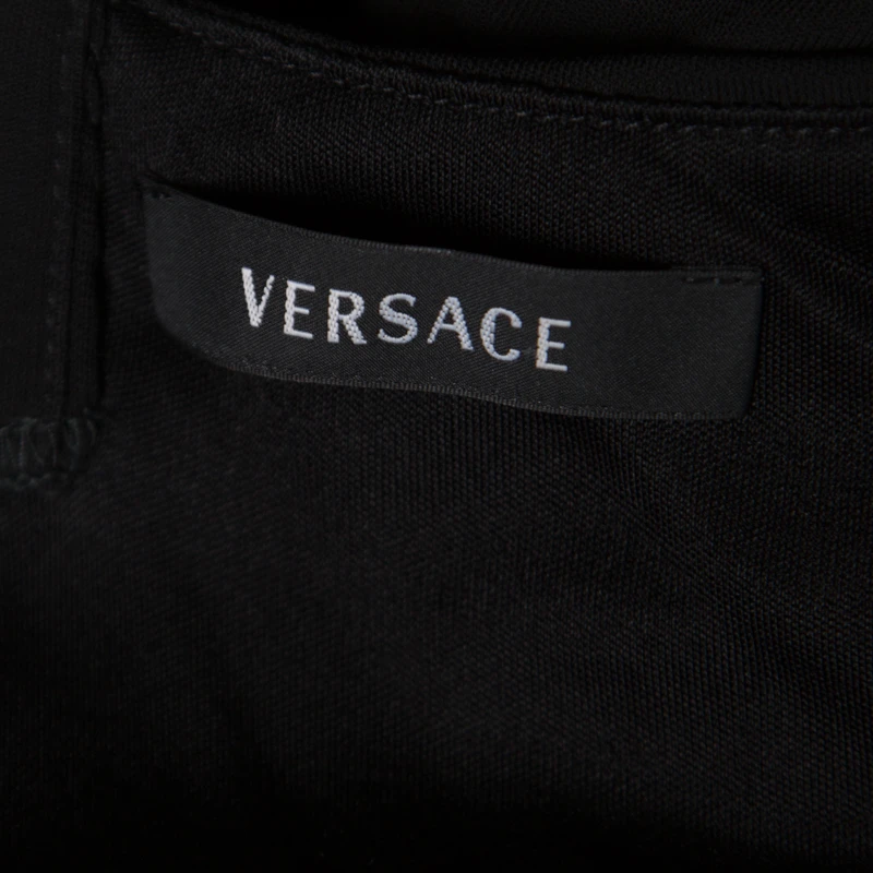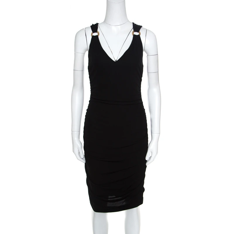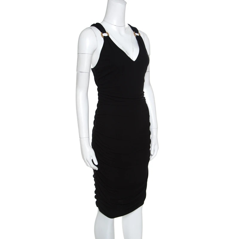 This lovely bodycon dress from Versace strikes a perfect balance between pure elegance and unbeatable style. The black creation is made of 100% viscose and features a flattering ruched silhouette. It flaunts a deep V-neckline, shoulder straps with gold-tone metal ring detailing and a concealed zip closure at the back. Pair it with pointed stilettoes and a trendy sling bag to rock a fashionable event.