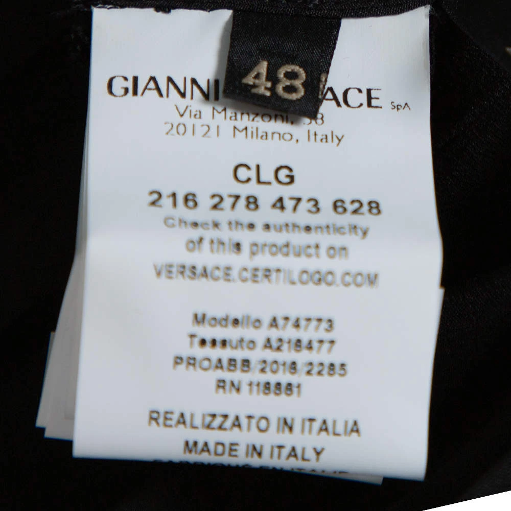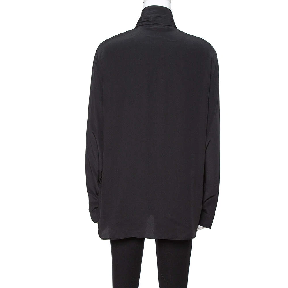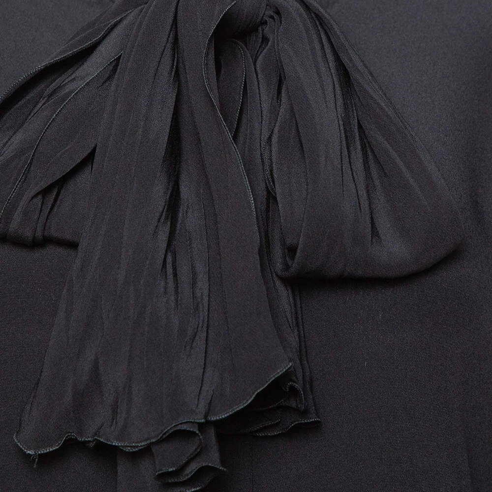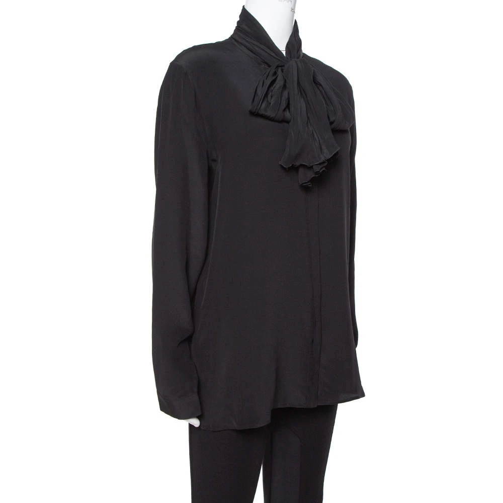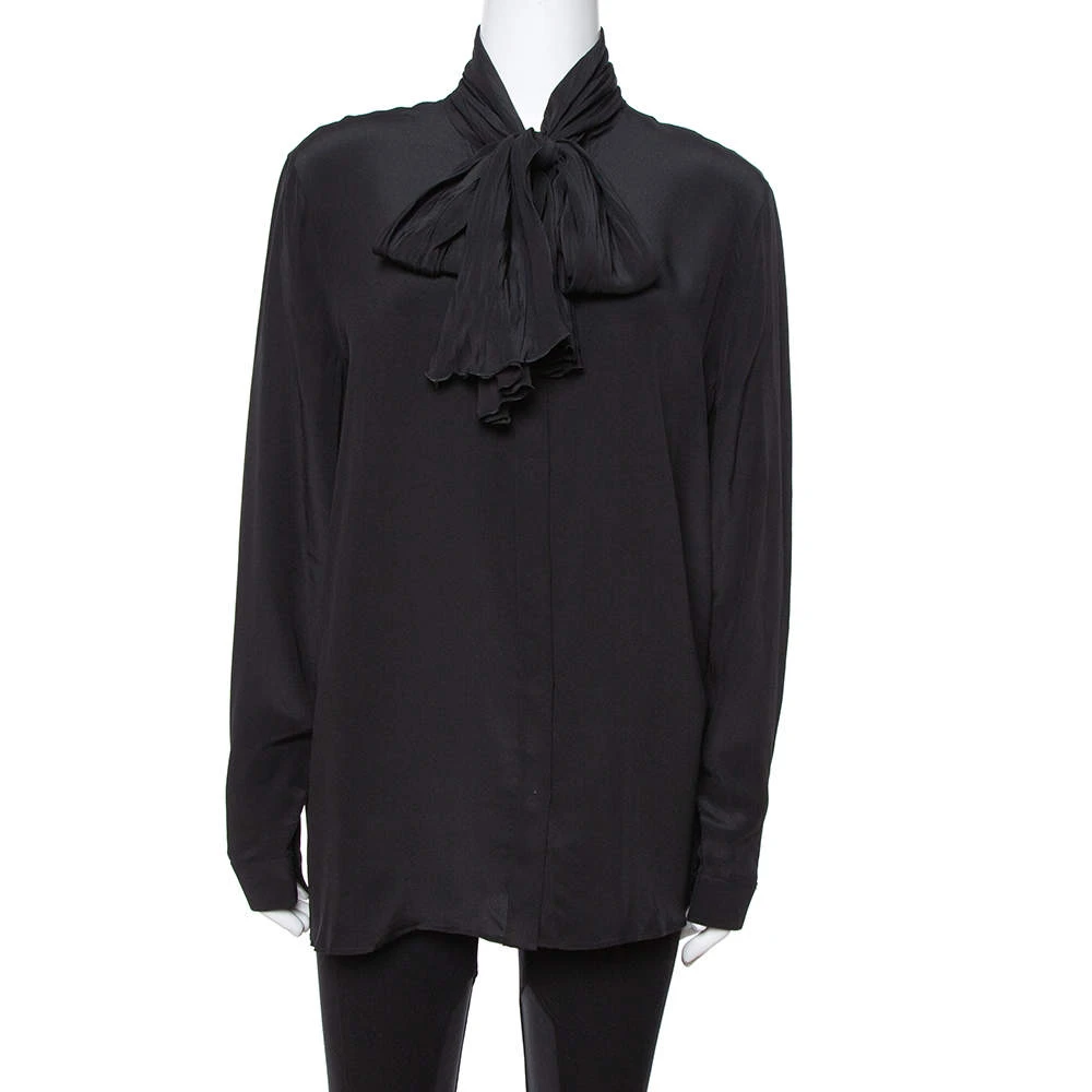 Include this stylish blouse from Versace in your closet to introduce a chic piece into your formal ensemble. Tailored in silk, this lovely black blouse carries tie detail at the neck, a buttoned front and long sleeves. This one will look great when paired with statement pants and high heels.