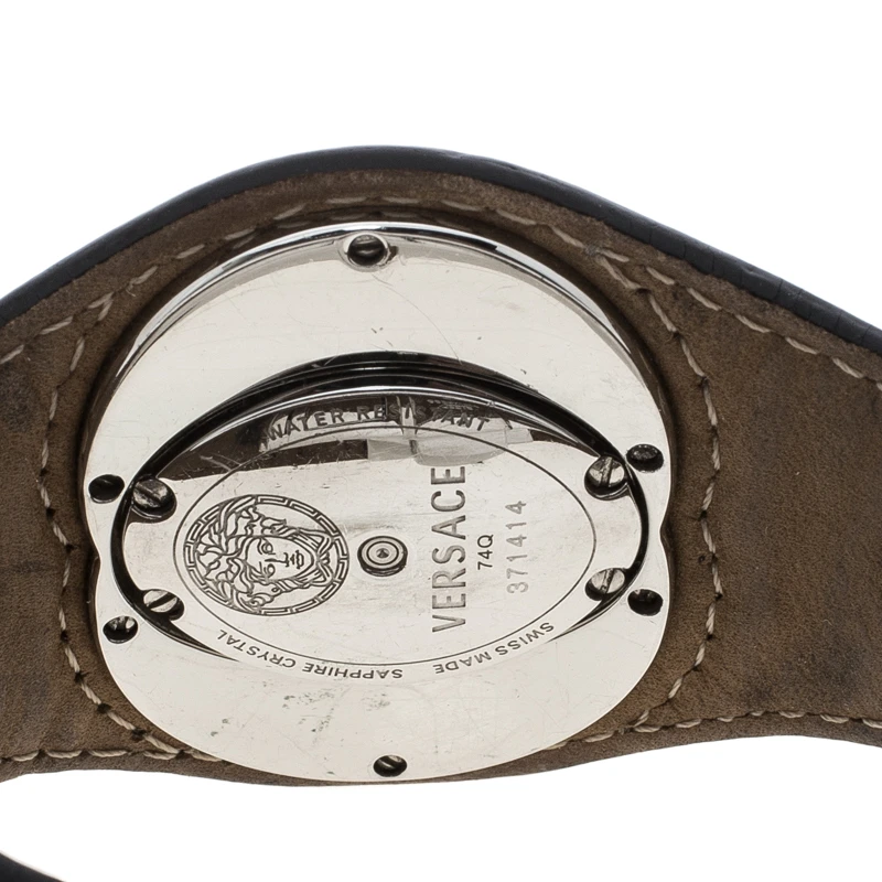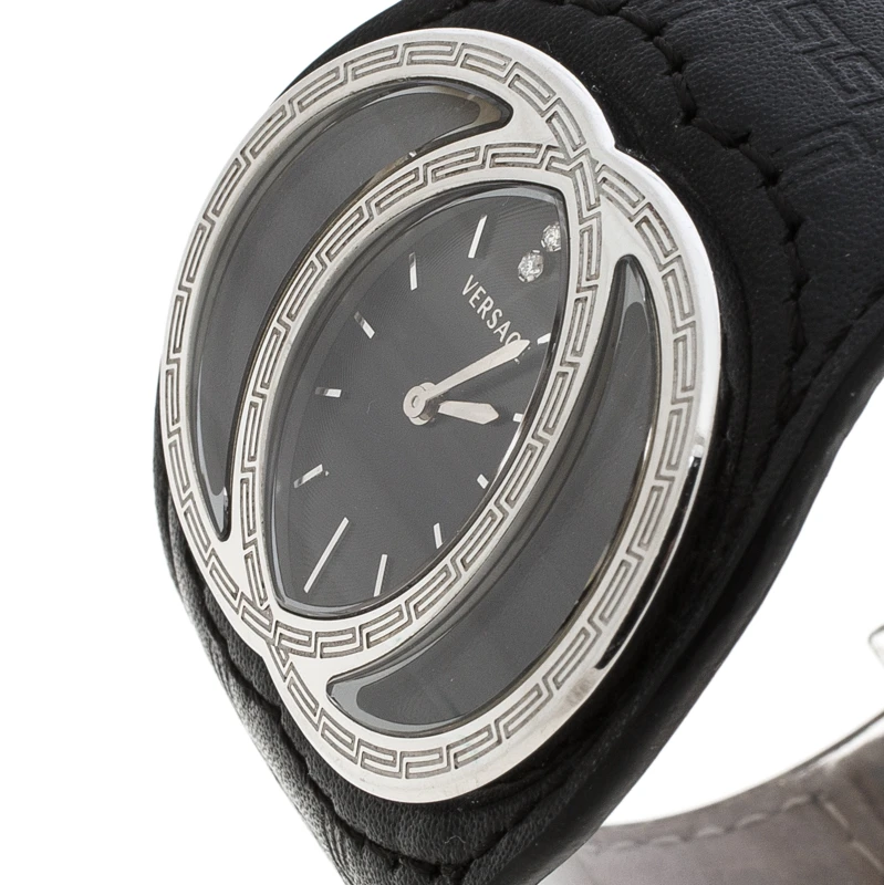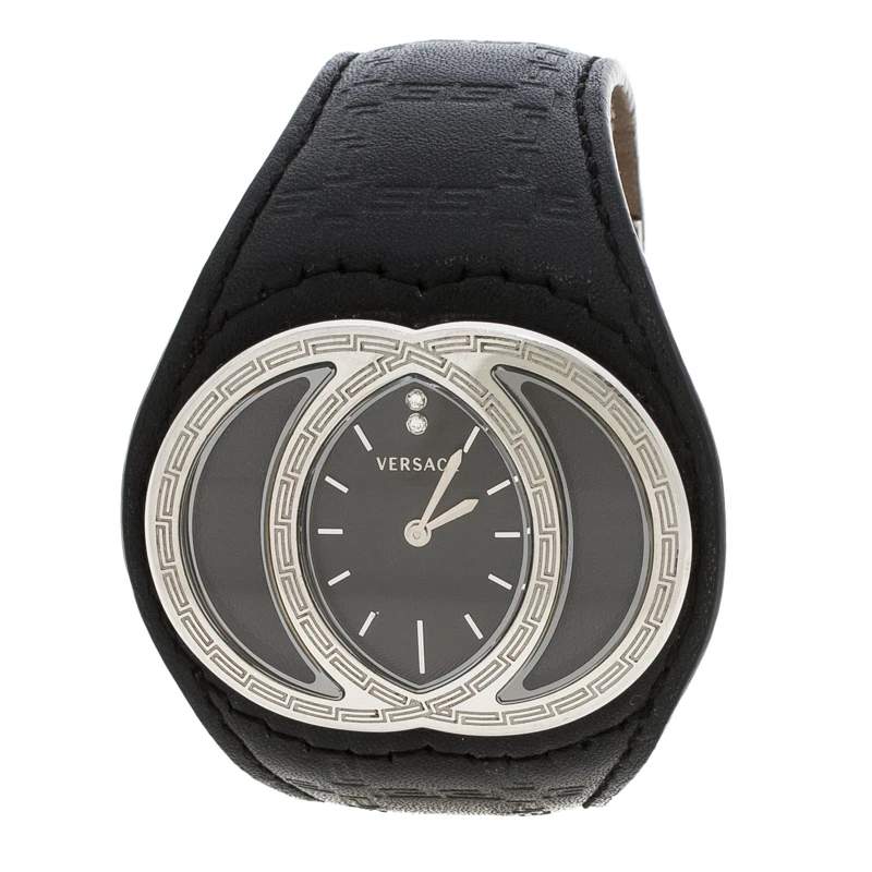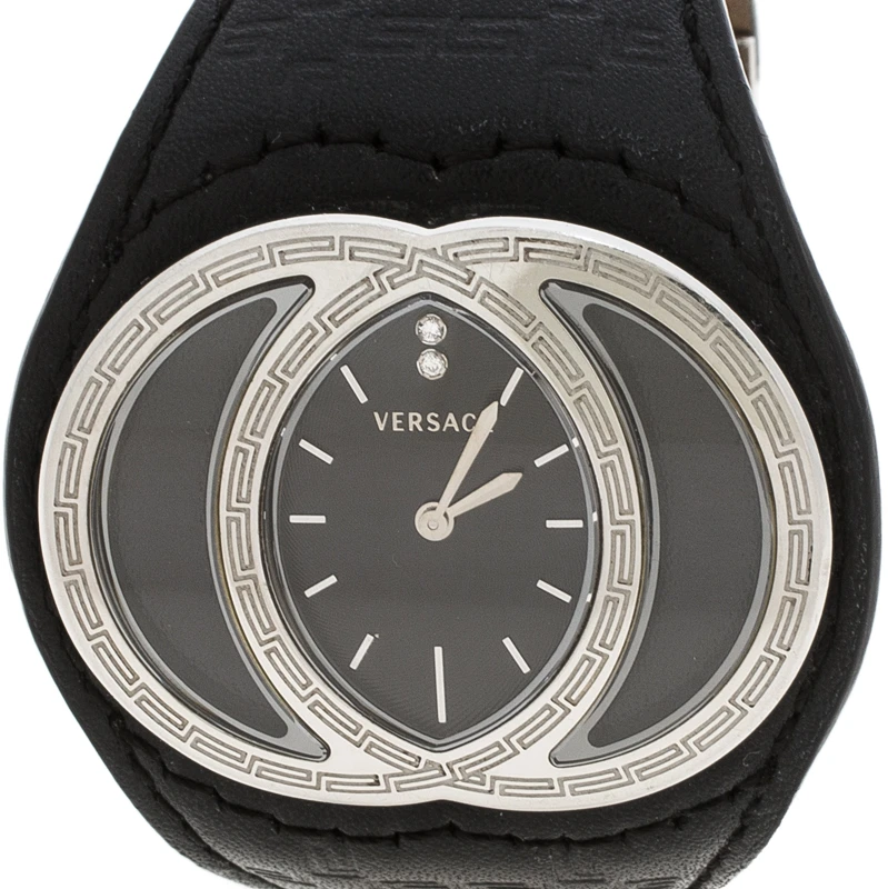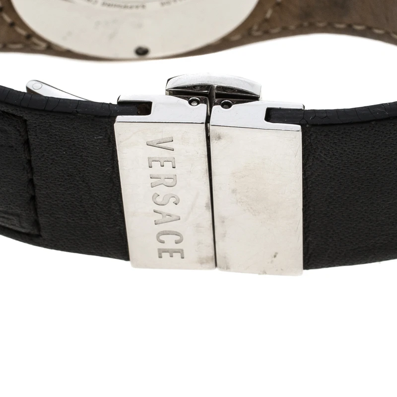 Pair this Versace wristwatch with your casual outfits for a sleek finish. This watch comes with a stainless steel interlocking bezel, index markers and the Versace brand name. The leather strap fixes on the wrist with a deployment clasp closure. The guilloche dial is protected with sapphire crystal glass and houses two diamonds.