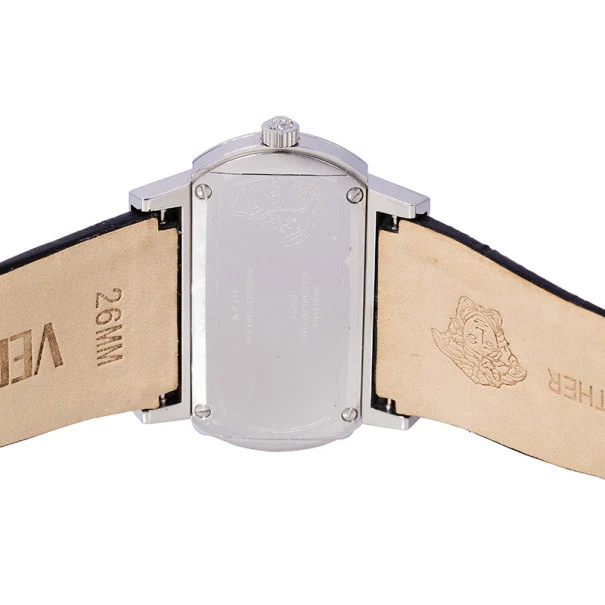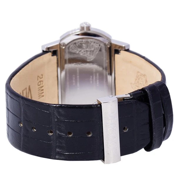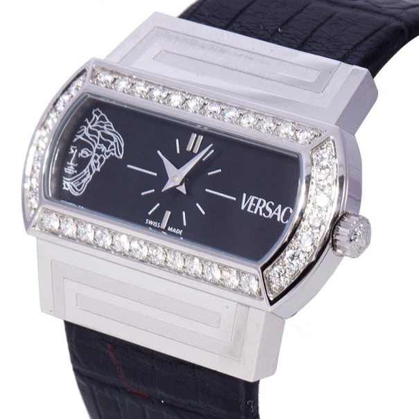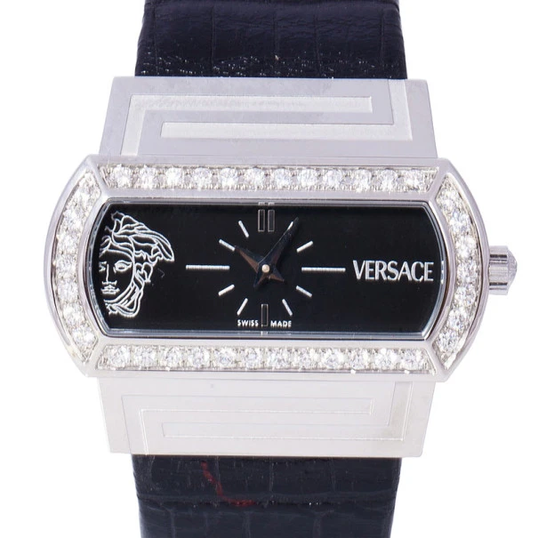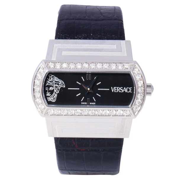 Stand out with this slick Versace wristwatch. Made from stainless steel, the horizontal oval case holds a beveled diamond bezel engraved with the meander pattern on the top and bottom sides. Its black dial is contrasted with silver hour indexes and indicators at the 6 and 12 o’clock matching with the pointed hands. Its right and left sides hold the Versace logo and an outlined design of the Medusa insignia. Featuring a 30m water resistance level, this quartz watch has a wide and embossed leather band with an engraved buckle closure.Original Retail Price: US $3,106