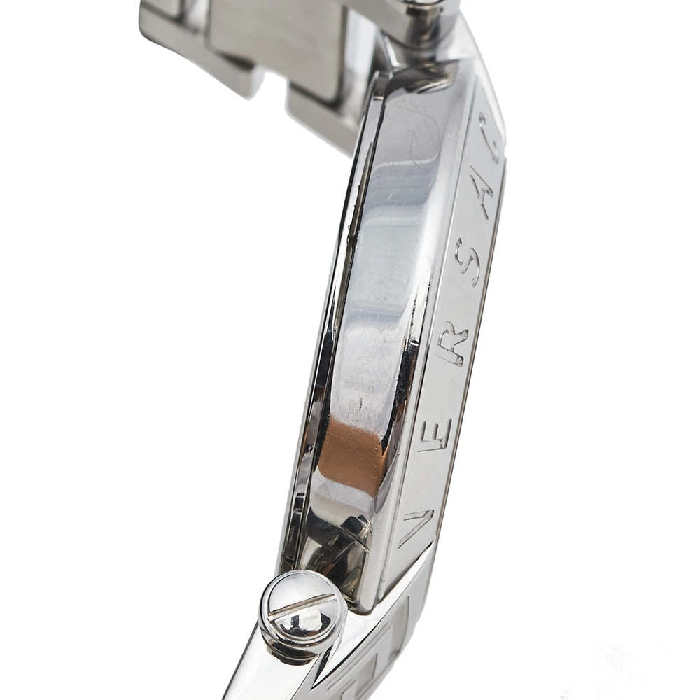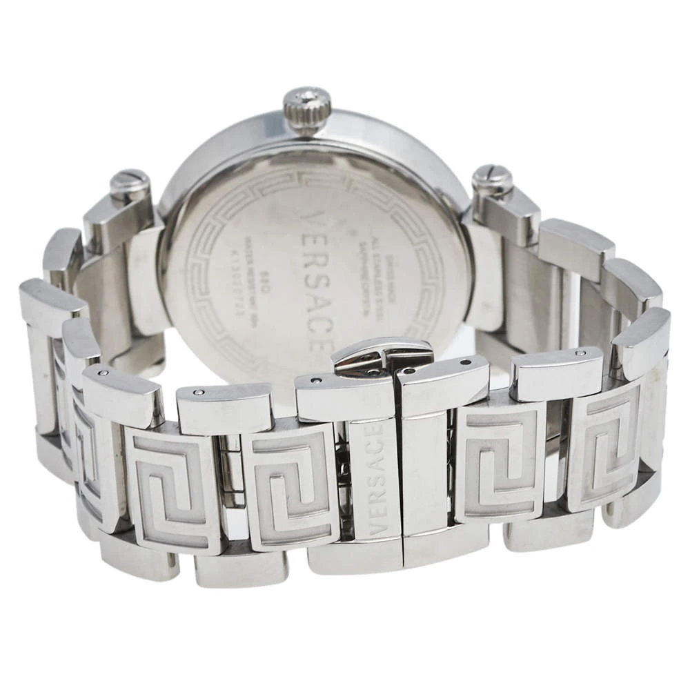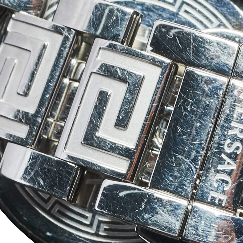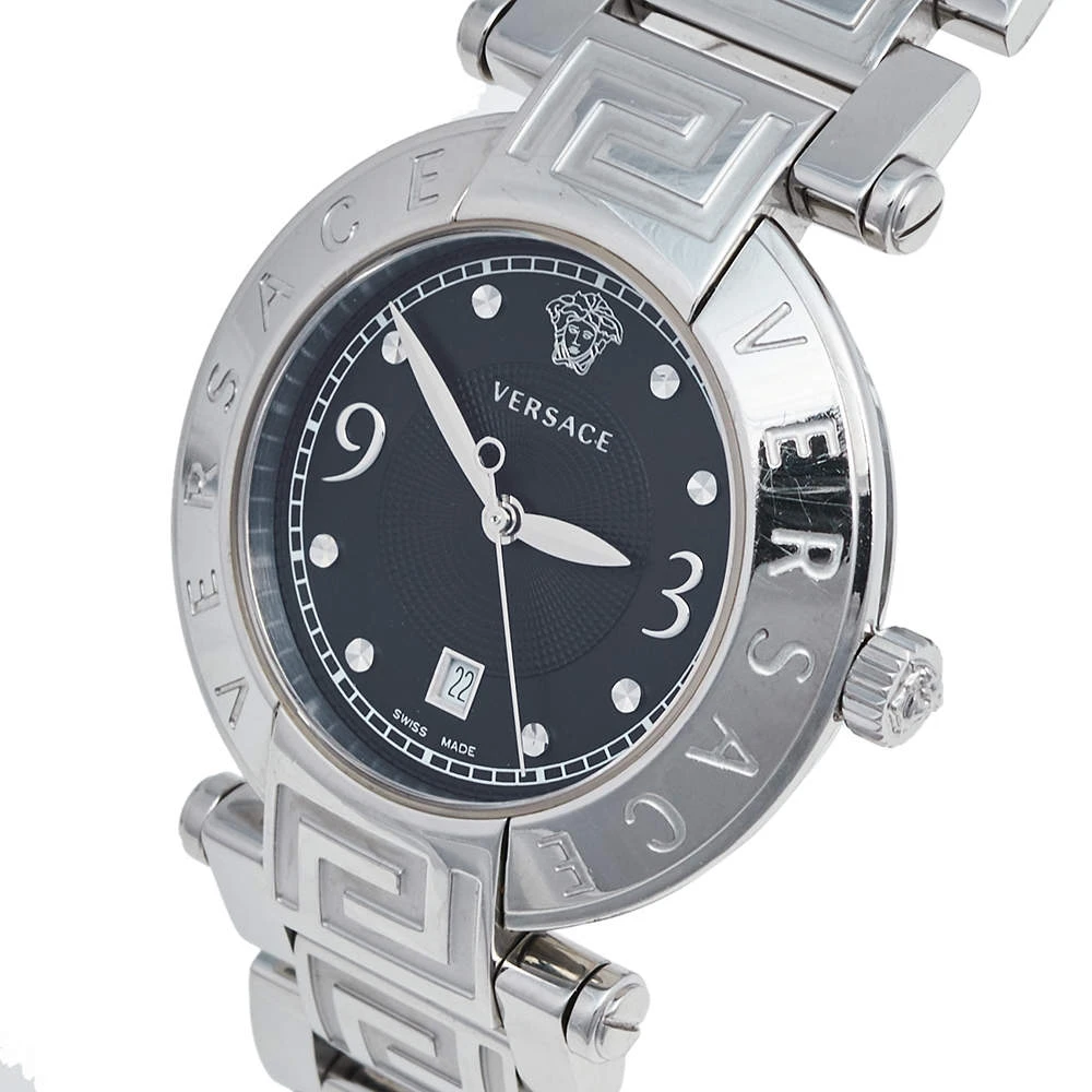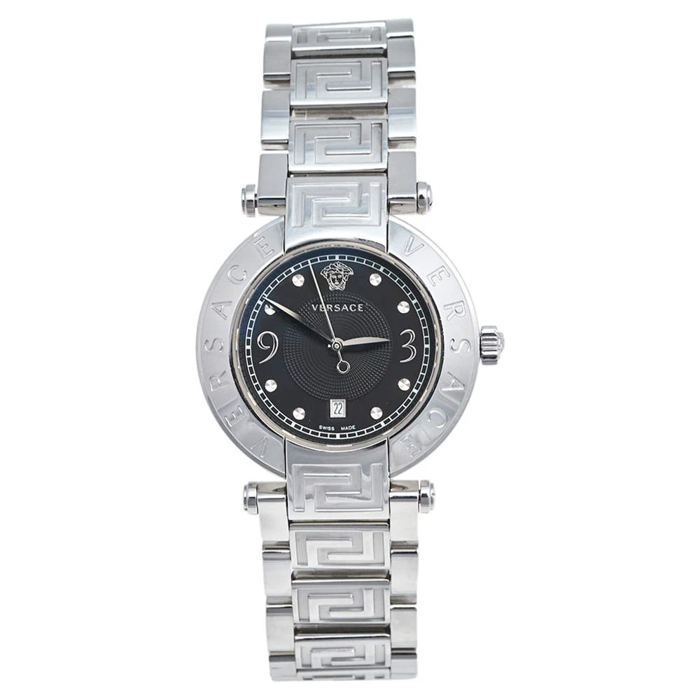 Beautifully designed with the signature Greca pattern of Versace, this Reve timepiece is perfect to add a distinctly stylish and luxurious look. Constructed in stainless steel, this watch features a brand-name carved bezel and black dial with a date window and the Medusa logo to complete the look.