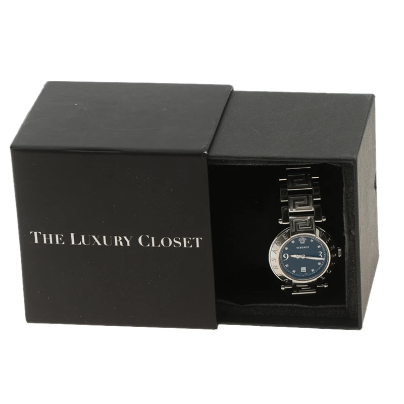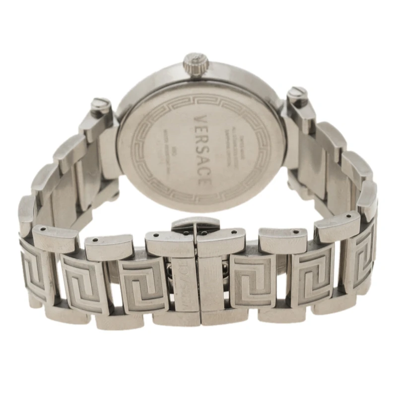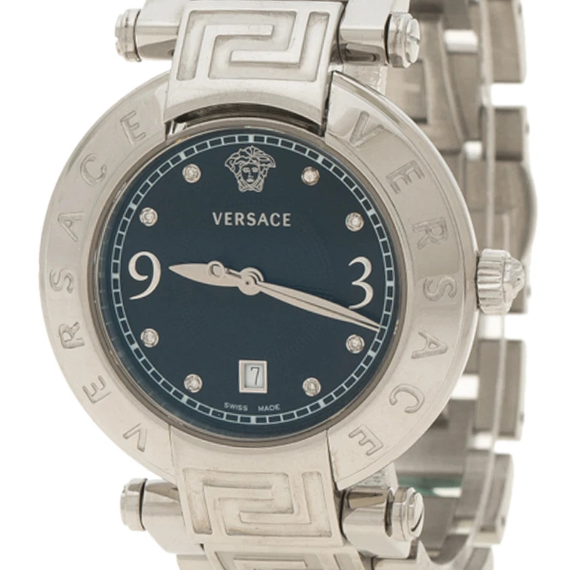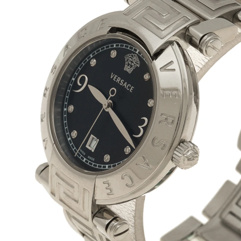Beautifully constructed in the most eye catching patterns from the house of Versace, this Reve timepiece is perfect to add a distinct stylish and luxurious look. Constructed in stainless steel, this watch features a brand name carved bezel and black dial with diamond studded hour markers to complete the look.
