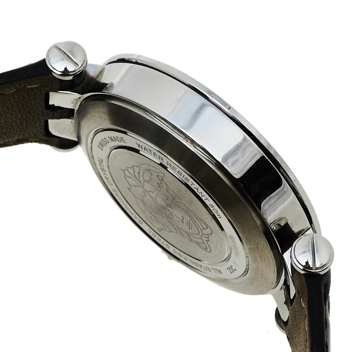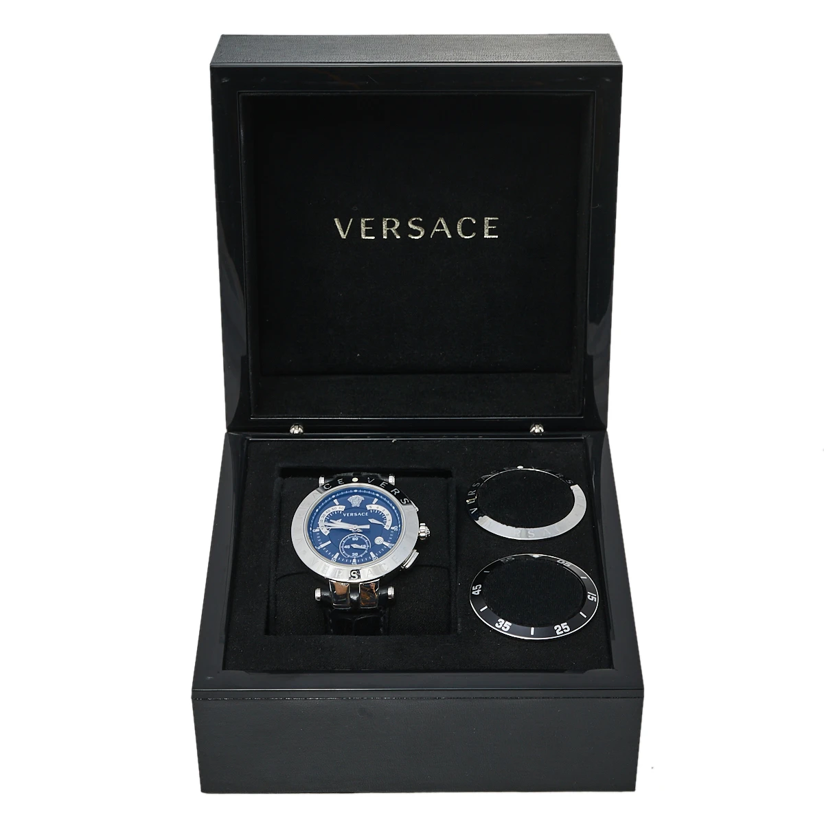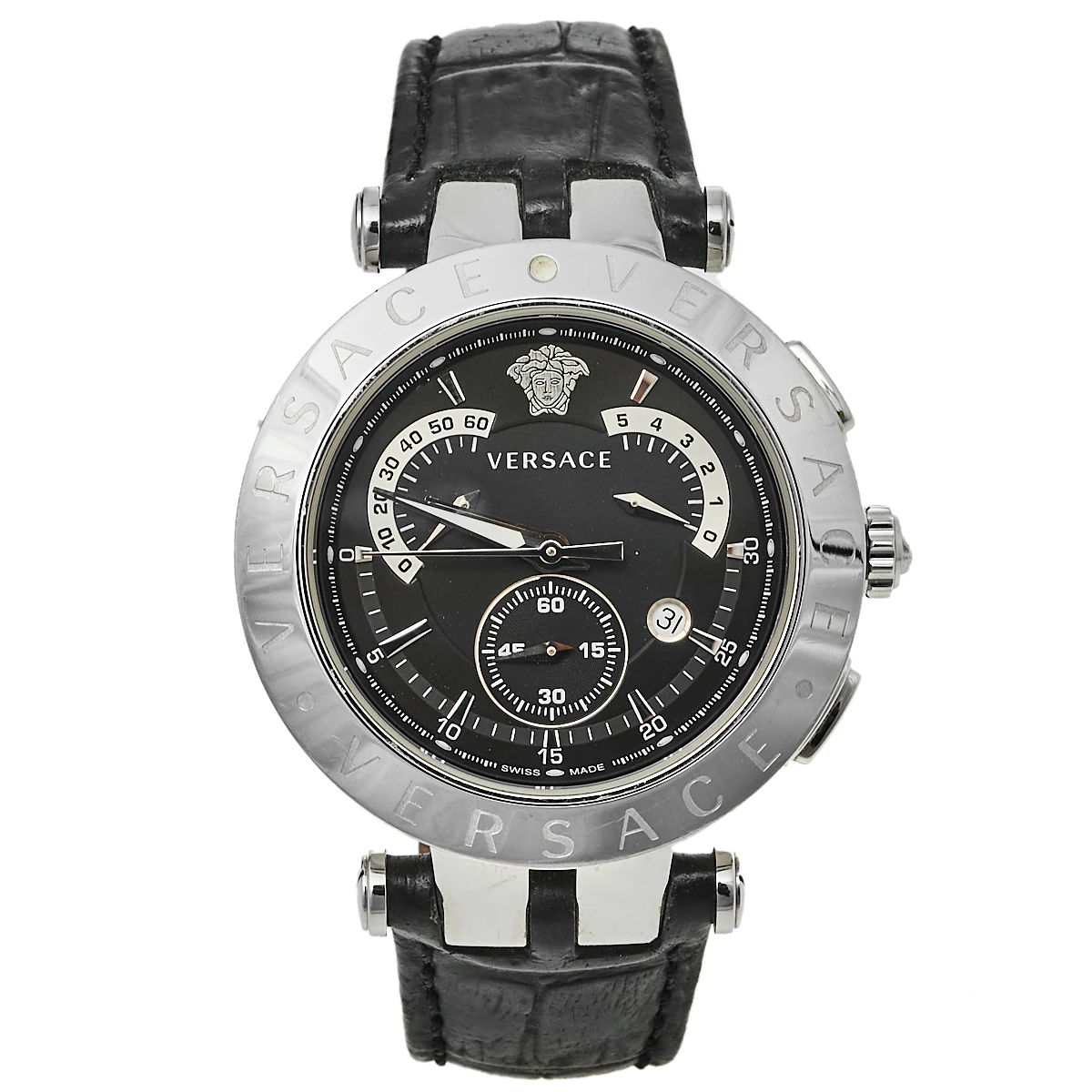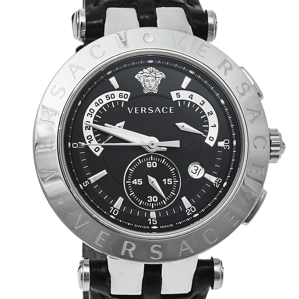 The interchangeable bezel accented with signature details is the highlight of this watch from Versace. This elegant wristwatch has a round stainless steel case that is held by leather straps, secured by a simple closure. The round dial is adorned with index hour markers, three sub-dials, and a small date window at the 4 o’clock position. Make this timepiece your everyday style companion.