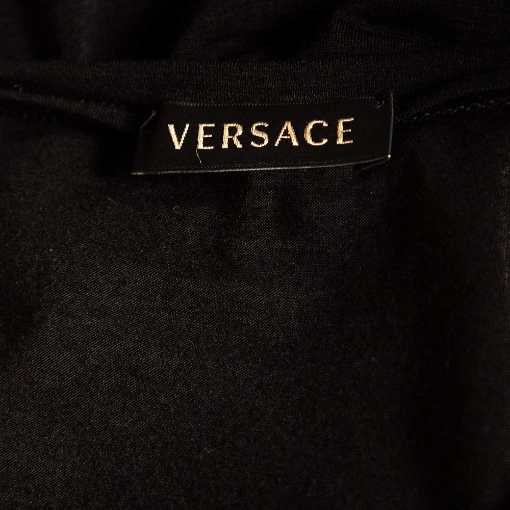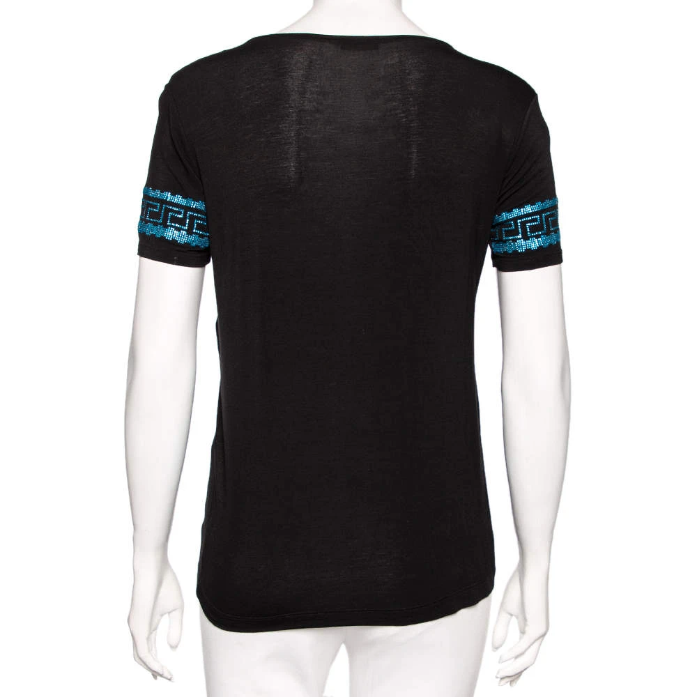 Update your casual collection by adding this T-shirt from Versace. It is made from black stretch knit fabric and features a Medusa embellishment on the front and the sleeves. Pair this T-shirt with jeans and look cool!