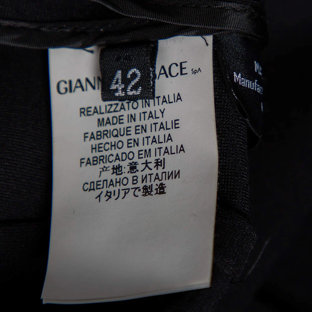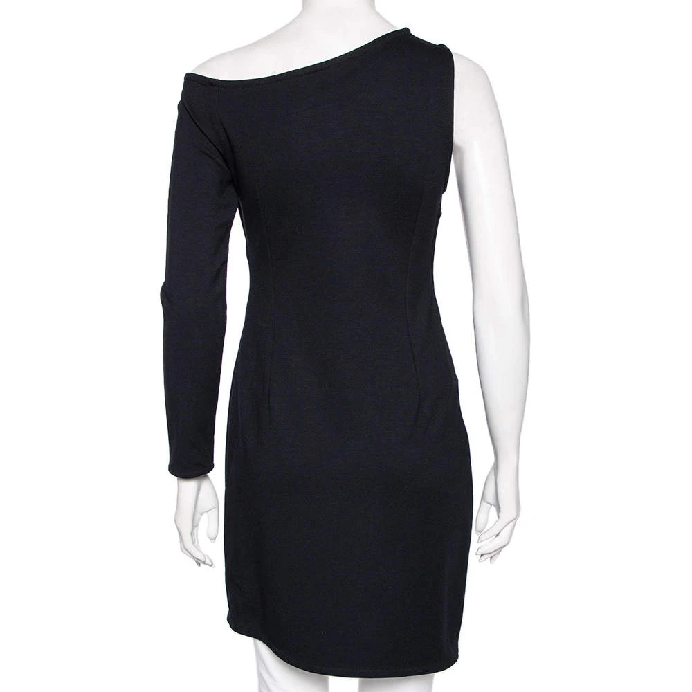 Versace’s black dress is a figure-complementing creation, perfect for evenings and parties. It has an asymmetrical one-sleeve cut and a wide slit that begins when the zipper trim ends.