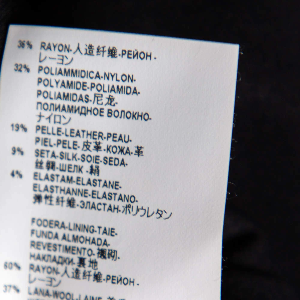 - Composition: Fabric: 36% Rayon , 32% Polyamide, 19% Leather , 9% Silk, 4% Elastane ; Lining: 60% Rayon ,37% Wool , 3% Elastane