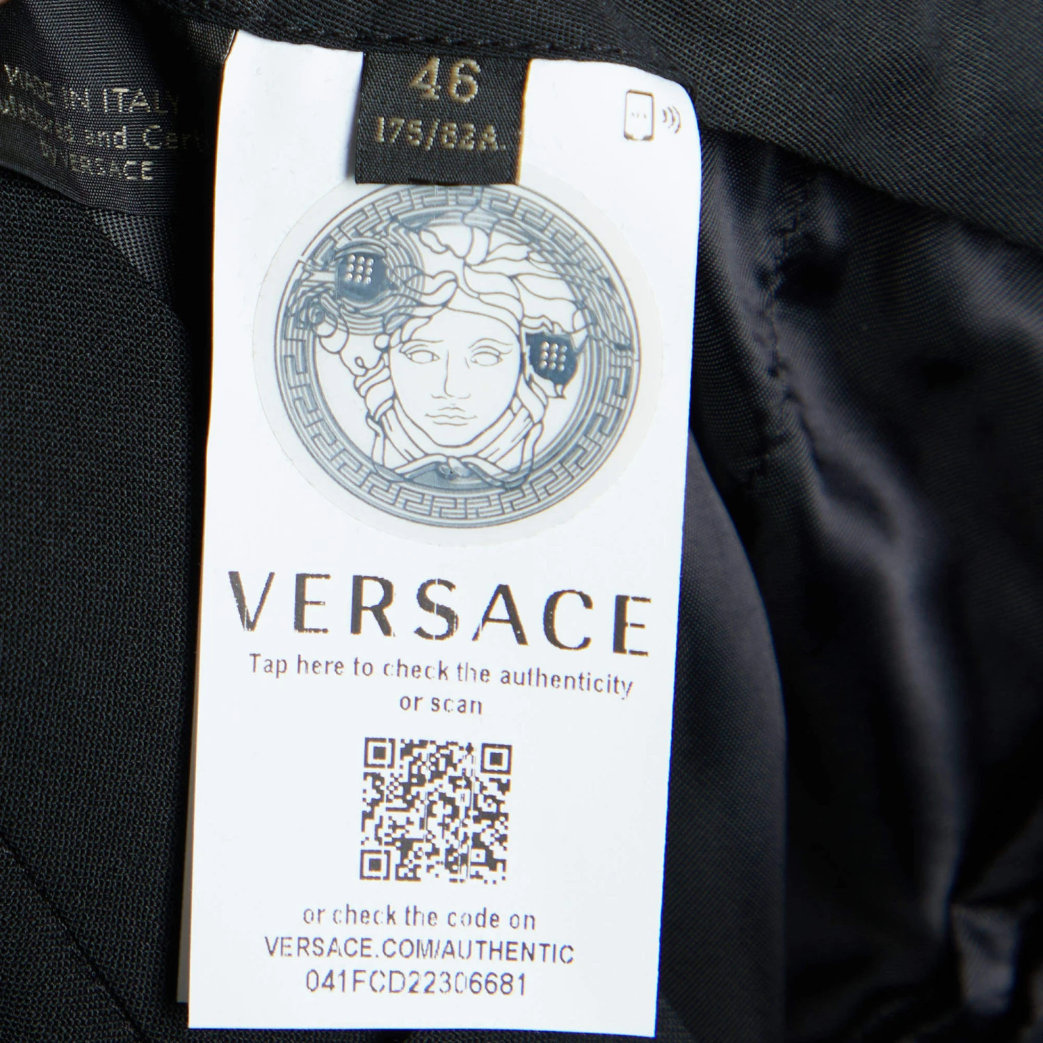 Classy, comfortable, and sartorially smart, these trousers from the House of Versace are definitely closet-essential. Featuring a tailored fit, they are stitched using black stretch wool fabric and are equipped with a zip-type closure and two functional pockets. Flaunt a stylish formal look by wearing these Versace trousers.