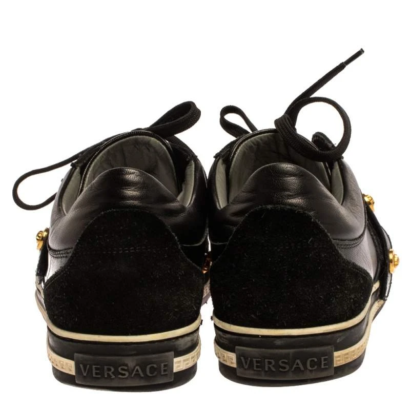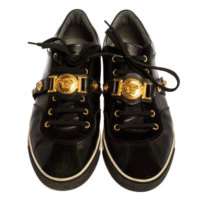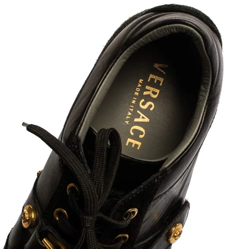 These sneakers are ideal to lend a dramatic twist to your outfits. Crafted from suede and leather, this stylish pair by Versace is a mark of luxury. They feature the signature Medusa motif in gold-tone on the lace-up vamp along with leather insoles, and durable rubber soles.