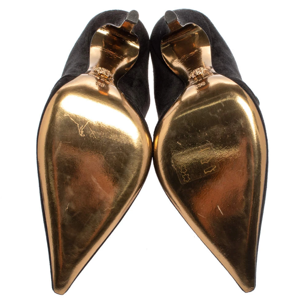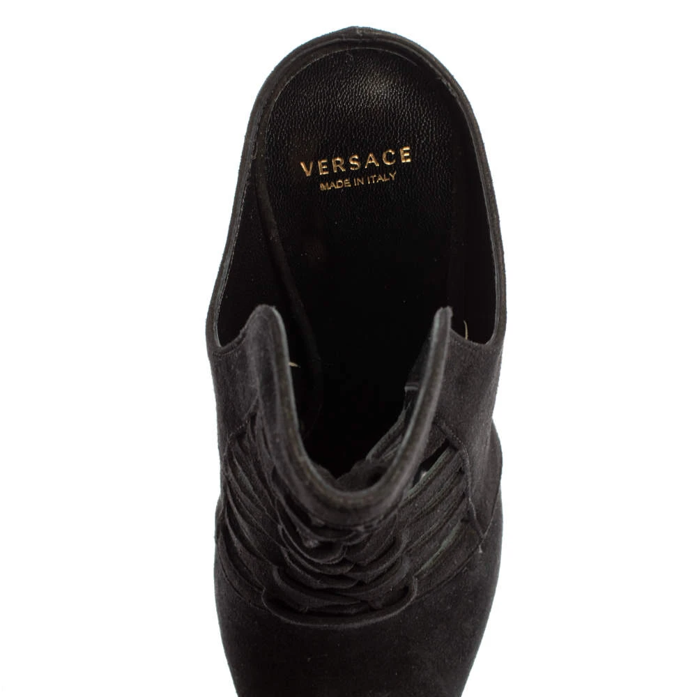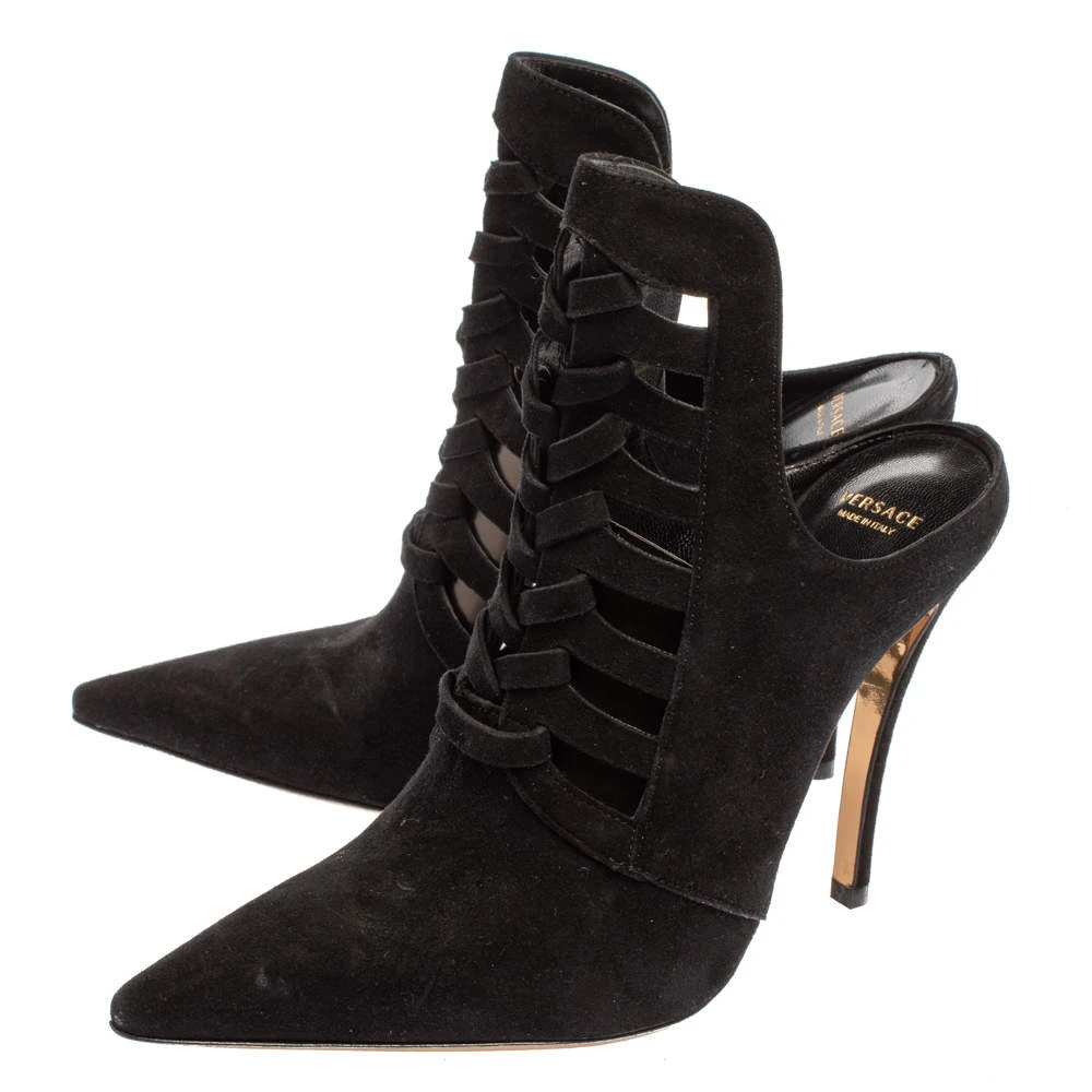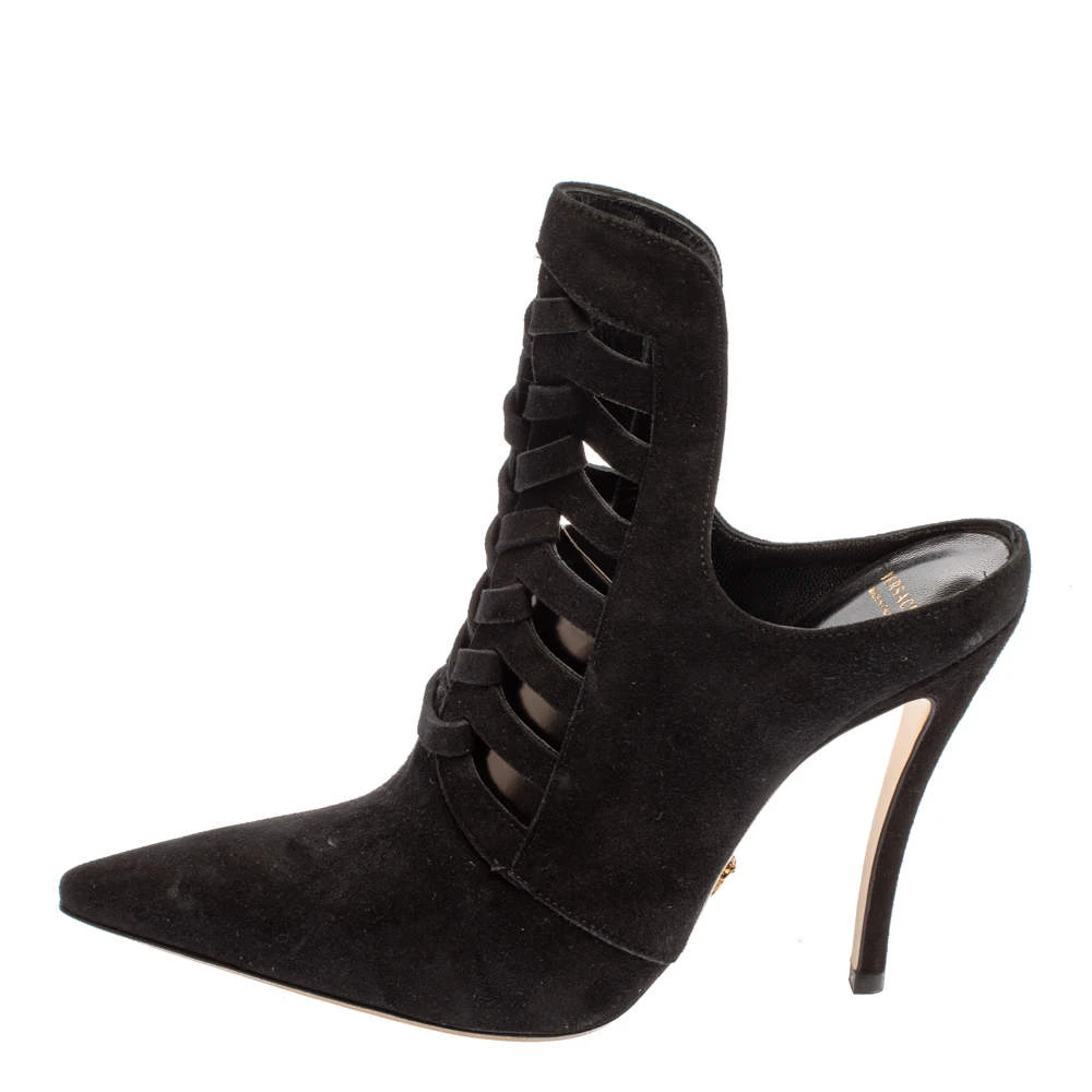 Designed to impart a luxurious appeal, Versace’s mule is for fashionable expeditions. The mule in black suede features a pointed toe, cut-out detailing on the raised vamp, and a slim 11.5 cm heel.
