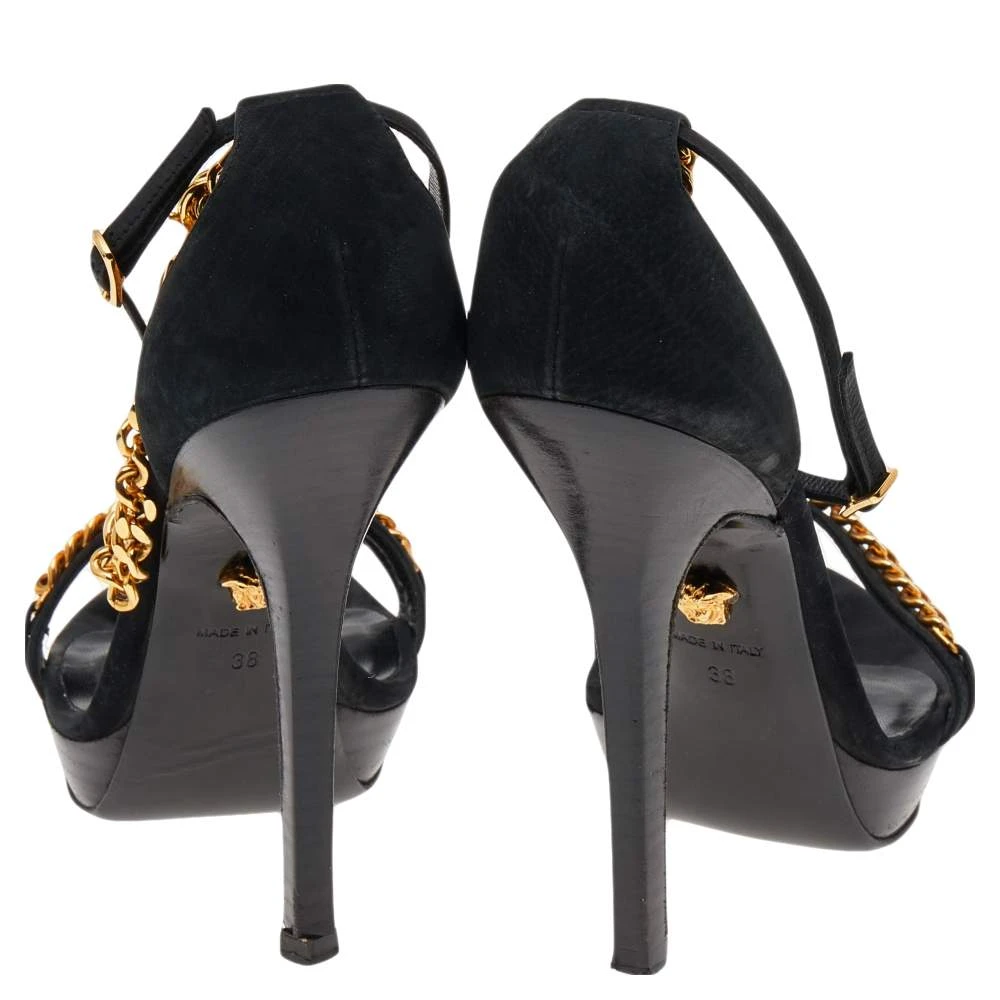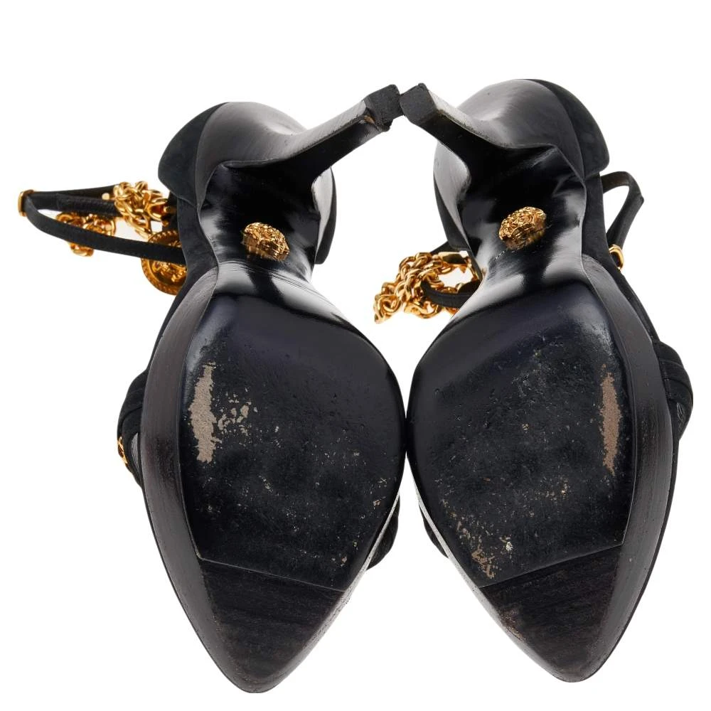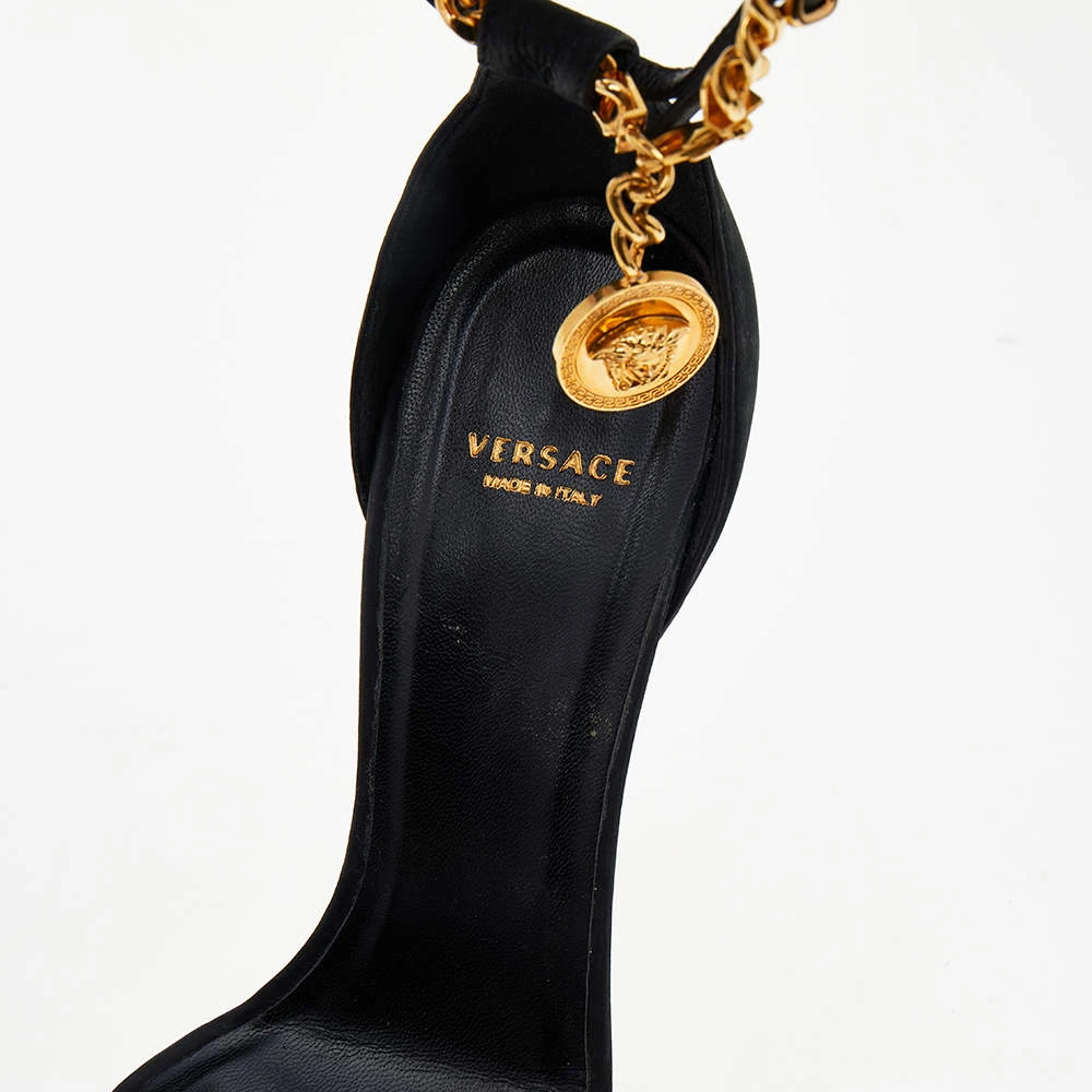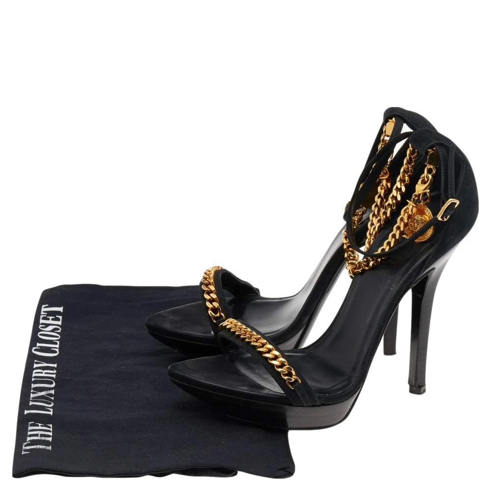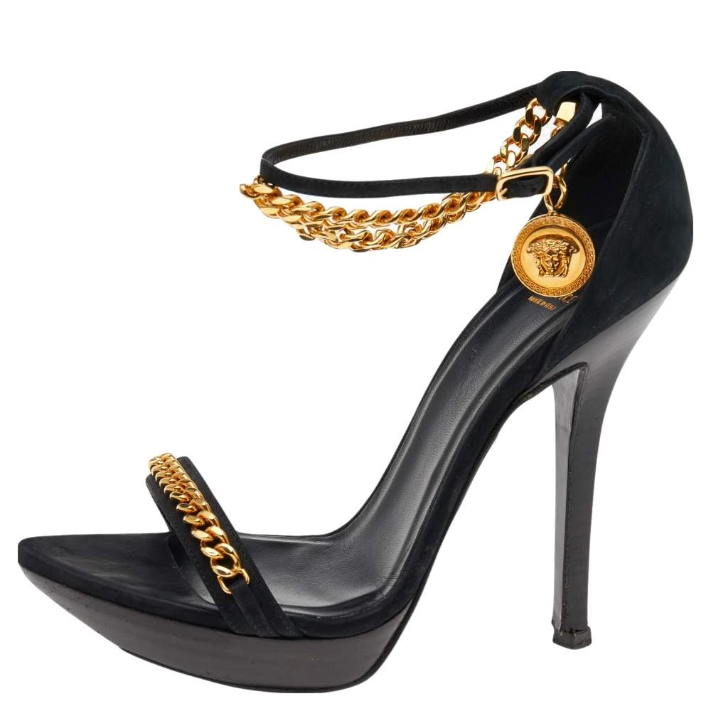 Inspired by the historical and signatory motifs of the House, these sandals from Versace accurately justify the label’s skilled flair and vintage aesthetic. They are crafted from black suede and augmented with gold-toned Medusa motifs and chain details on the upper. They are completed with 13 cm heels.