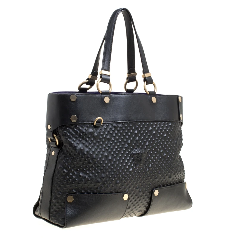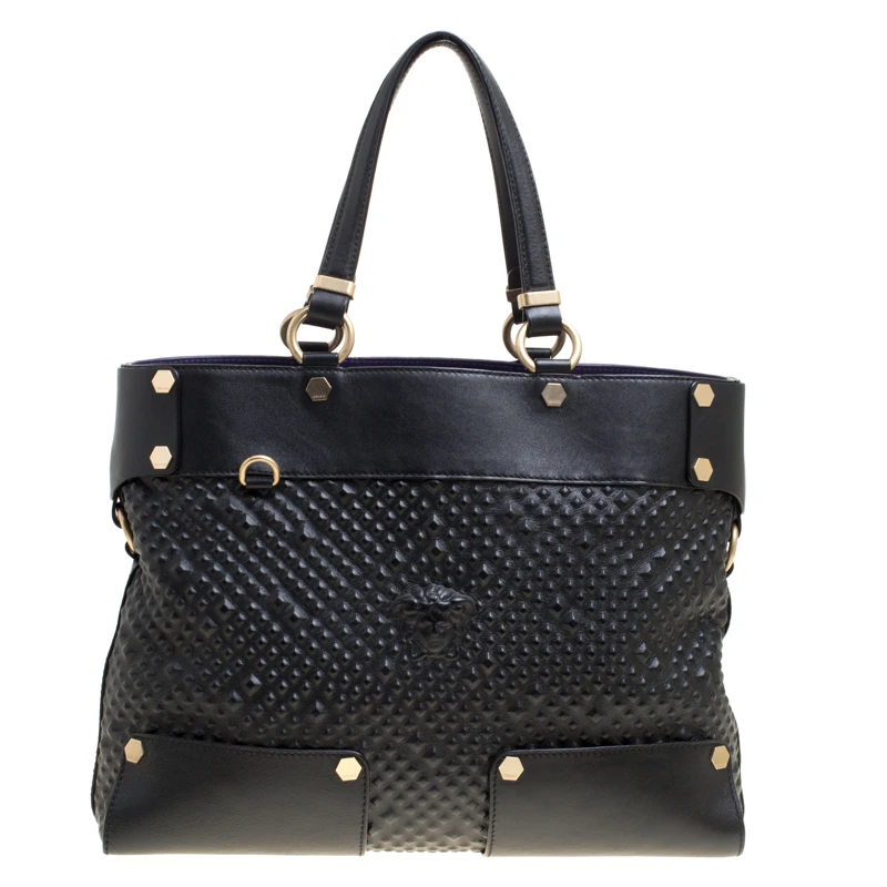 This Medusa tote from Versace is a fabulous piece. The bag comes in a luxurious black exterior made from textured leather and designed with their signature Medusa on the front and a spacious satin interior. It features dual top handles, gold-tone hardware and protective feet at the bottom. High on appeal and effortlessly stylish, this tote deserves to be in your arms.
